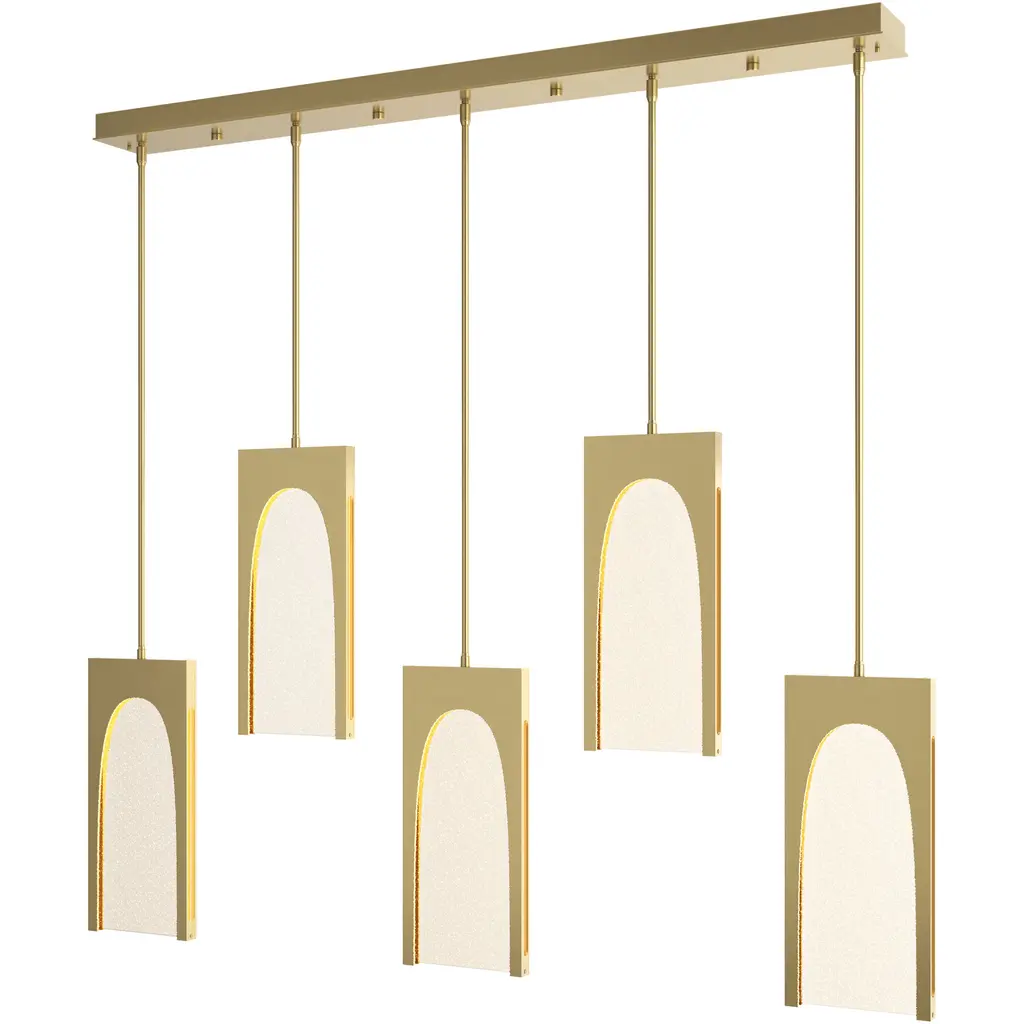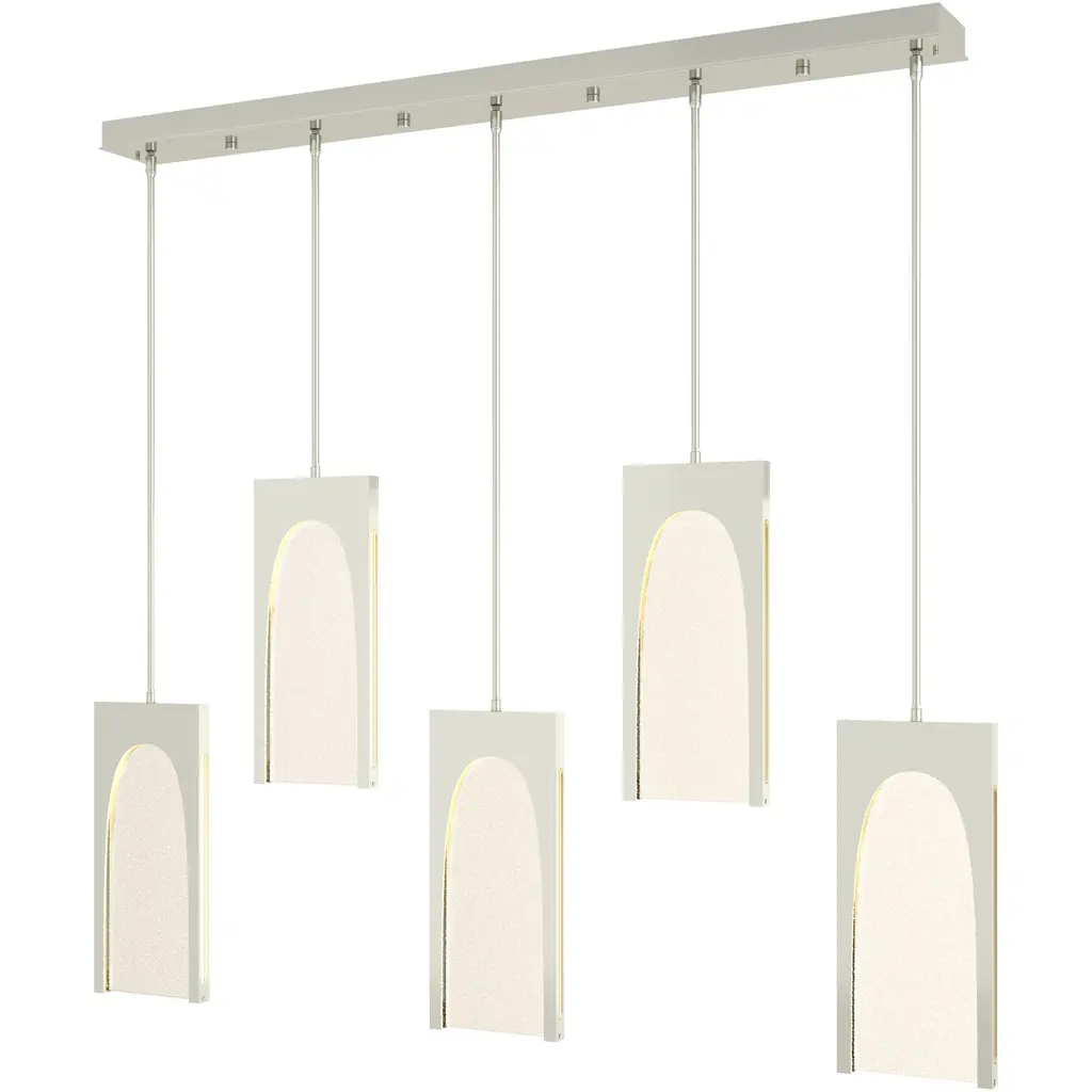 The Cypress 5-Light Pendant combines architectural beauty with versatile design. "With its prominent repeated pattern of elegant arches" Designer Paul Marr Hilliard explains "the Cypress offers a unique aesthetic that can be customized to suit your style." Create a sense of depth like looking down an arched hallway, or a classic look of a linear aqueduct. The unique clear seeded glass varies with no two panels being identical.