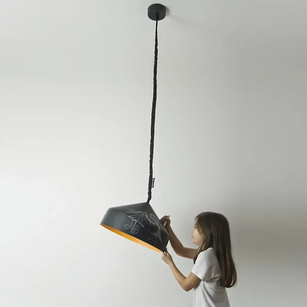 Make light your canvas with the In-Es Art Design Cyrus Lavagna Pendant, a unique down light that allows you to write directly on the shade. The shade is made from designer Ocilunam’s special blend of resin and fiberglass (Nebulite®) but is painted with a blackboard effect so that you can write on the outside with chalk. The fixture is a handy down light with a black nylon cover on the cord, and is equally as stylish with or without your own personal messages.