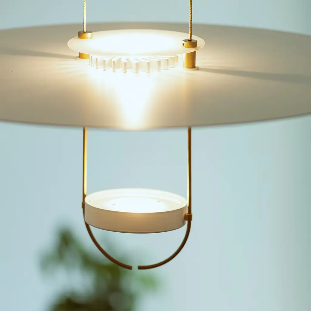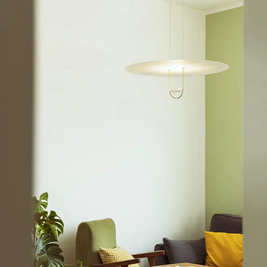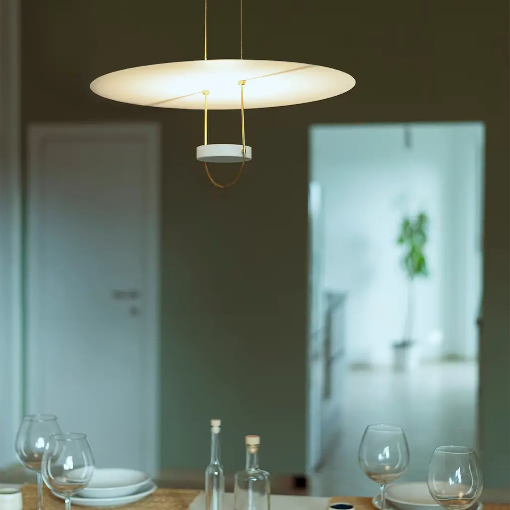 The D03 Pendant is a unique and precious lamp, serving as a striking decorative piece that enhances any space. The main feature is a pure white metal disc suspended by two thin cables. It houses two powerful LEDs, emitting a perfect and uniform light. The ample light output makes it ideal for various spaces, including living rooms, bedrooms, restaurants, and halls. Equipped with 2x LED 2700K CRI 80 (1350lm each), with 3000K available on request.