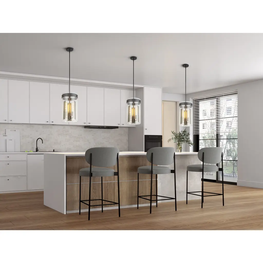 The pendant from the Dahlia collection exudes contemporary elegance with its sleek black metal accents and transparent glass shade, allowing light to shine through in a warm and inviting glow. Designed by Kevin Kraemer, its cylindrical silhouette captures a refined balance between industrial and modern design, highlighted by highly detailed knurl knobs that add a touch of craftsmanship and sophistication. This versatile piece transforms ordinary ceilings into breathtaking focal points, combining artistry and functionality seamlessly.