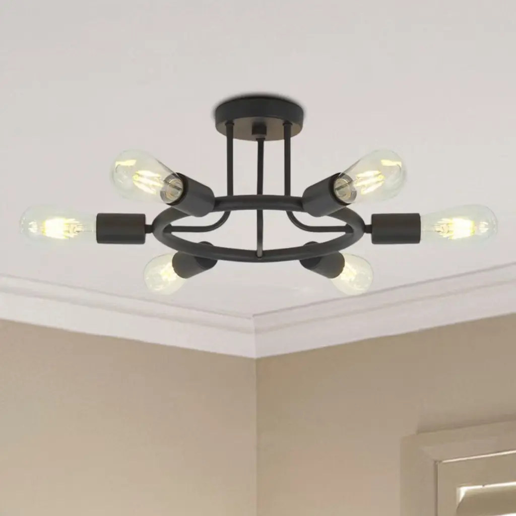 The Crystorama Dakota Semi Flushmount is equal parts rustic, minimalist and industrial. The wrought iron frame highlights a series of exposed bulbs (sold separately), illuminating from horizontally placed sockets around the diameter of the frame. Perfect for the minimalist who still wants to maintain a bit of an edge, this piece will light your space with a rural meets urban statement.