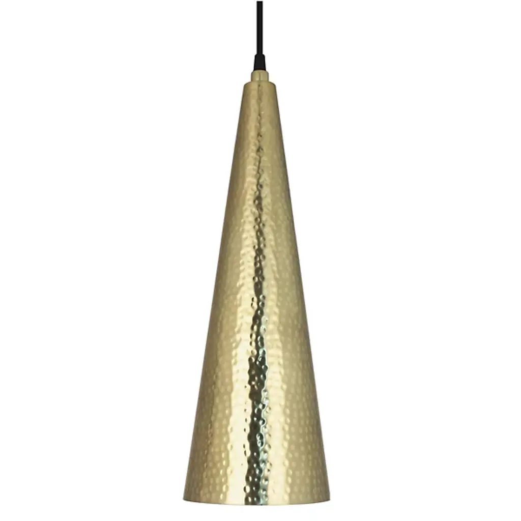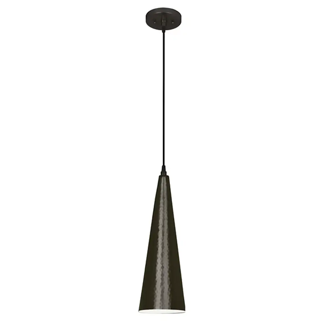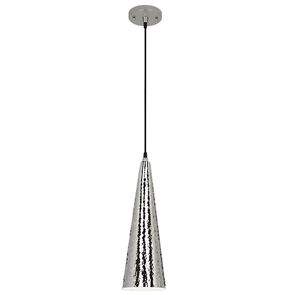 Get lost in the sea of details or the picture-perfect stream of light created by the Dal Mini Pendant from Robert Abbey. The pendant communicates the stylish, refined character of the home. Its slender suspension and tapered shape look natural as part of a series over a table. Crafted in a tall cone, the metal shade focuses the eyes on the intricate notes of the hammered details. These details shimmer with only a brief hint of ambient light. Nestling inside to reduce glare, the lamping beams down a cast light that creates focus in the room.