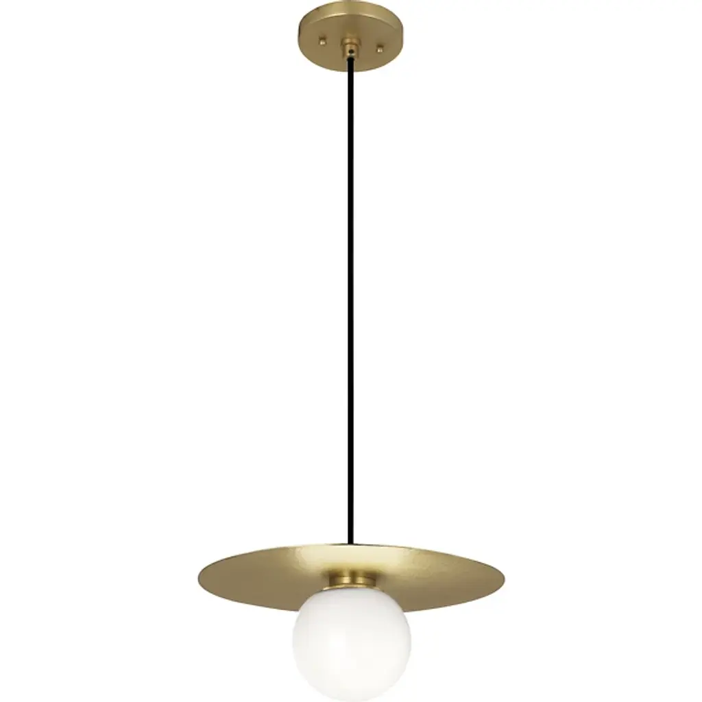 The Dal Pendant from Robert Abbey is a refined piece raining calm light and lively detail over one’s room. It charms with a clean, modern composition. The piece’s compact canopy and cord suspension make it easy to admire as part of a series over a table. Sharing the same finish as the canopy, the metal disc below surprises on a closer inspection with an edge to edge application of hammered details. A glass globe rests on top as if exiting a portal. The bright globe produces a soft down glow free from glare that scatters as highlights on the hammered disc.