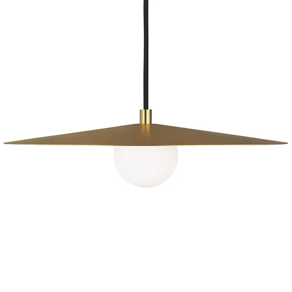 The Dal Pendant from Robert Abbey is a refined piece raining calm light and lively detail over one’s room. It charms with a clean, modern composition. The piece’s compact canopy and cord suspension make it easy to admire as part of a series over a table. Sharing the same finish as the canopy, the metal disc below surprises on a closer inspection with an edge to edge application of hammered details. A glass globe rests on top as if exiting a portal. The bright globe produces a soft down glow free from glare that scatters as highlights on the hammered disc.