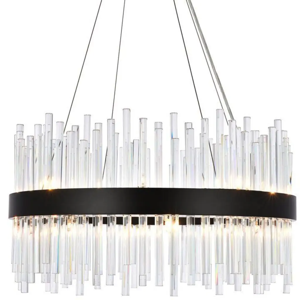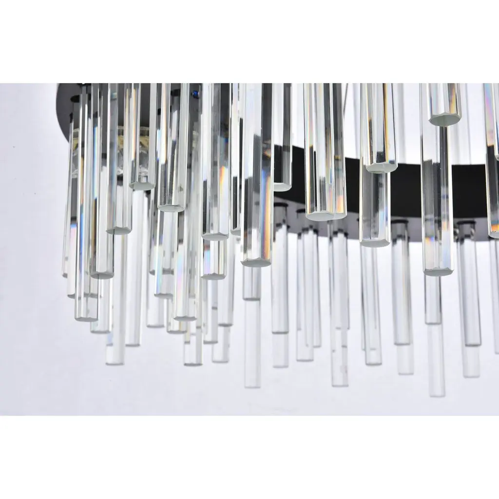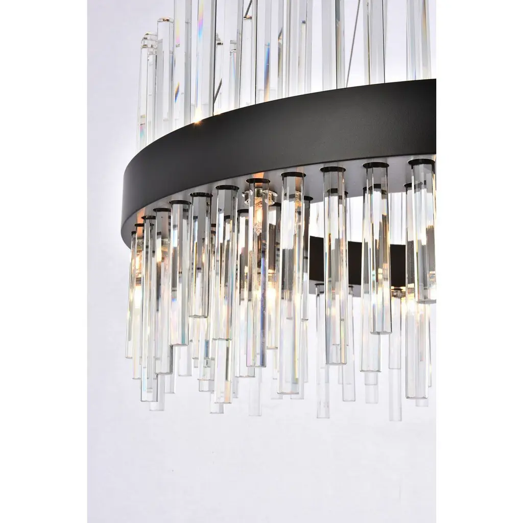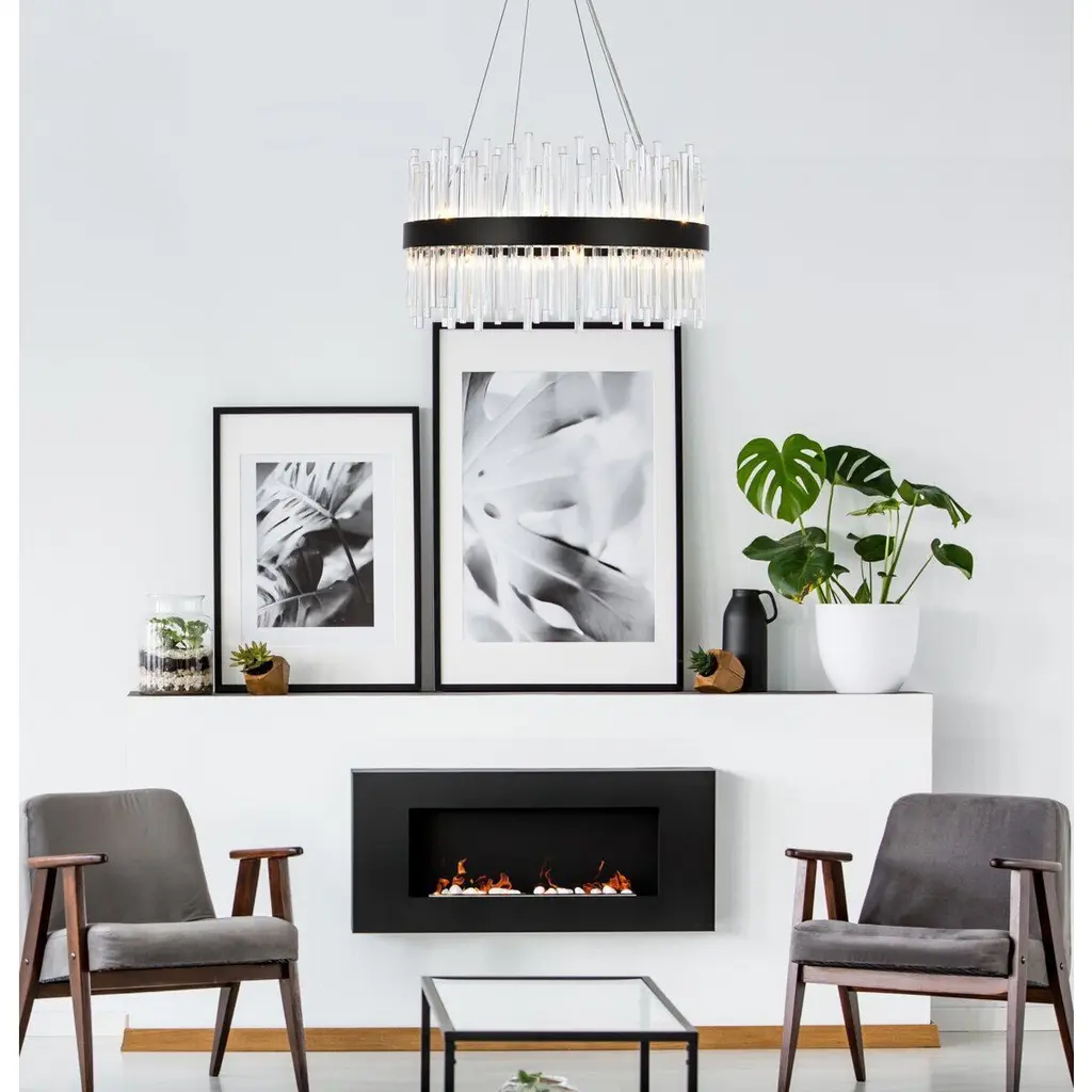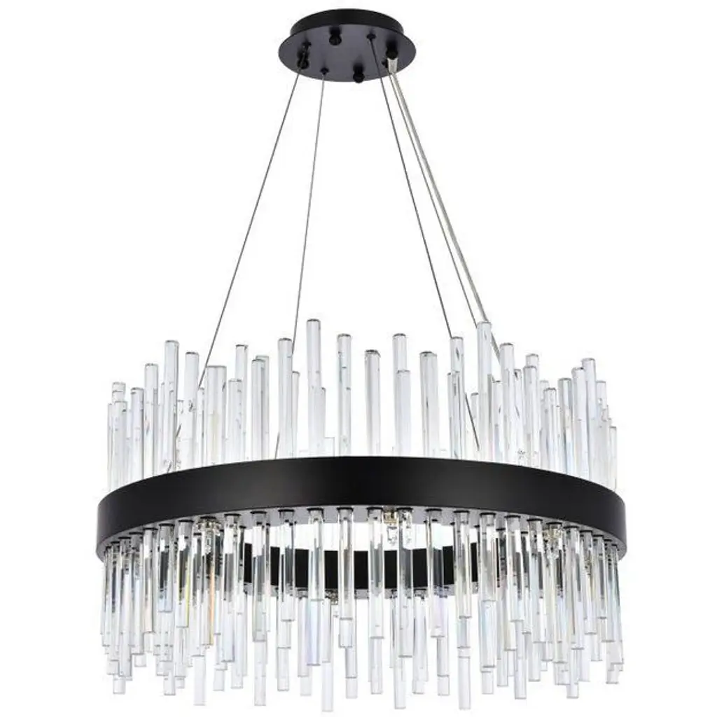 This stately fixture combines timeless elegance with modern and attractive sophistication. The delicate juxtaposition of upright and hanging clear glass rods creates a truly stunning visual statement, seamlessly woven together within a sleek bold metal frame. This expressive piece would be a welcomed and treasured addition to a wide range of modern residential styles.