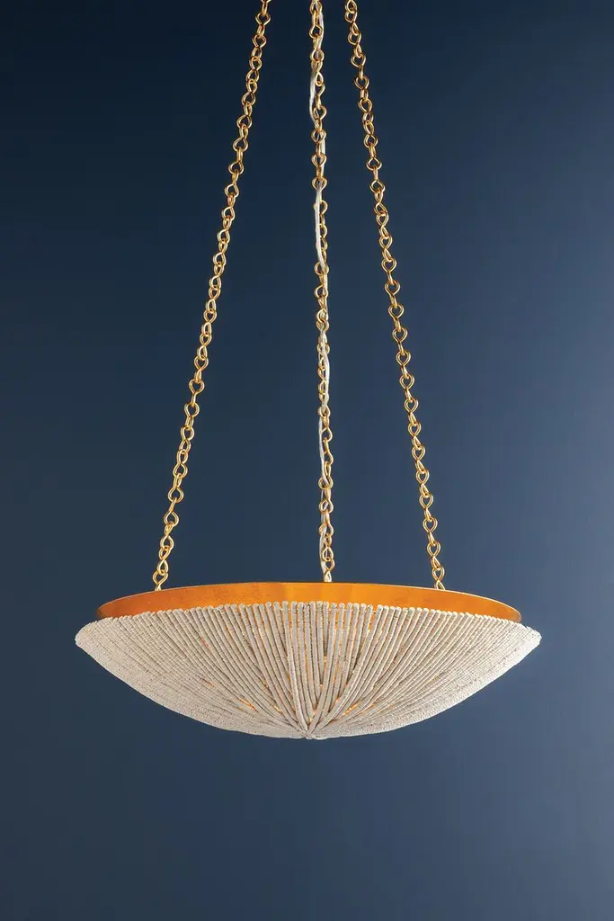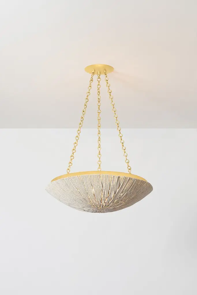 The sophisticated silhouette, ornate details, and mixed materiality of Darion make for a truly majestic pendant light. The beautiful Coco Shell bowl on this fixture has been hand-beaded, creating a rich texture and visual dynamism. Stacked within this bowl, a Vintage Gold Leaf dish reflects light outwards, adding a tasteful material contrast. Available with 4 or 6 lights. *Due to the one-of-a-kind nature of the medium, exact colors and patterns may vary slightly from the image shown.