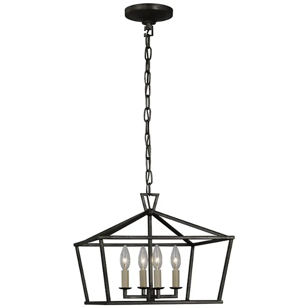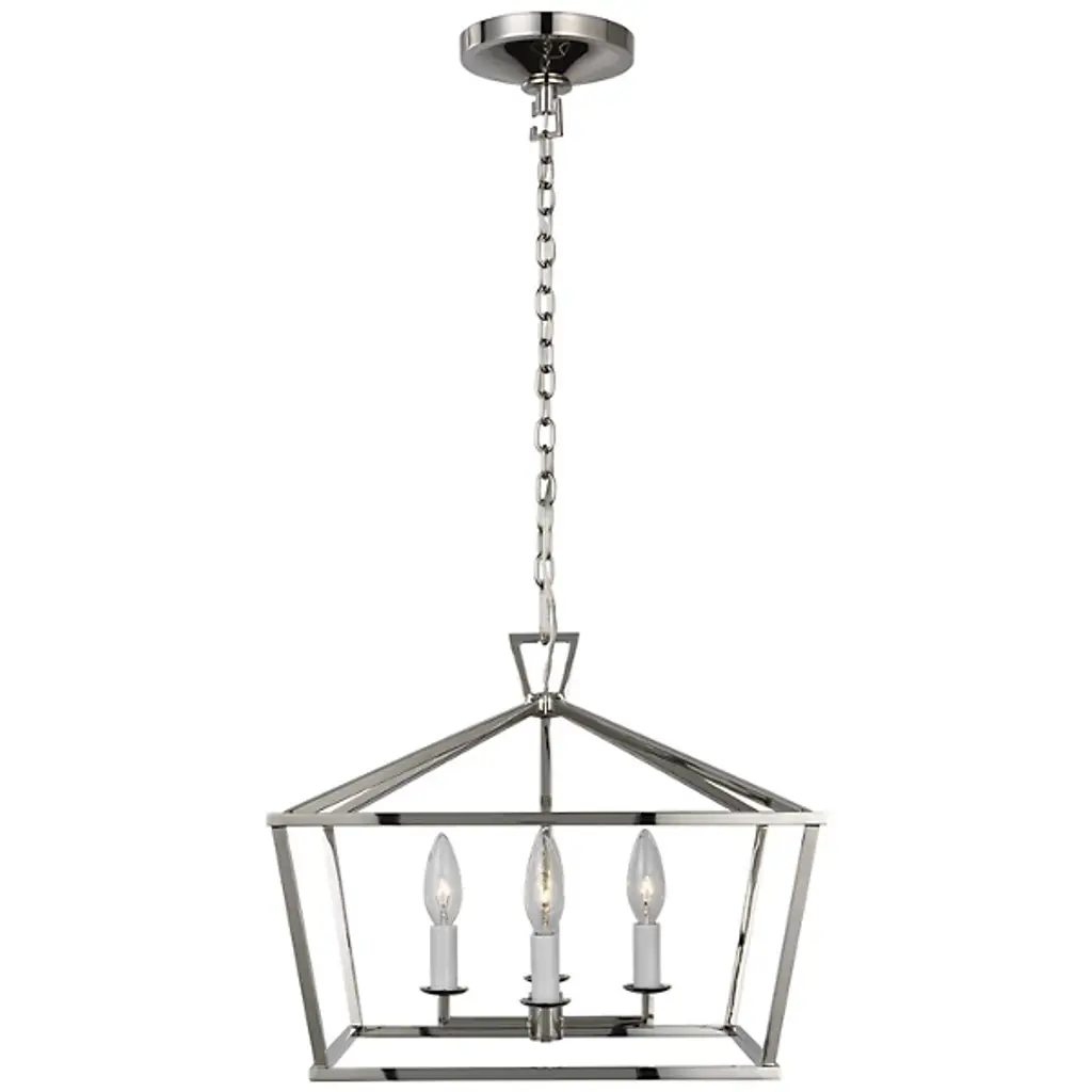 The Darlana Wide Pendant by Visual Comfort Signature, formerly known as Visual Comfort, has an airy, contemporary feel that brings a bright and bold touch to the spaces it is suspended in. Held up by a linked chain and decorative loop from a smooth, round canopy, an openly formed metal frame surrounds a visible collection of candelabras. The tapered top and rectangular body allow plenty of light to escape in all directions and give this design a clean, classic feel as the candelabras within are held on simple candle plates, lending a thoughtful touch to this piece.