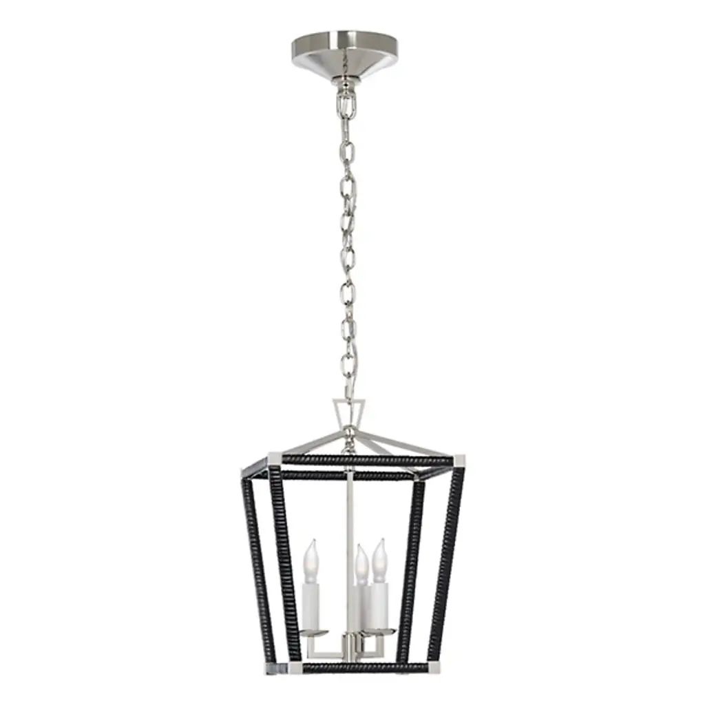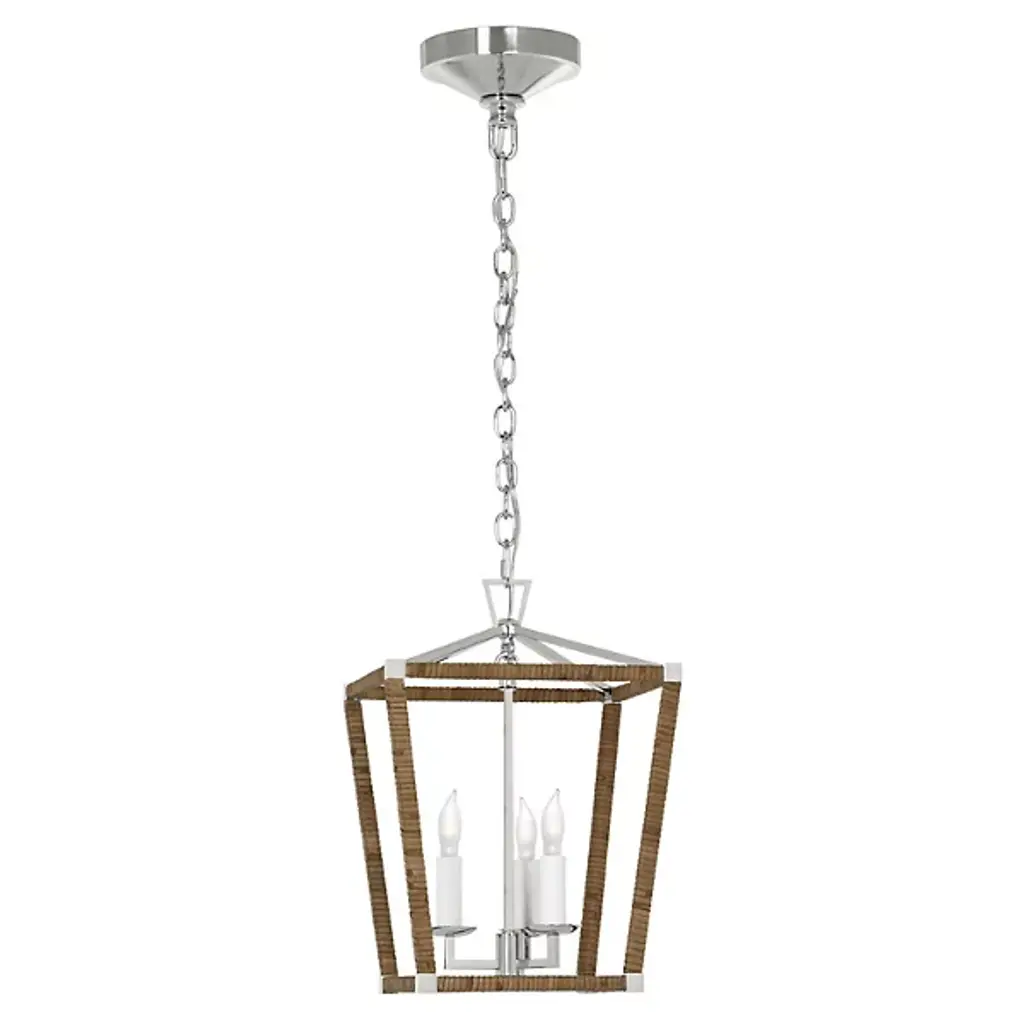 The Darlana Wrapped Mini Lantern Pendant from Visual Comfort Signature melds with various home styles as an intricately crafted transitional design. This light fixture is designed by Chapman & Myers. The pendant's geometric frame boasts a tapered crown like traditional flame-lit luminaires. Artisans wrap the frame with a texture-rich rattan rope. Standing atop modern bobeches is a collection of candle-style holders. Candelabra lamps produce a delightful silhouette and warm radiance.