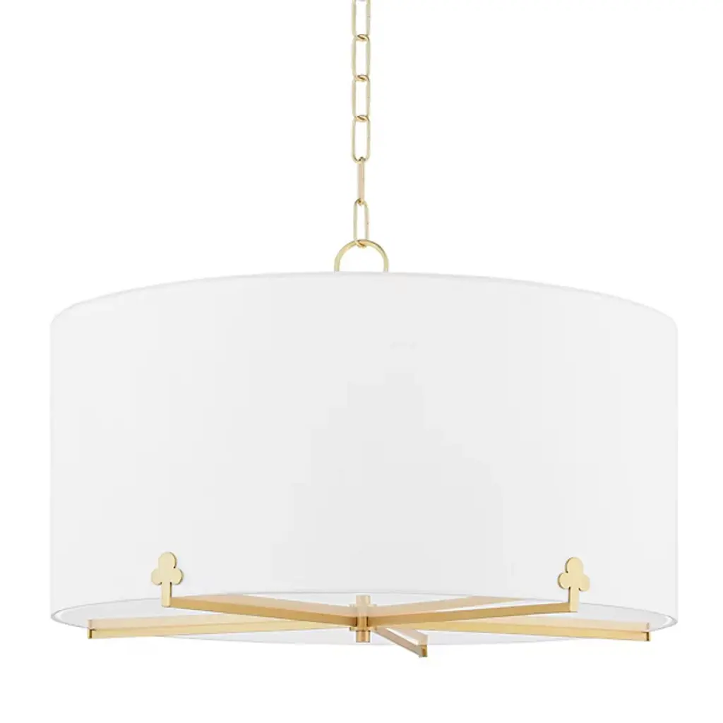 An elegant design fit for a grand palace or your refined home. The Darlene Drum Pendant from Mitzi crowns your room with a pleasant glow and a classic fleur-de-lis silhouette. It's a statement-making piece, suited for a foyer, dining room, or living room. It makes an entrance with a fine-chain link suspension. Looking up, the eyes get lost in the radiating lines of the slim metal frame. The eyes are rewarded with short and charming floral accents. A Belgian linen drum shade is the chandelier's true stamp of elegance; it filters light through to leave you with a soft, filling glow.