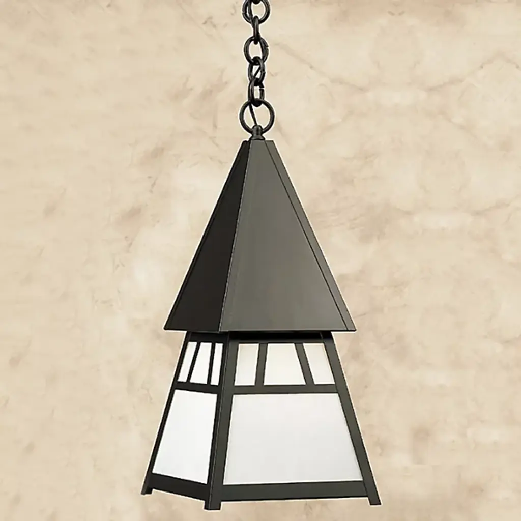 Shaped like a capped pyramid, the Arroyo Craftsman Dartmouth Outdoor Pendant provides a handsome, unique accent to Craftsman-styled porches and patios. Its brass construction and organic finish options insure a lovely patina over time, making this a beautiful Arts and Crafts fixture whether turned on or off.