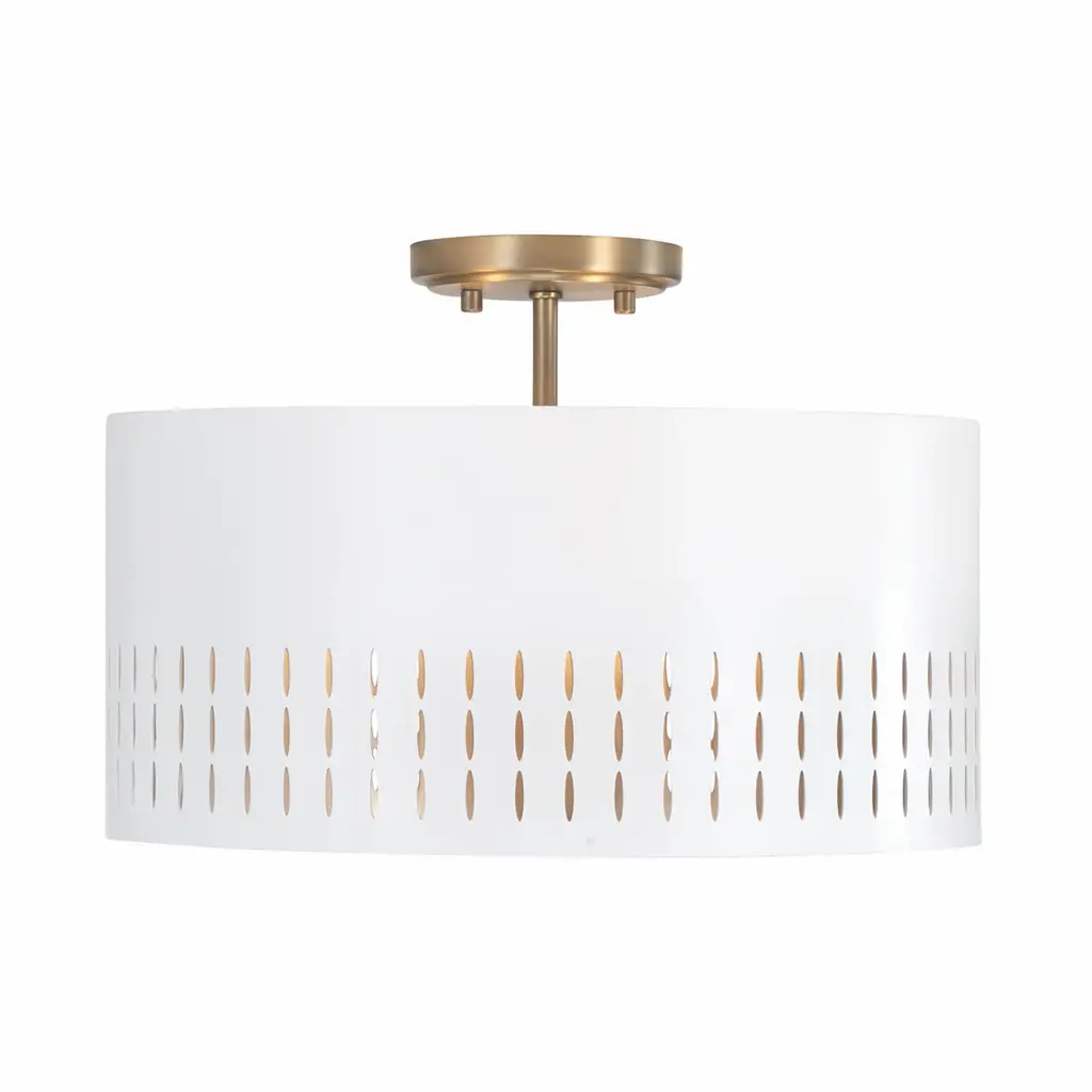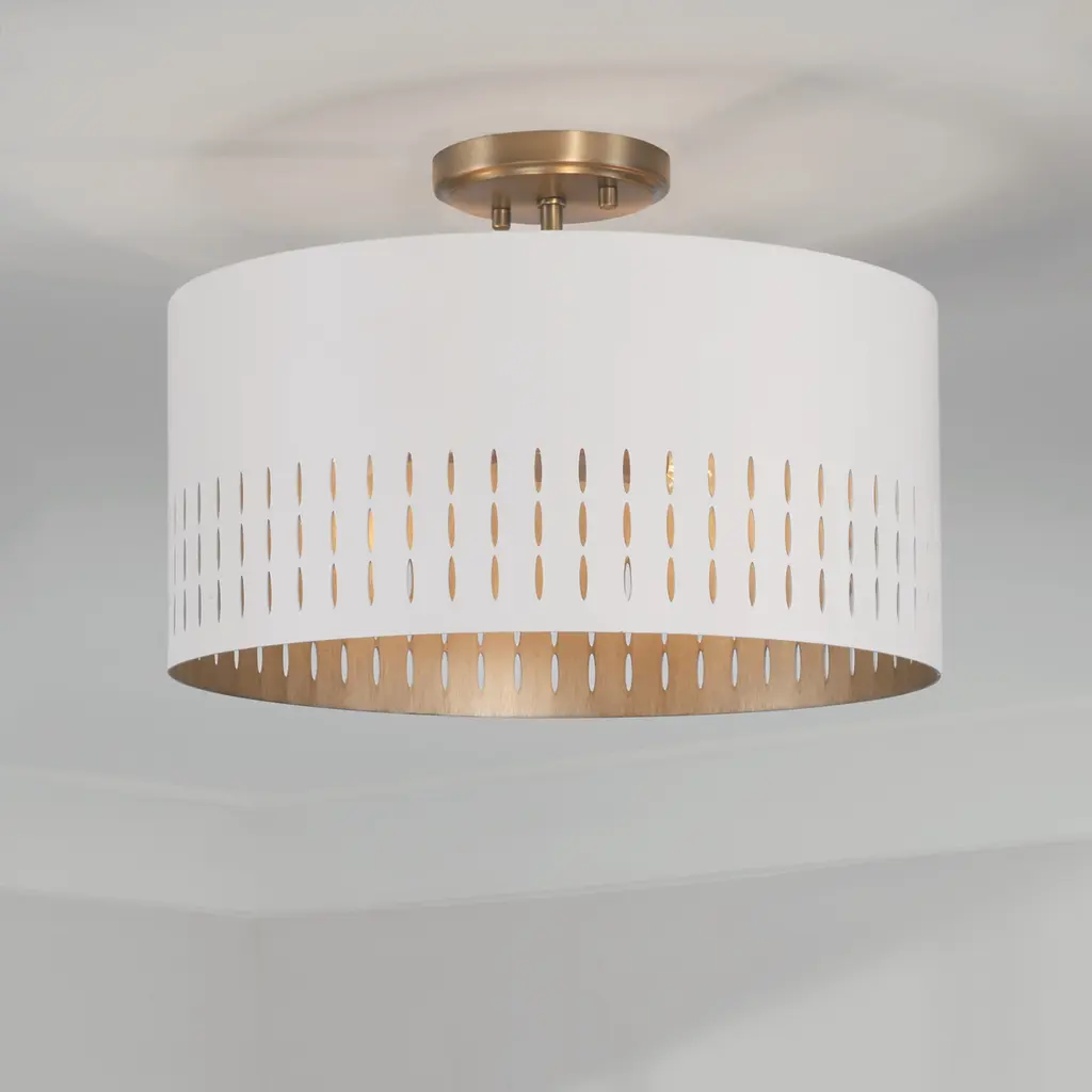 Mid-century style meets modern metal in the Dash collection Dual Mount. Whether hung as a semi-flush or pendant, the striking cut-outs create character against the smooth White finish. The Painted Aged Brass finish on the interior of the metal shades paints a warm backdrop, adding dimension for standout style. Finish: Aged Brass & Soft White Smooth to touch, the combination finish of a warm, honey-gold aged brass and a neutral, soft white creates a sophisticated look. The scouring technique used on the Aged Brass brings a brushed visual texture and compliments the crisp White tone. Applications: Convertible Dual Mount. Metal shade with painted aged brass interior emits a warm glow and the intricate cutouts create illuminating character. Bulbs: Designed to be dimmable and LED/CFL/Incandescent bulb compatible, this fixture uses three (3) 60 Watt (max) E12 Candelabra base bulbs (Not Included). Reliable: Rated for dry locations; Includes a 1-Year Manufacturer Warranty. Adjustable Height: Includes one (1) 6" rod, one (1) 12" rod, and one (1) 18" rod. Fixture Dimensions: Semi-Flush: 8.5 inches high x 16.75 inch diameter. Pendant: 9.5 inches high x 15.5 inch diameter. (Max Hanging height of 60.5 inches). Capital Lighting is a family owned business just outside Atlanta, Georgia. We pride ourselves by delivering high quality products at affordable pricing. Beginning with design concepts from popular home fashions, we transform our ideas into lighting fixtures that blend timeless beauty with today's styling. From casting and forging to the hand painted finishes and fine details we strive to make our products the finest in the industry.