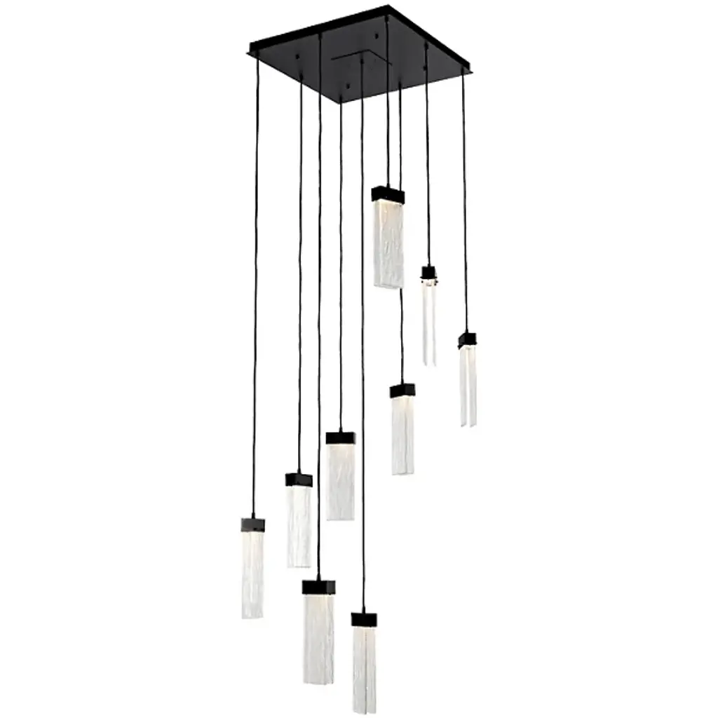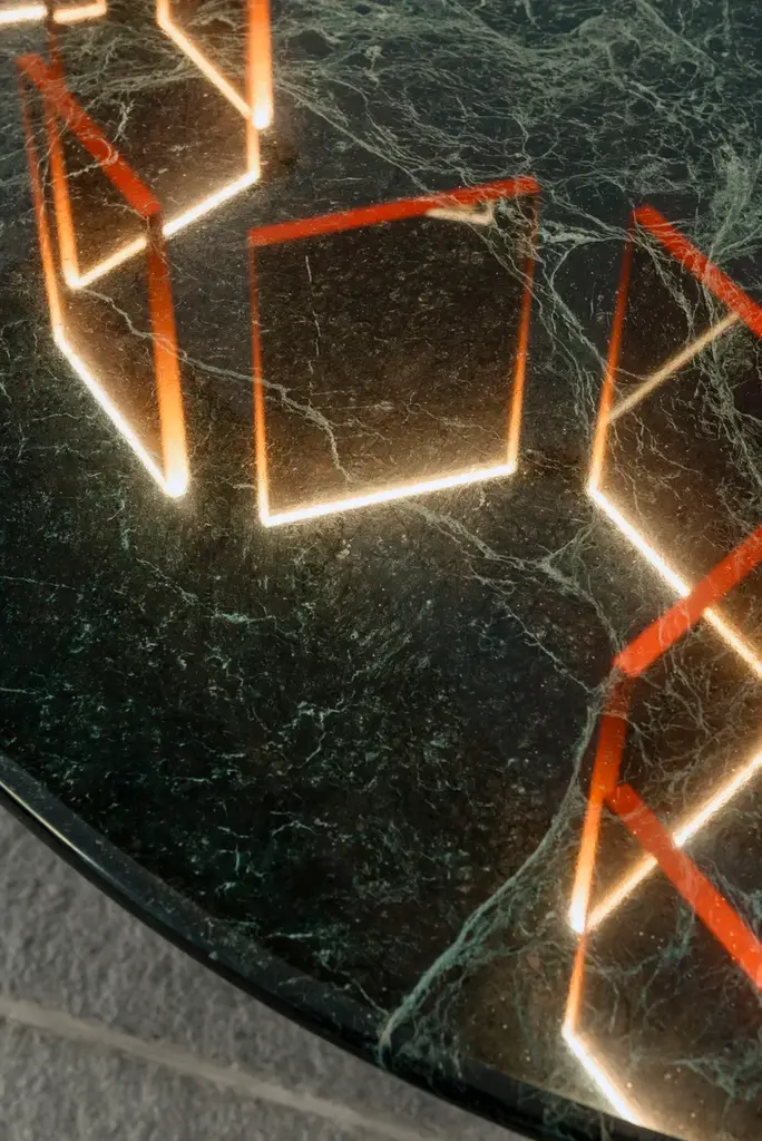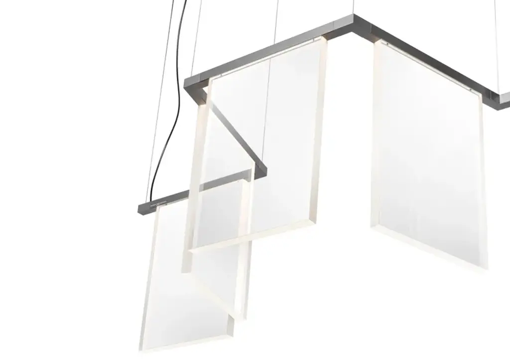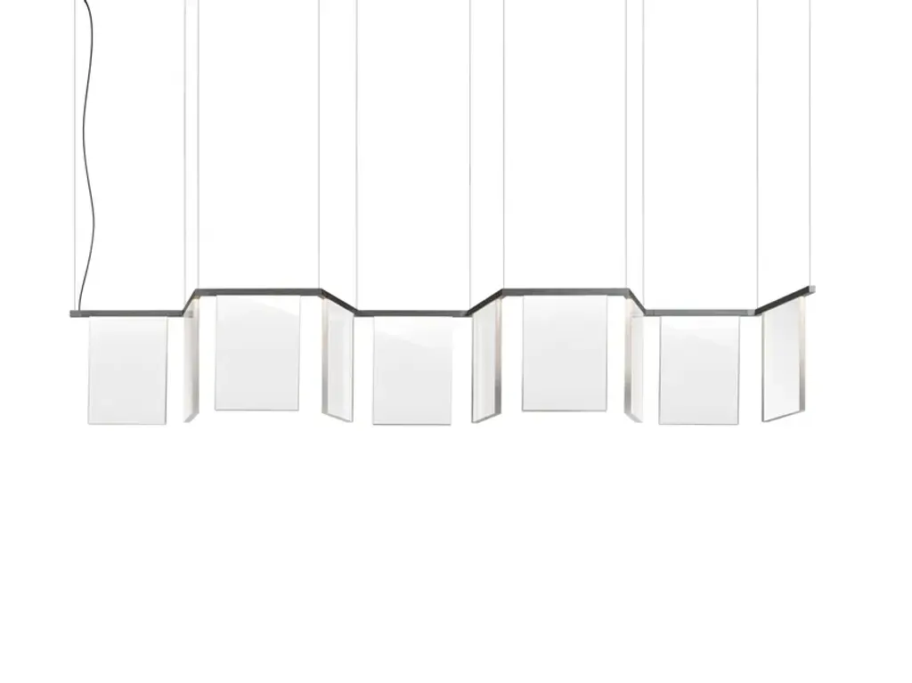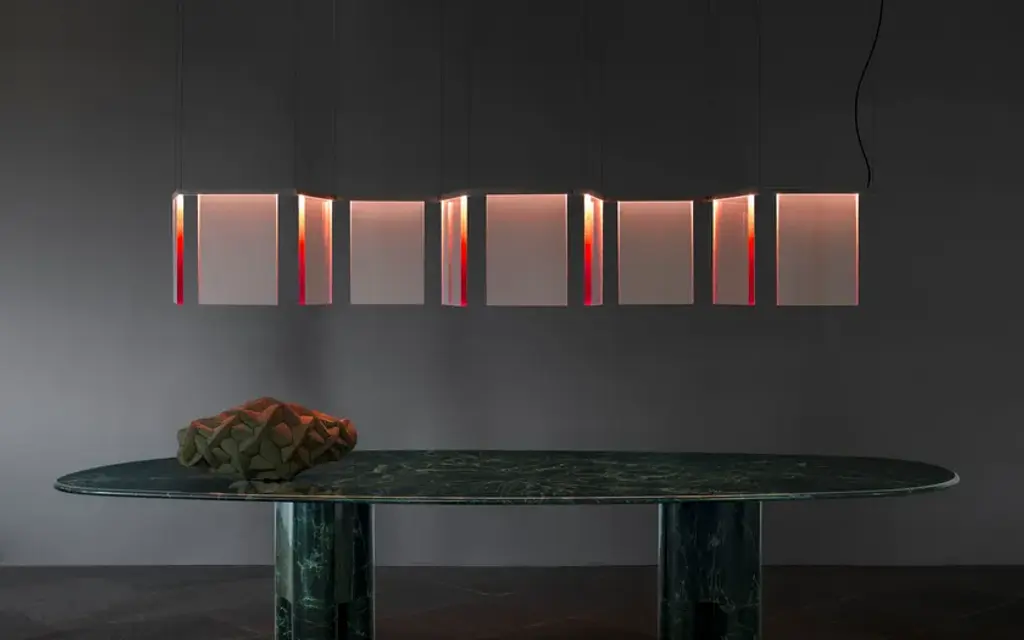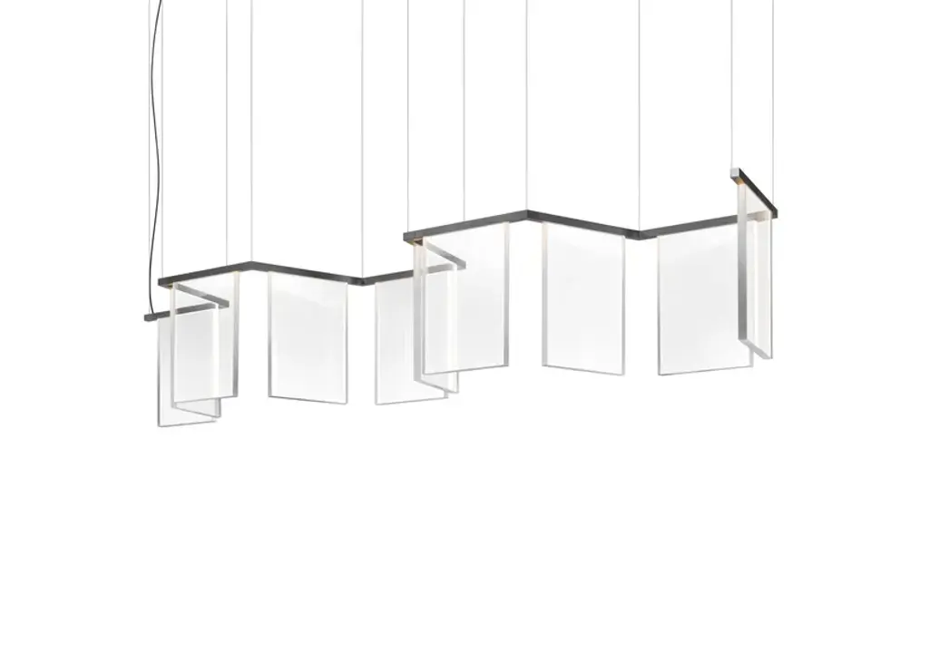 DASH is a pendant lamp made of textures and geometries.Thick, smoke-colored acrylic panels, illuminated along the upper edge, are suspended from a tubular structure that zigzags along its path.The light is filtered through the material, creating a geometric effect of diffused light.With a minimal structure, the light is maximized through the acrylic panels, creating a soft, transparent, and warm glow, with a sharper white light on the surfaces below.