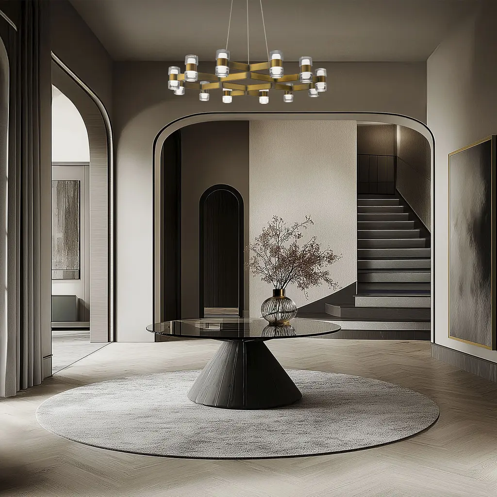 Twelve crystal rods, paired in twos and held by figure-eight brackets, move like dancers weaving in and out to form a graceful circular pattern. The brilliant Dashe pendant sparkles from crystal shards catch the light with every turn, while the sculptural metal adds an industrial edge, creating a harmonious blend of elegance and modern design. This 36-inch LED luminaire casts a warm 3000K illumination and is available in aged brass or black finishes.