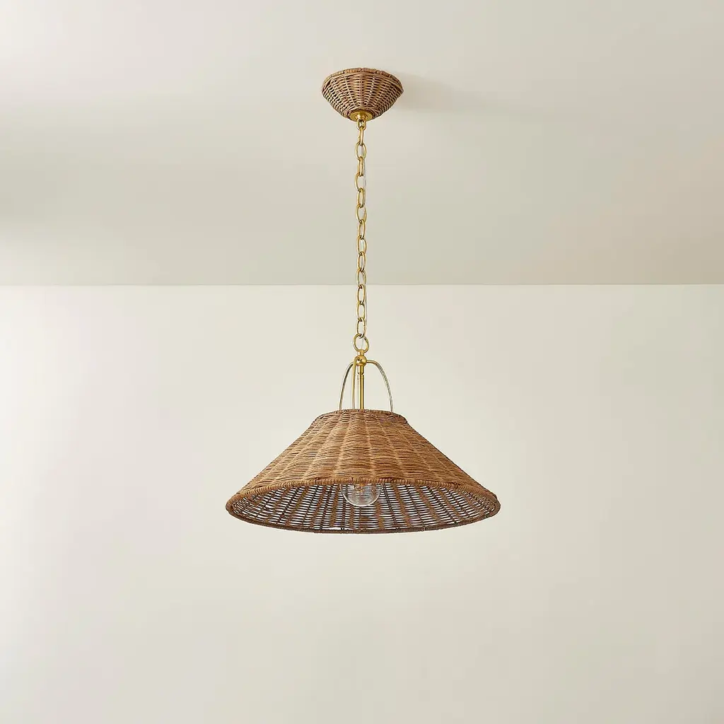 The Davida pendant takes a heritage silhouette and gives it an update with contemporary materiality. Woven from Natural Rattan, the shade and canopy bring an earthy, yet sophisticated feel to a space. The unique metalwork details are finished in a timeless Aged Brass finish. Part of our Zoe Feldman collection, Davida is available in two sizes. *Due to the one-of-a-kind nature of the medium, exact colors and patterns may vary slightly from the image shown.