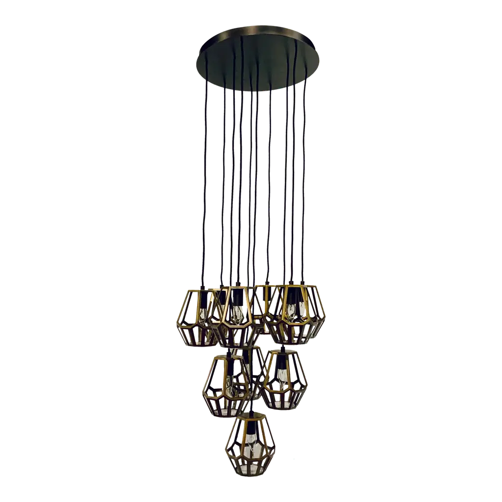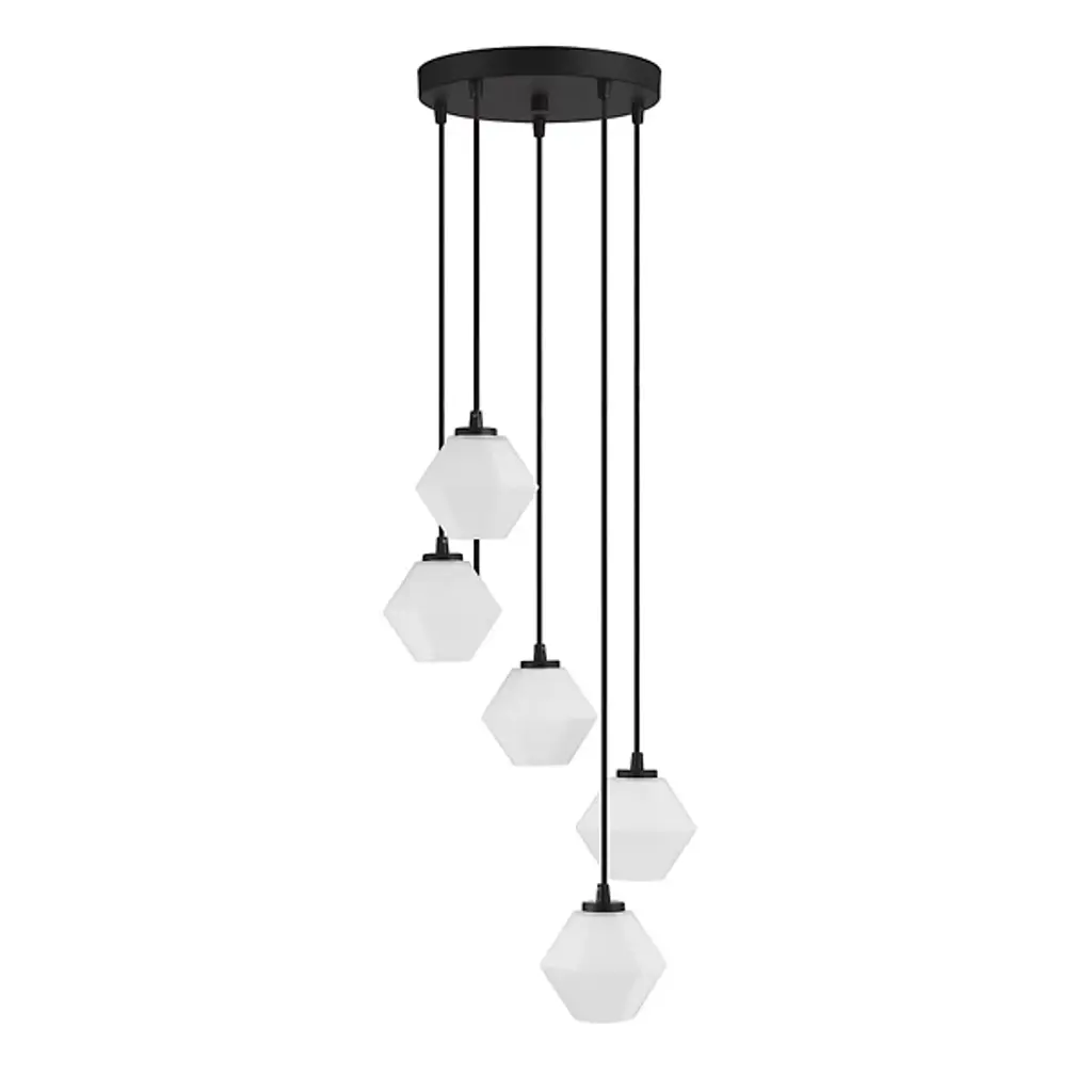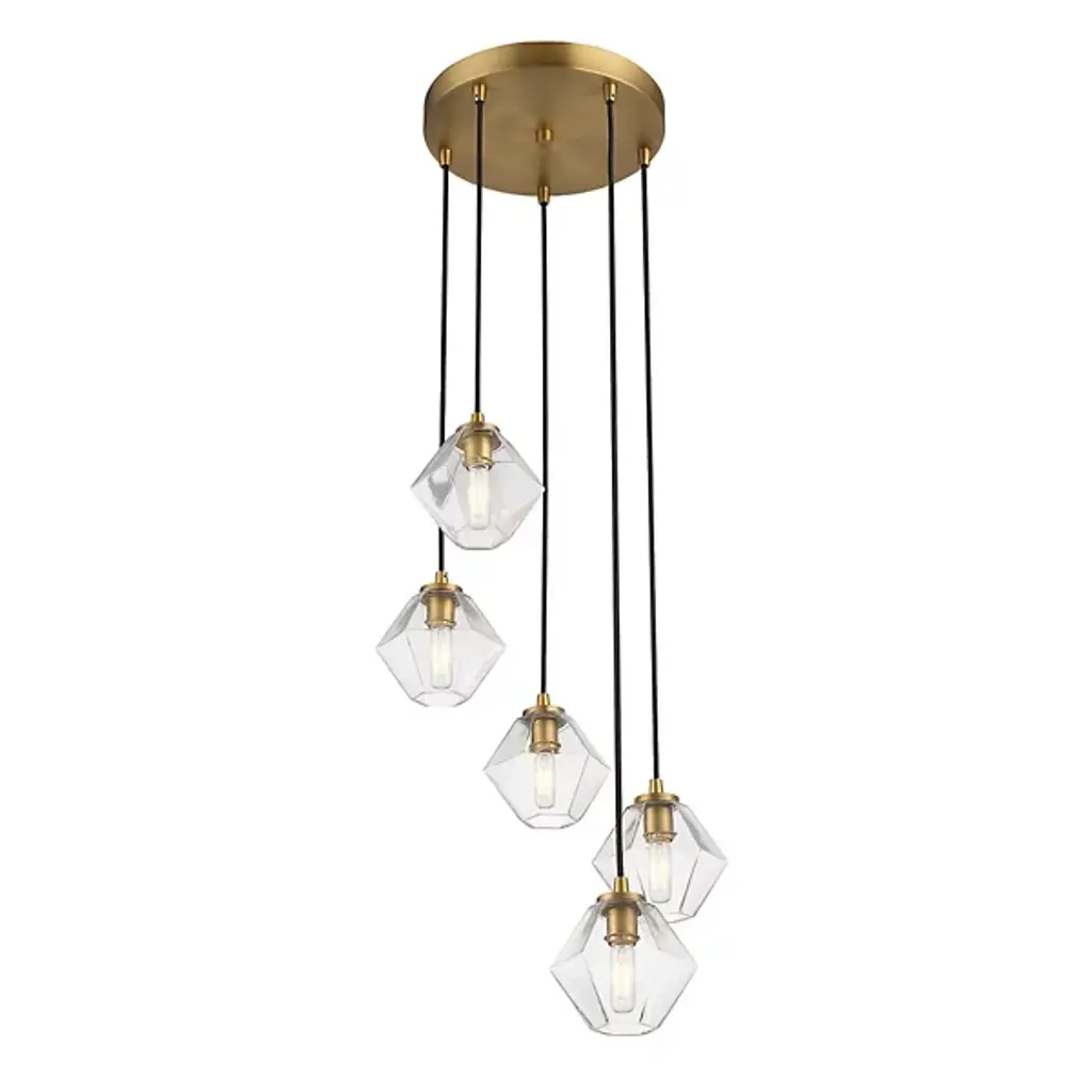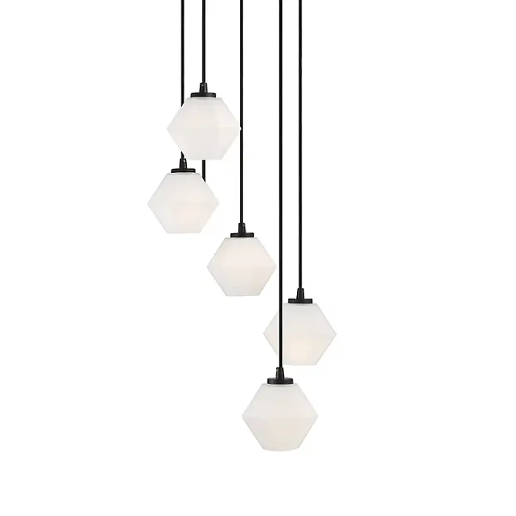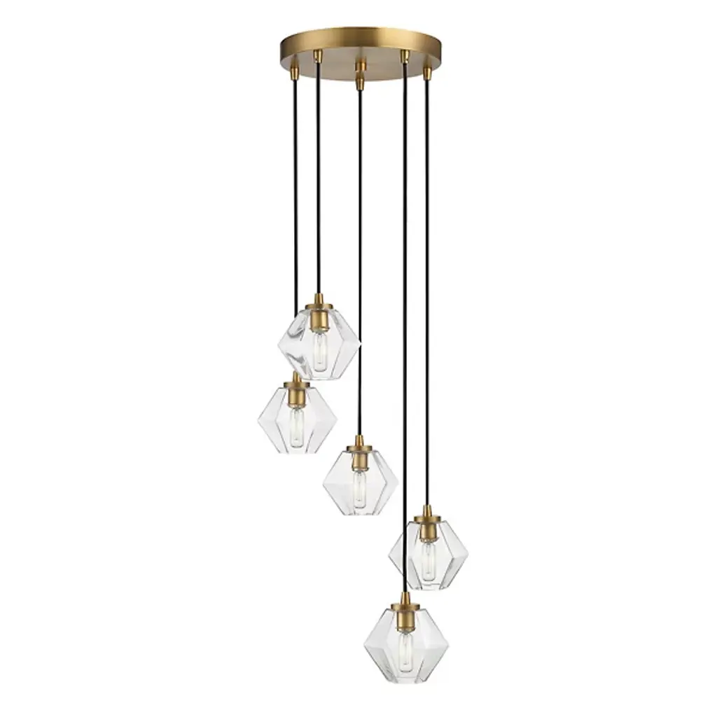 The Dawn Multi Light Pendant by Alder & Ore brings a cool and contemporary collection of light to your spaces. Simply suspended by cords from a round canopy, an array of geometrically shaped glass shades fitted with metal tops make a statement as they each filter and shape a mix of downward cast light and ambient illumination onto surroundings. With a lovely tiered composition, this piece brings an artful and bright touch to rooms.