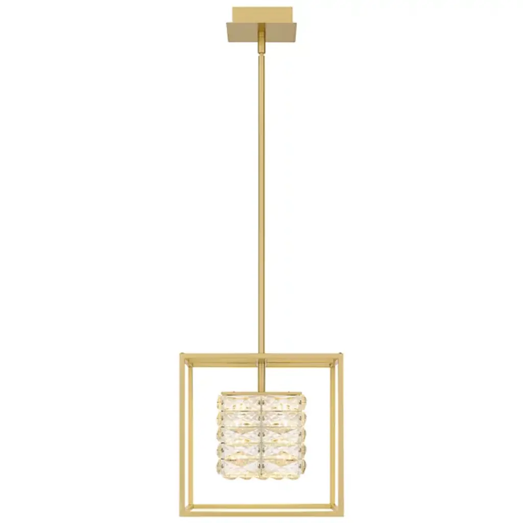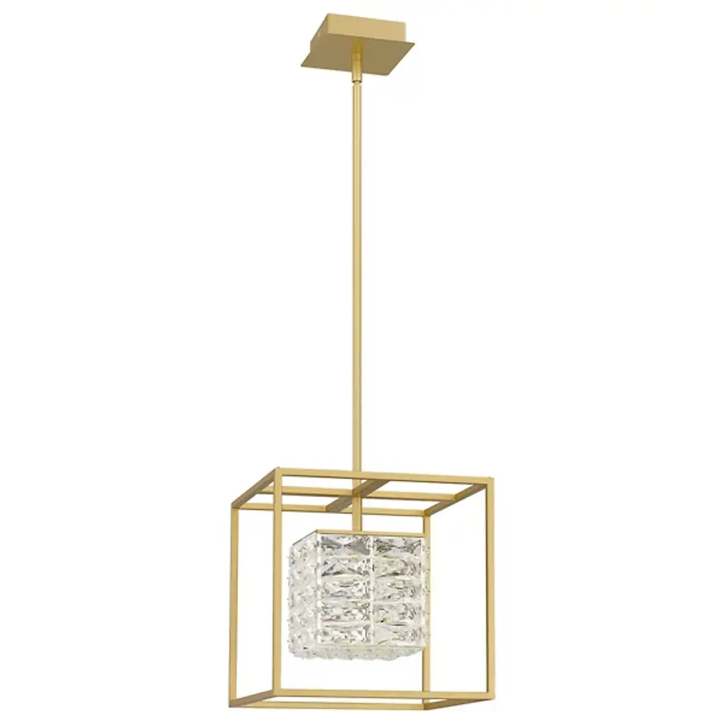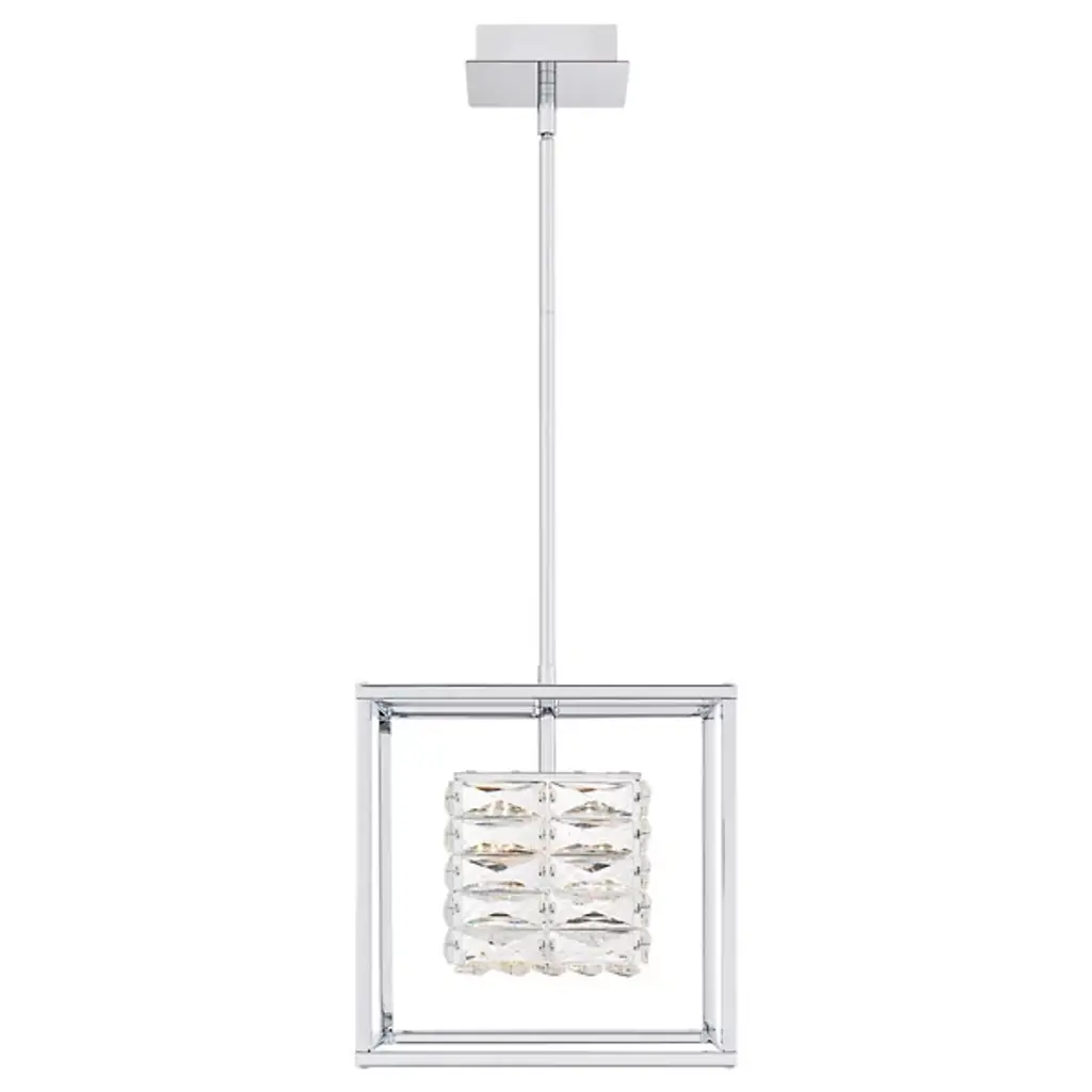 The Dazzle LED Pendant by Quoizel is a bold and sophisticated blend of metal and crystal. Descending from a single down rod, an openly styled square frame surrounds a cubed arrangement of clear bevel-cut crystal glass for a layered composition. Creating a beautiful space for light to reflect, refract, and filter through, the sparkling materials set at the center of this pendant allow this piece to make an elegant statement in the rooms it brightens.
