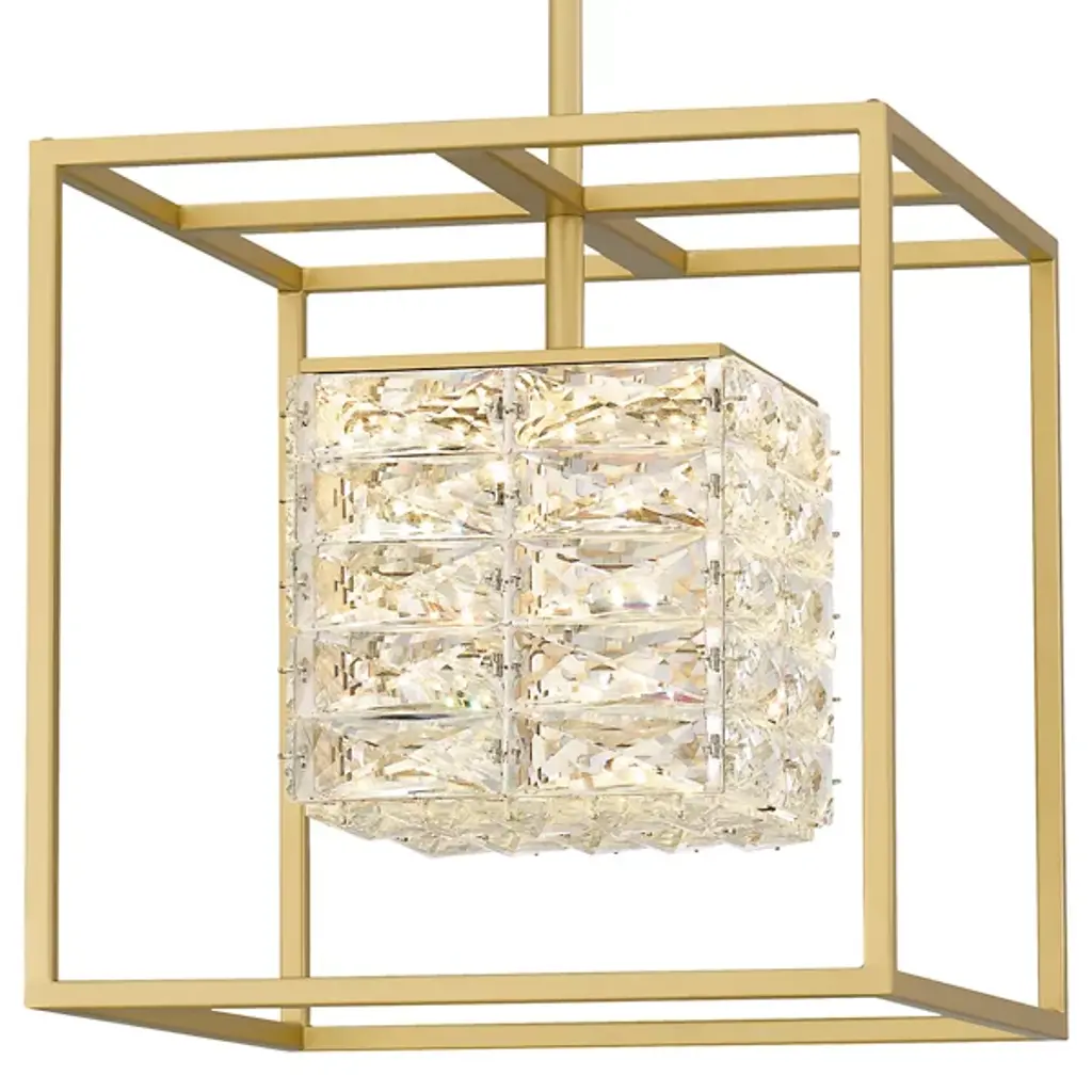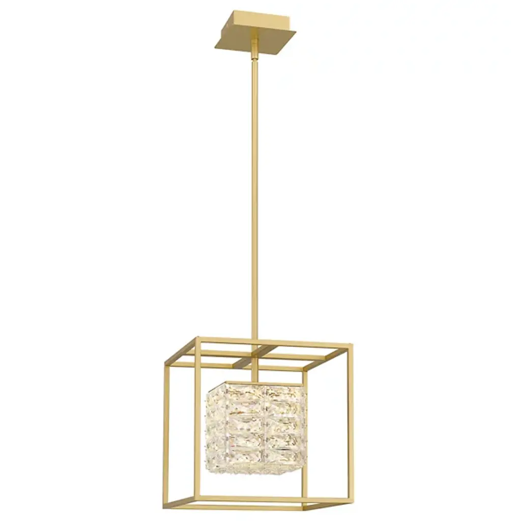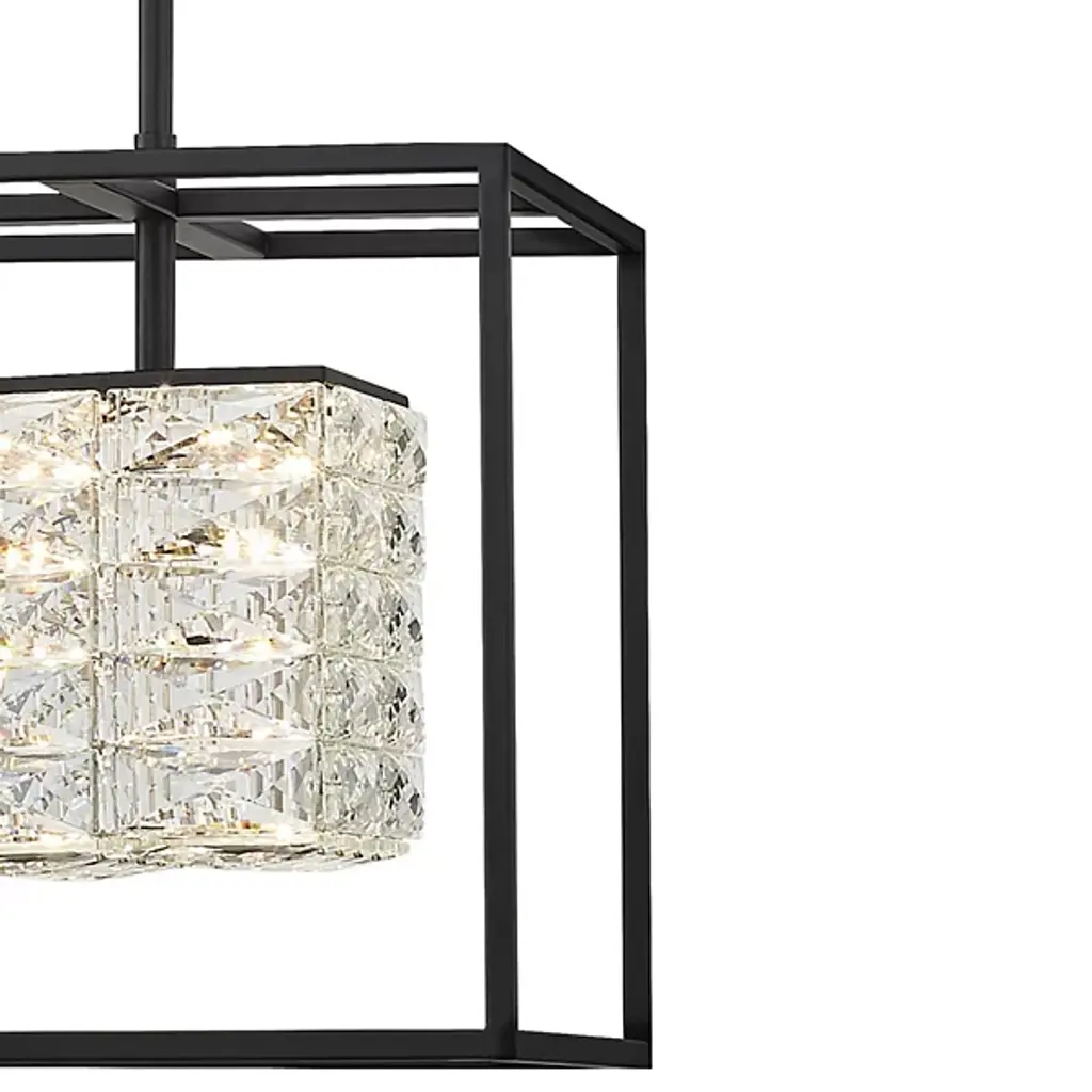 The Dazzle LED Pendant by Quoizel is a bold and sophisticated blend of metal and crystal. Descending from a single down rod, an openly styled square frame surrounds a cubed arrangement of clear bevel-cut crystal glass for a layered composition. Creating a beautiful space for light to reflect, refract, and filter through, the sparkling materials set at the center of this pendant allow this piece to make an elegant statement in the rooms it brightens.