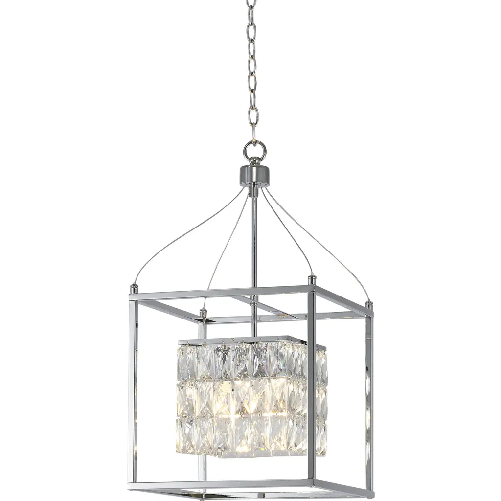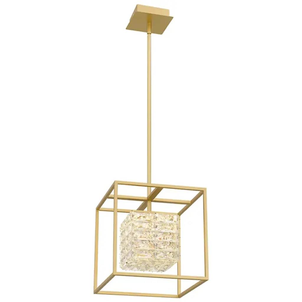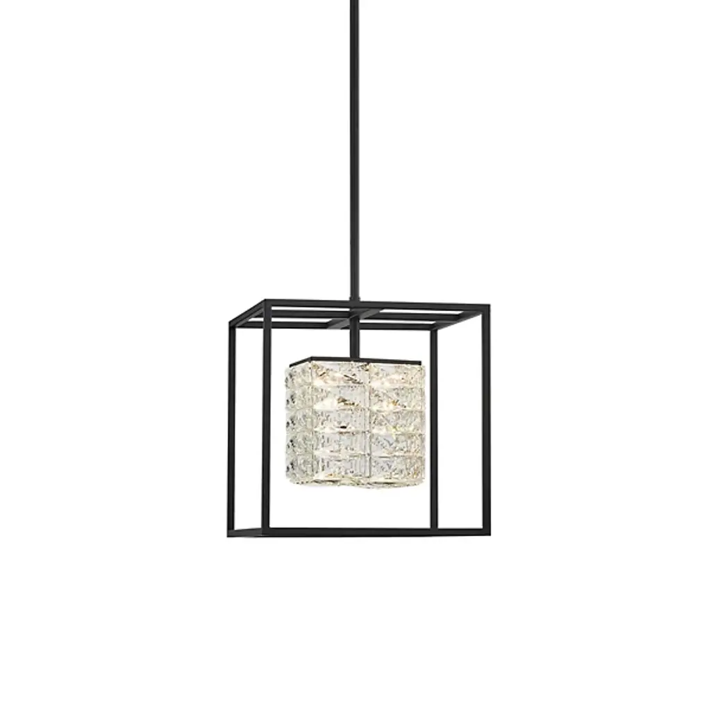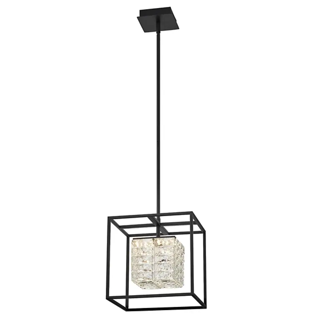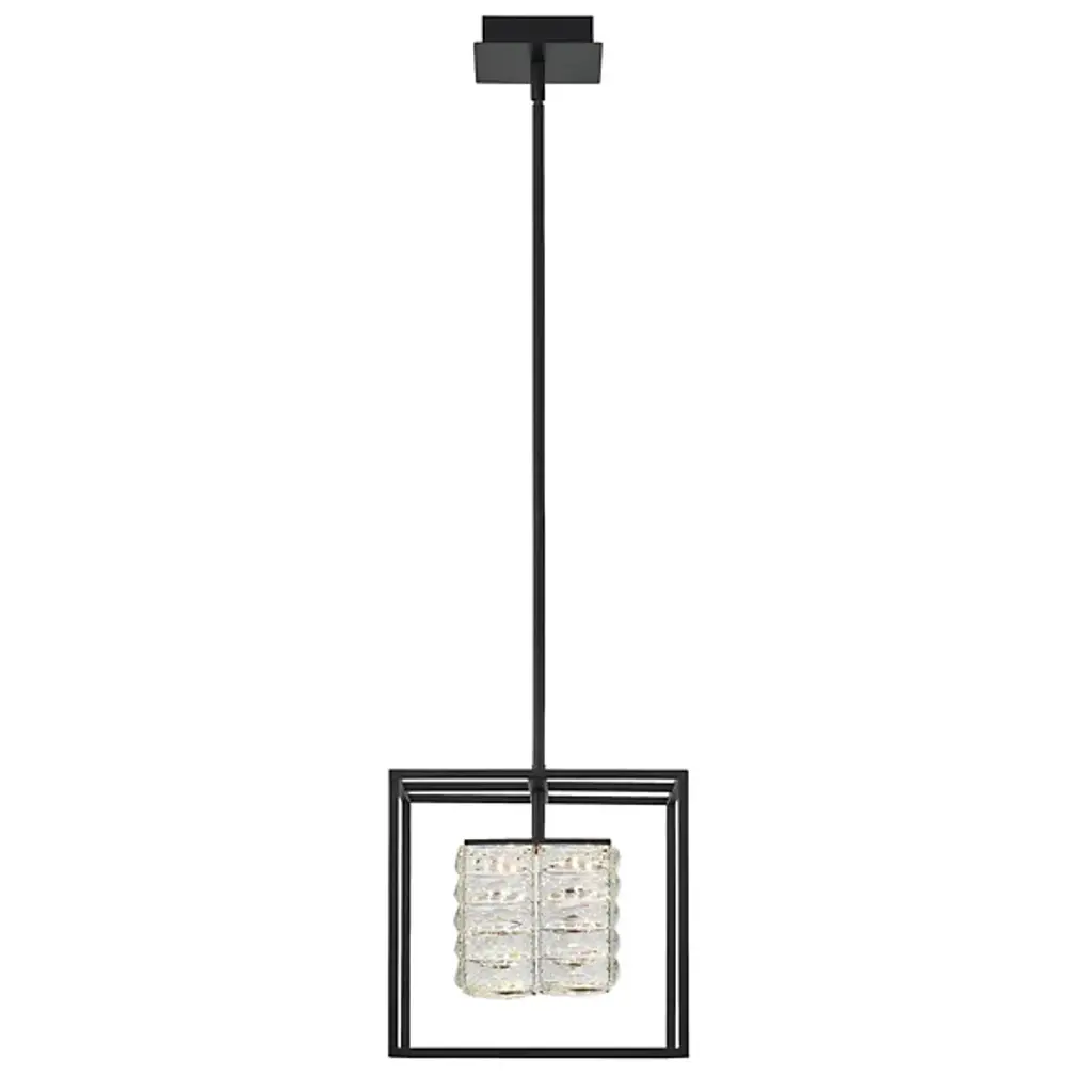 The Dazzle LED Pendant by Quoizel is a bold and sophisticated blend of metal and crystal. Descending from a single down rod, an openly styled square frame surrounds a cubed arrangement of clear bevel-cut crystal glass for a layered composition. Creating a beautiful space for light to reflect, refract, and filter through, the sparkling materials set at the center of this pendant allow this piece to make an elegant statement in the rooms it brightens.