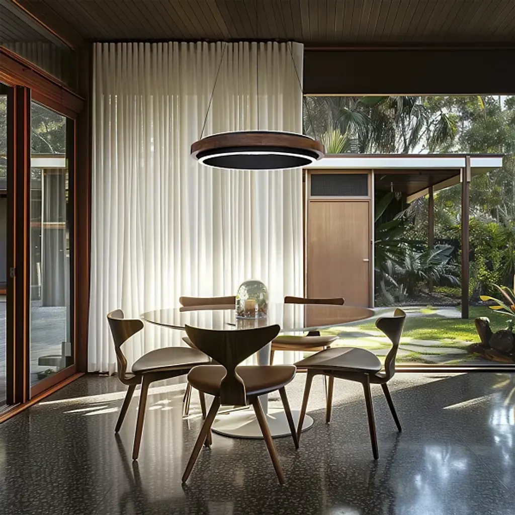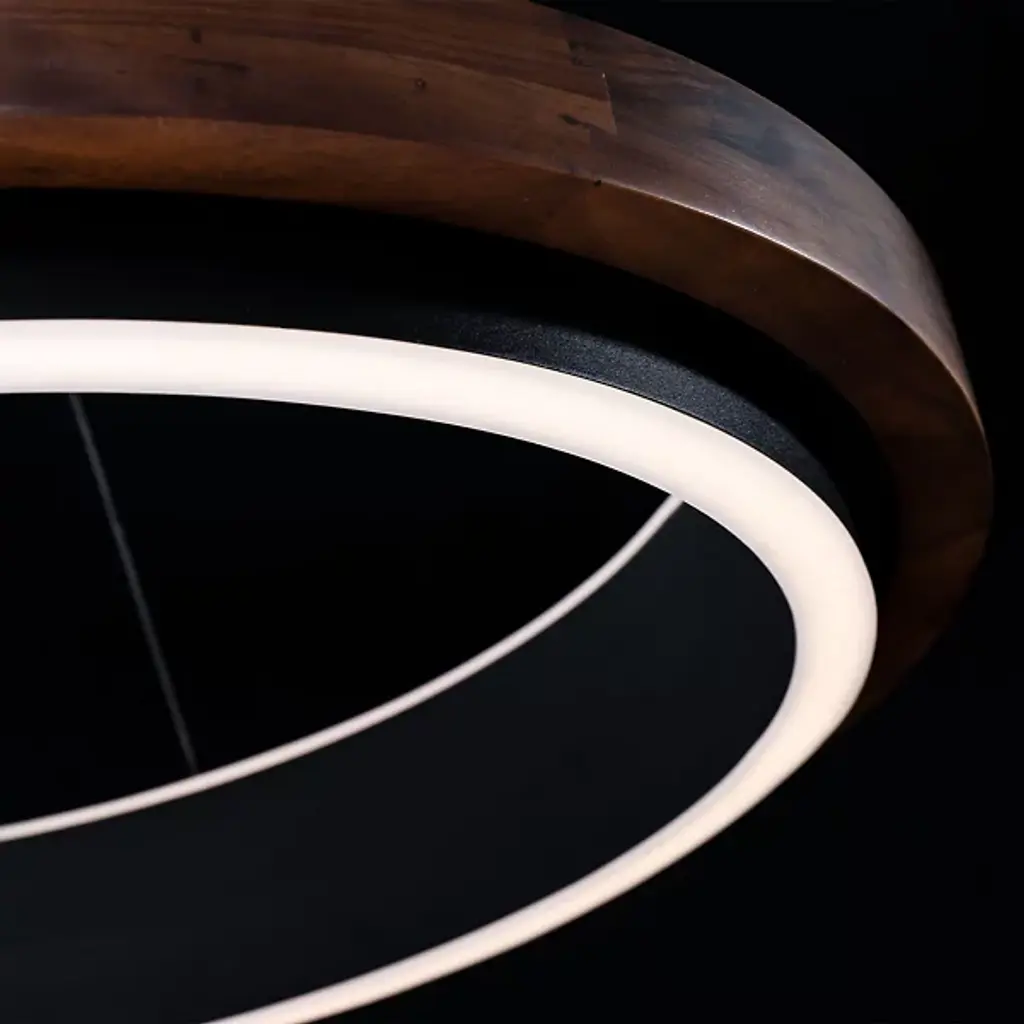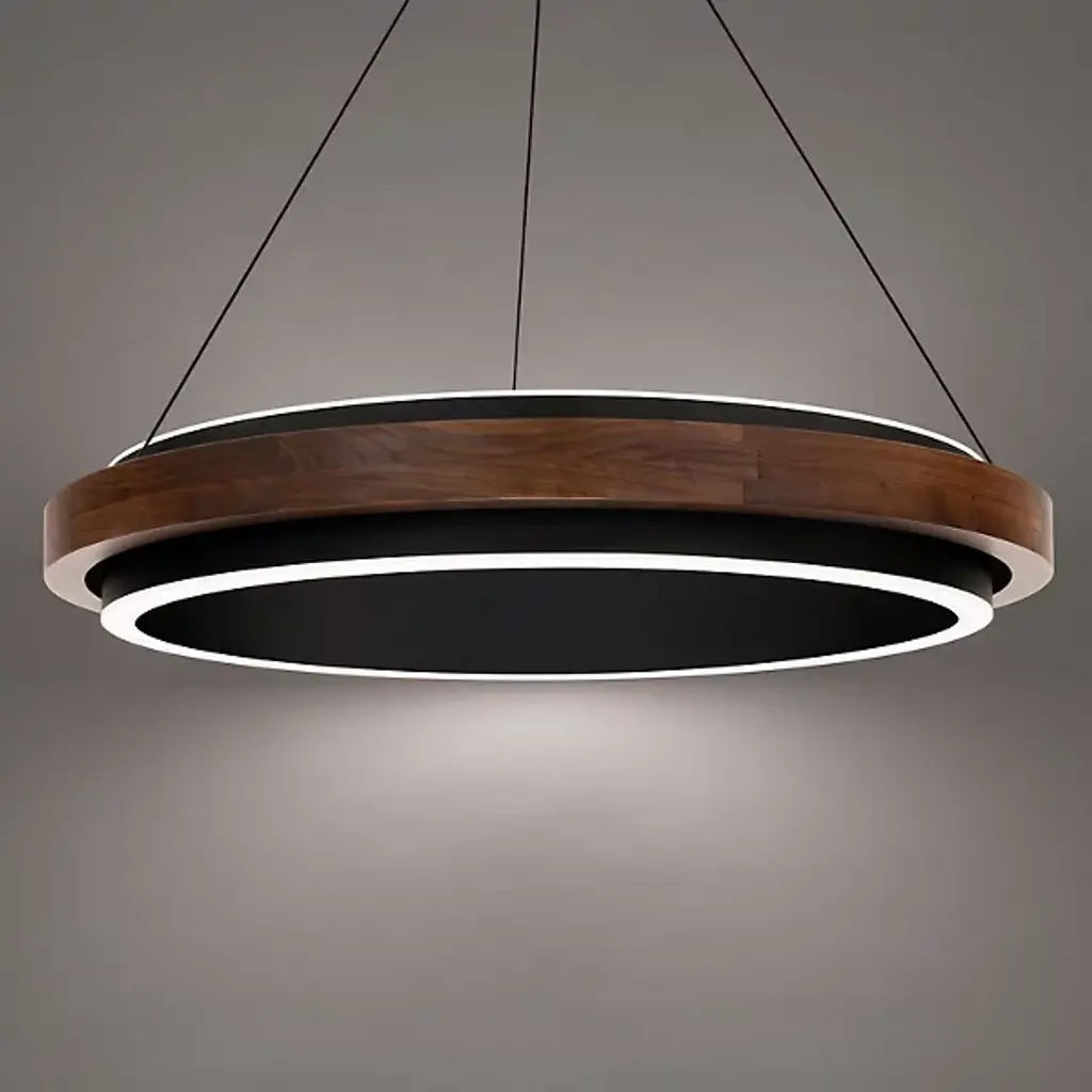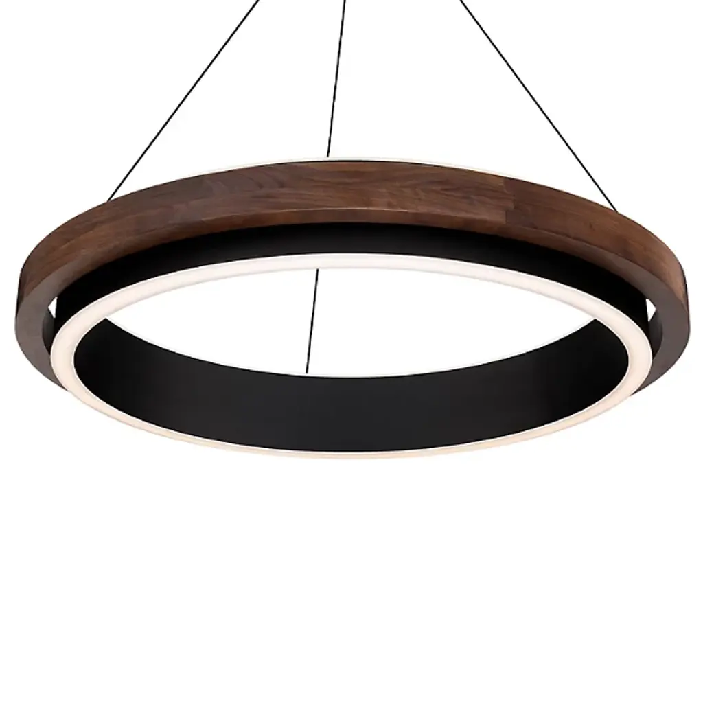 The Delaney LED Pendant from Modern Forms encases a frosted acrylic diffuser within a rounded walnut wood frame that brings natural warmth to contemporary lighting design. The rich walnut grain patterns create texture and depth around the central light source, while the curved wood construction softens the overall appearance. Electrified cables provide clean suspension lines while eliminating bulky power cords from the design equation. The wood frame serves both as a decorative element and structural support, with the frosted diffuser ensuring even light distribution throughout interior spaces.