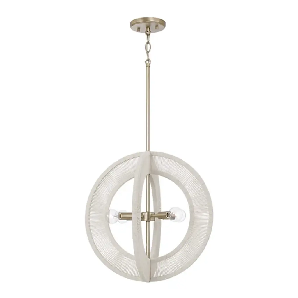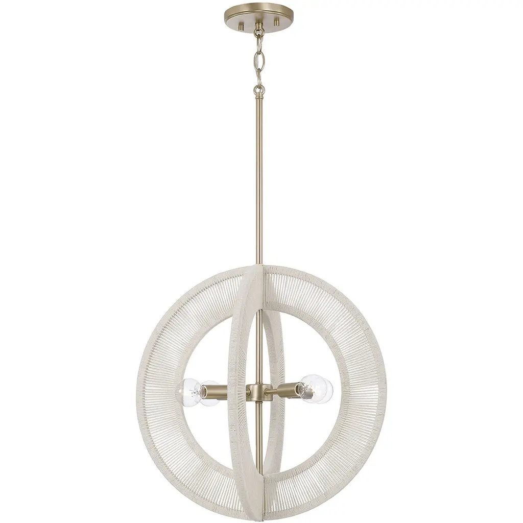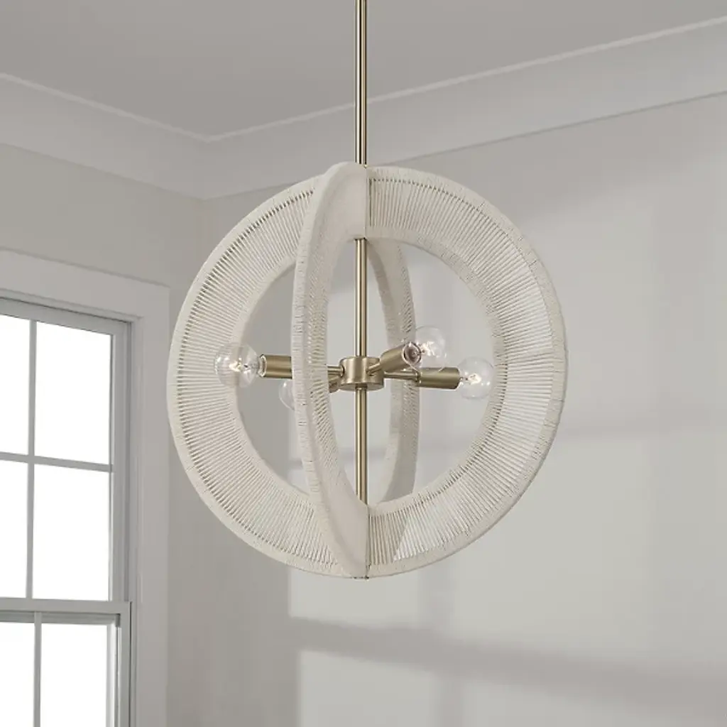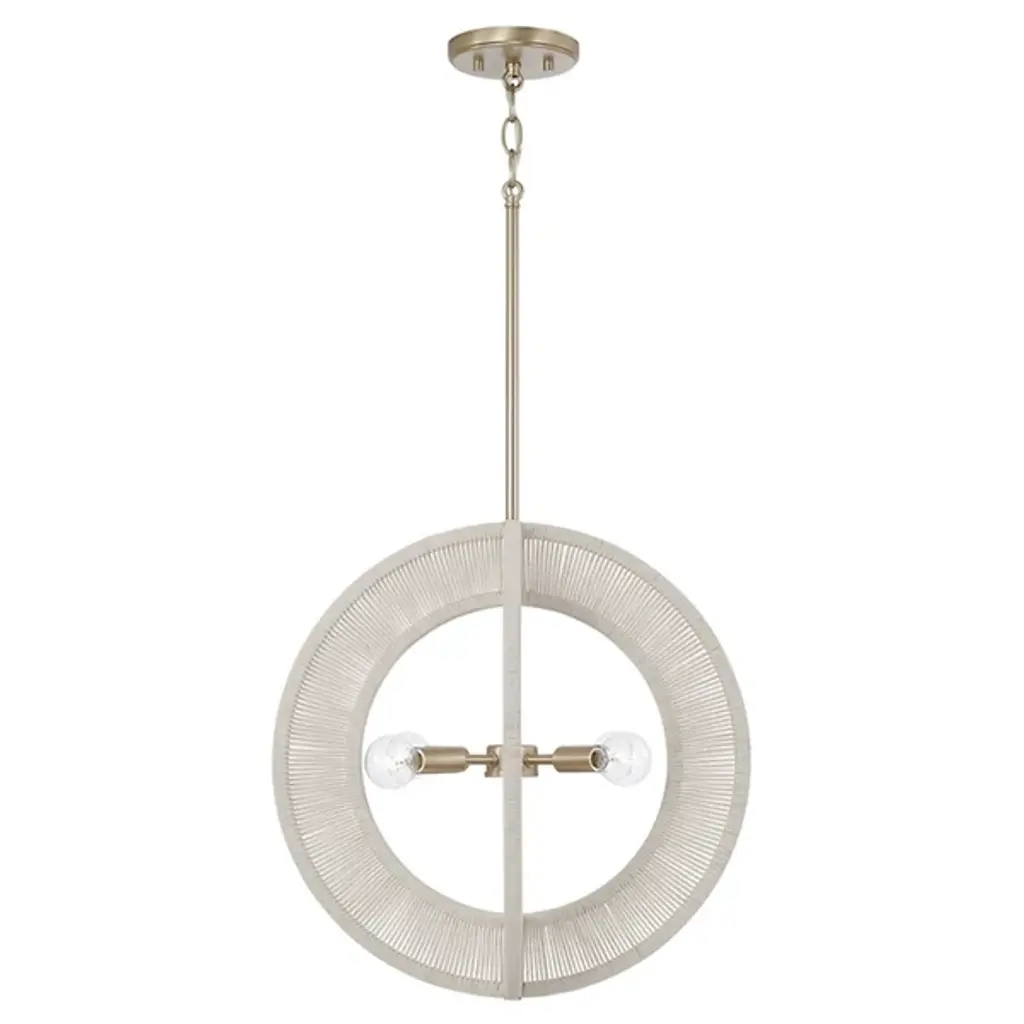 The Delaney Pendant from Capital Lighting introduces unusual texture through hand-wrapped bleached natural rope rings. This orb-shaped pendant breaks from conventional lighting with its artisan craftsmanship that brings organic elements into contemporary settings. The horizontal socket placement within the pendant distributes light evenly throughout the open framework. Drawing inspiration from global and bohemian influences, this pendant maintains a minimalist foundation while incorporating natural materials. The craftsmanship evident in each carefully wrapped rope section demonstrates attention to detail. The open design allows light to play through the structured rings while maintaining a light, airy presence in any room.