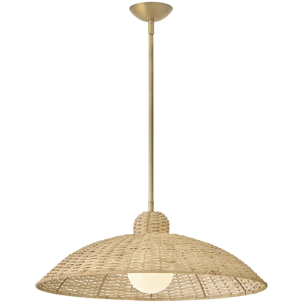 Both relaxed and refined, Delano is a natural choice to bring a sophisticated, coastal feel to any interior. A sturdy, subtly etched vintage gold leaf rod holds a warm honey rattan shade. The opal glossy glass globe fills the shade with a soft glow that also emanates throughout this hand-woven pendant.
