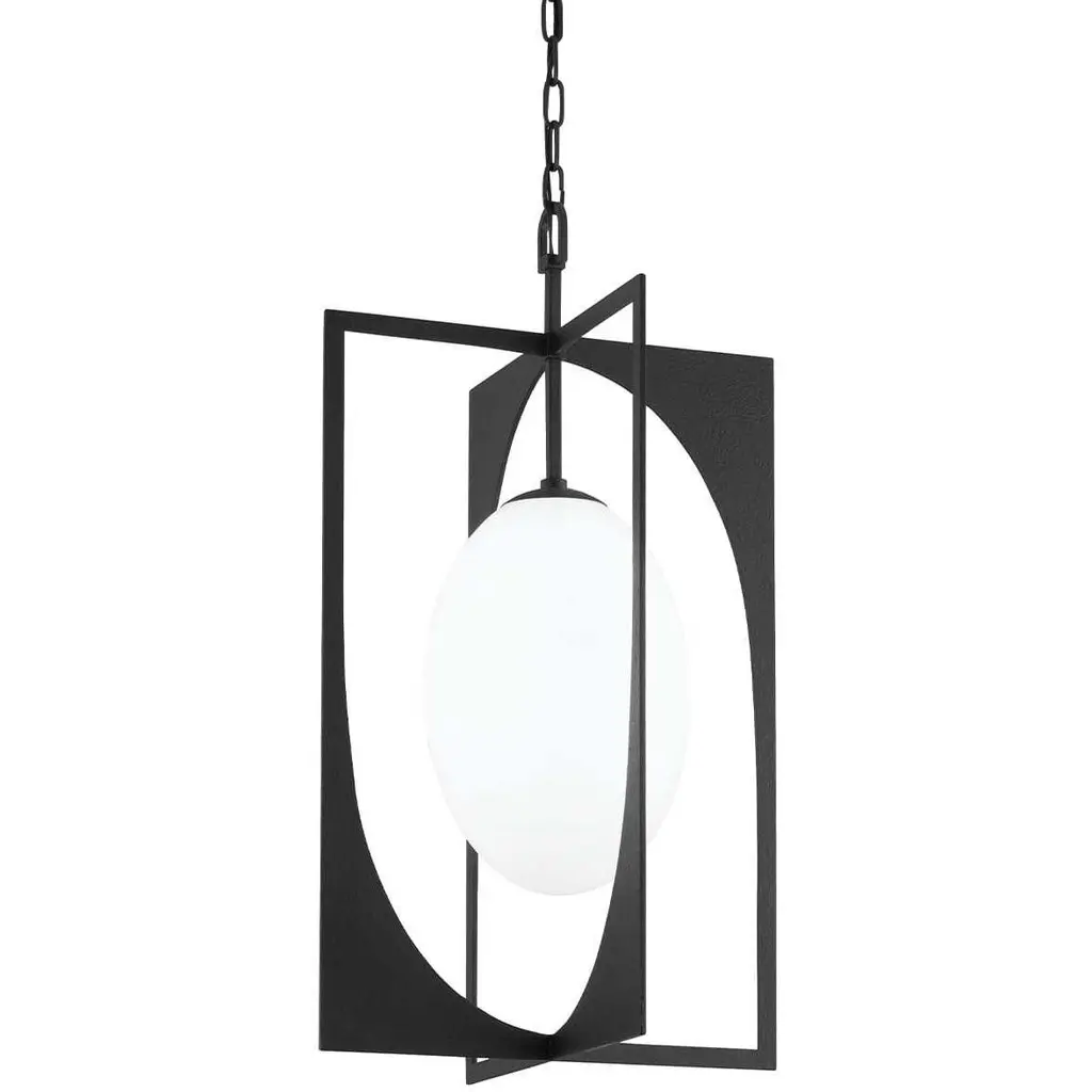 Delayne has a sophisticated style that transcends its simple design. A softly curved fitted metal framework encases an opal glass globe with slender bands creating a dynamic form. The pendant offers a refined mid-century design enhanced by gently diffused light that creates an ambient glow.