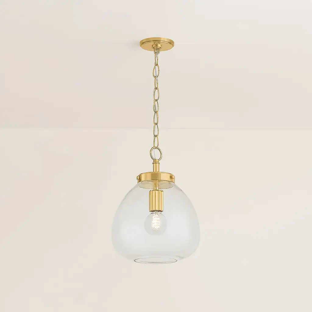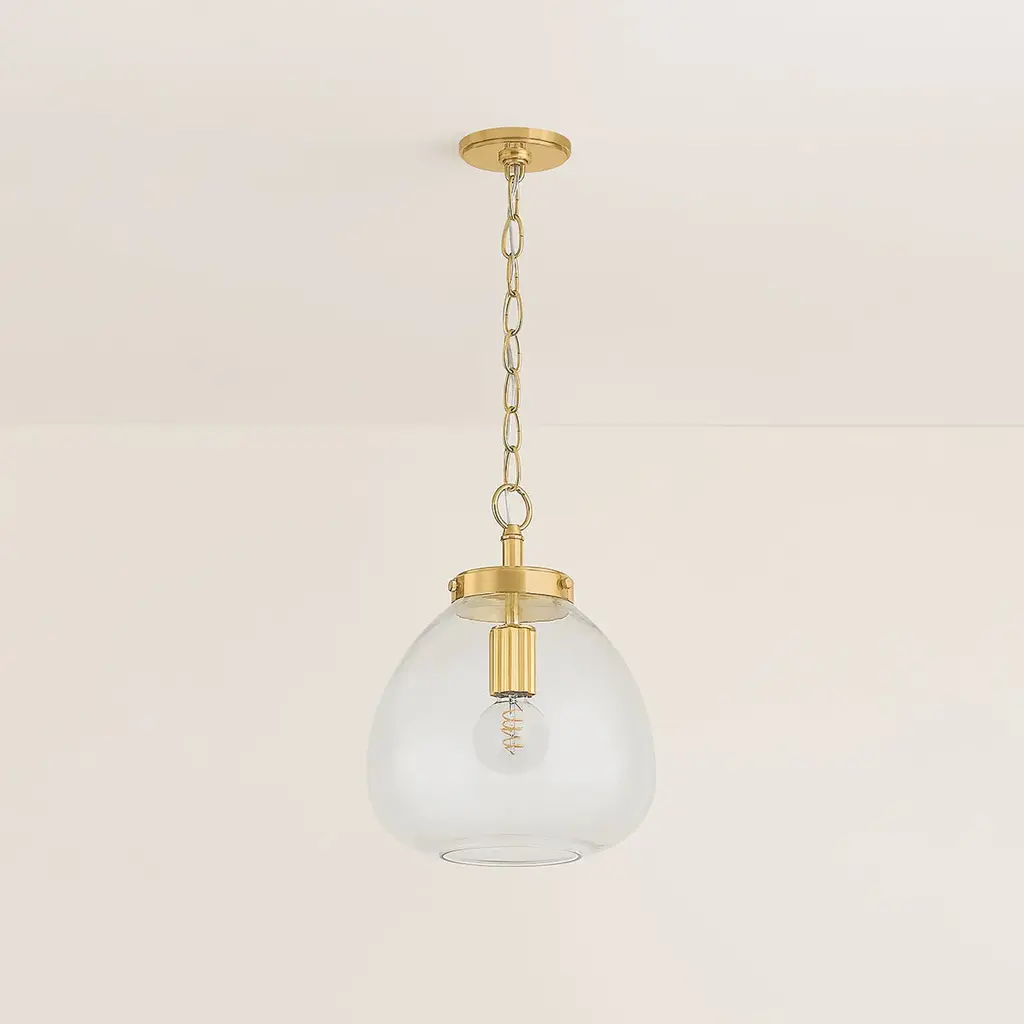 The Della pendant takes a simple shape and makes it special. When viewed from below, the gently curved clear glass shade provides a view of the botanical metalwork within. The organic form of the shade nods to nature, as does the floral cut-out detail on the socket cup and fitter. Finished in either Aged Brass or True Bronze, Della is a crowd-pleaser in kitchens and dining rooms.