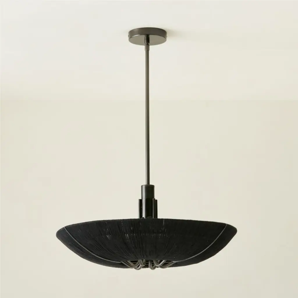 Inspired by vintage designs, jute pendant by award-winning French design duo dach&zephir is hand-wrapped by skilled artisans. Using the cultural histories of France and Guadeloupe as raw material for their design, the black jute shade softly filters the light within, offering a relaxed, organic aesthetic. CB2 exclusive.