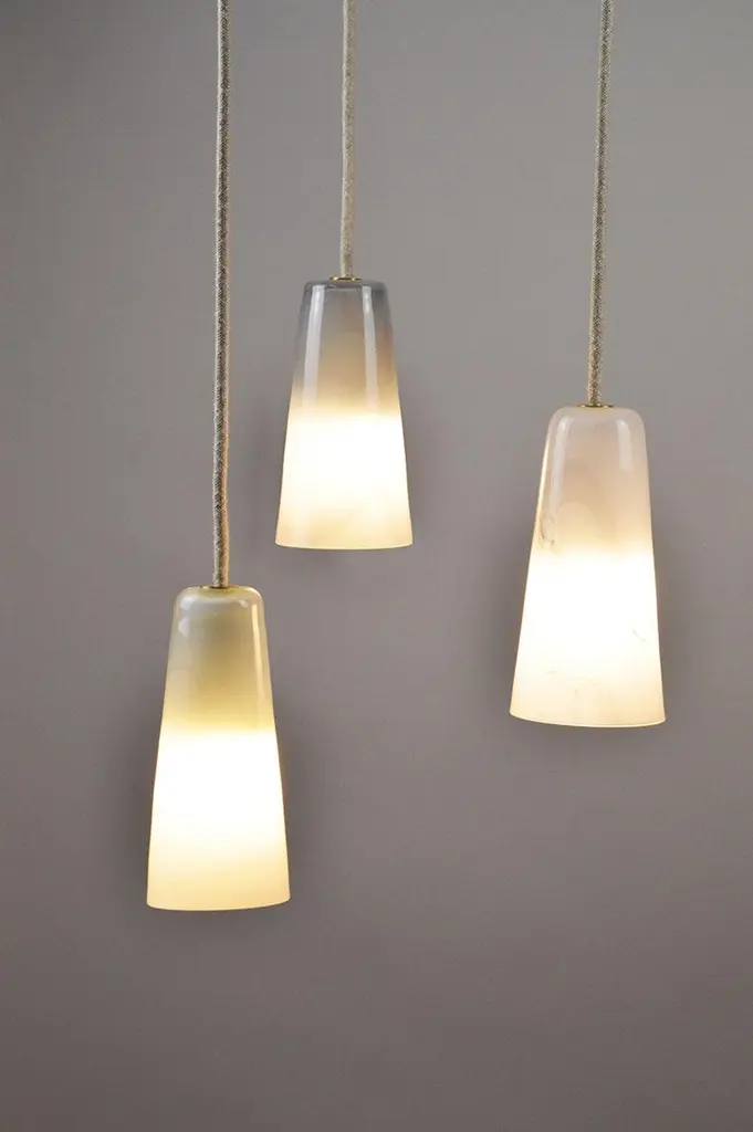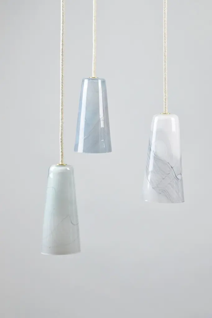Delta Multiple pendant by Atelier GeorgeOne of a KindDimensions: Ø 35 x H 100 cm Cord Length : 100 cmMaterials: Handblown glass, brass 230/240 Volts 50-60 Hz 3 WattVariation of colours available. For custom heightsAll our lamps can be wired according to each country. If sold to the USA it will be wired for the USA for instance.The Moire collection is the result of a work on optical and transparency effects. It is named after the «moiré» patterns of certain fabrics like tulle, which is obtained by overlaying two similar printed or woven patterns. The observation of these wavy,iridescent patterns inspired the textures found in the collection. The color palette is beige, gray and blue, evoking stone or water.This collection forms the basis of our signature style, simple by design. It comprises light fixtures, tableware and interior accessories, all hand-made using hot glass crafting techniques.The Atelier George is a French design and glassblowing studio. Each piece is hand-made using hot glass crafting techniques. To bring you a set ofunique objects, the crafting process and the color finish makes every piece slightly different from the next.