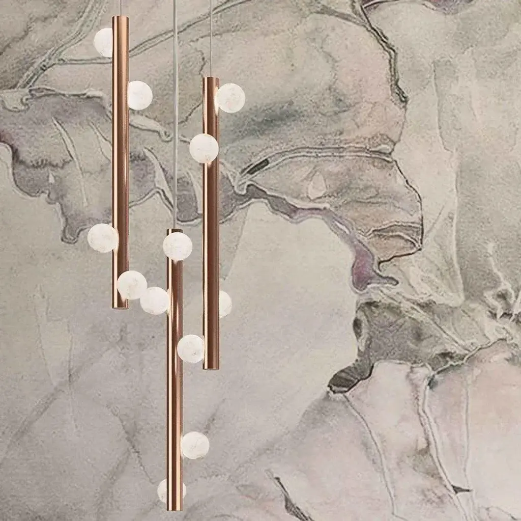 Demetra bronze pendant lamp 2 by alabastro italiano dimensions: d 12 x w 12 x h 60 cm. Materials: white alabaster and bronze. Available in different finishes: shiny silver, bronze, brushed brass, ruggine of florence, brushed burnished, shiny gold, brushed black, freedom green, shiny black and copper. Please contact us. All our lamps can be wired according to each country. If sold to the usa it will be wired for the usa for instance. The name demetra, goddess of flora, sister of zeus, fully reflects the particular shape of this series by alabastro italiano. The spheres, of pure hand-turned alabaster, look like fruits hanging from the branches of a hypothetical tree of light. These brilliant elements stand out between heaven and earth and symbolize the richness that only mother nature can offer us. After years of experience in the family business, which specializes in design and lighting, riccardo and alberto ongarato found the brand alabastro italiano. Each project is conceived and designed to give a strong sign of recognizability and uniqueness. The use of precious materials such as alabaster, brass, leather and blown glass, worked by the skilful hands of our craftsmen, are combined to create “timeless” objects. From the depths of the earth to the light of the sun. Alabastro italiano care about these extremes and transcends them in a creative dynamic that emphasizes simplicity and clean-cut lines. The company has created an entirely new project made in italy, revolutionizing the previously existing collections into eternal and evergreen lighting elements. By designing clean-cut and original lines, built-in with the latest technology and continuously innovating, alabastro italiano has never lost sight of its goal: perfection. The result of this work is an extraordinary collection of alabaster lightings. Alabaster needs human hands to come to life. The charm of these stone objects comes from their uniqueness, from the fact that they come from the hand of those who has left a mark and a memory with their work, each grain makes each piece unique. Alabaster needs human hands to come to life. The charm of these stone objects comes from their uniqueness, from the fact that they come from the hand of those who has left a mark and a memory with their work, each grain makes each piece unique. Alabaster is a material that leaves little traces of magic all around it. It is difficult to identify the exact point where the material ends and its reflection begins. It is impossible to understand how far the light sinks in its soft transparency. It changes according to the positions in which it is placed, depending on the point of view. Alabaster is a compact and rare stone that lays down very precise laws requires a familiarity that only italian craftsmen possess. Alabastro italiano collaborates with each client to create a unique project. Starting from the advice for better architectural lighting, it brings its know-how, materials, design and creative inspiration to interior architects and interior designers. up to 250v (europe/uk standard).