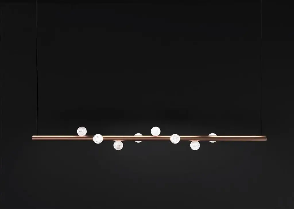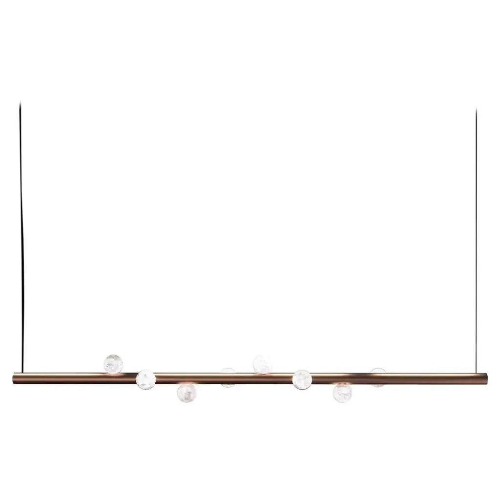 Demetra copper pendant lamp 1 by alabastro italiano dimensions: d 12 x w 120 x h 12 cm. Materials: white alabaster, copper and leather. Available in different finishes: shiny silver, bronze, brushed brass, ruggine of florence, brushed burnished, shiny gold, brushed black, freedom green, shiny black and copper. the name demetra, goddess of flora, sister of zeus, fully reflects the particular shape of this series by alabastro italiano. The spheres, of pure hand-turned alabaster, look like fruits hanging from the branches of a hypothetical tree of light. These brilliant elements stand out between heaven and earth and symbolize the richness that only mother nature can offer us. up to 250v (europe/uk standard).