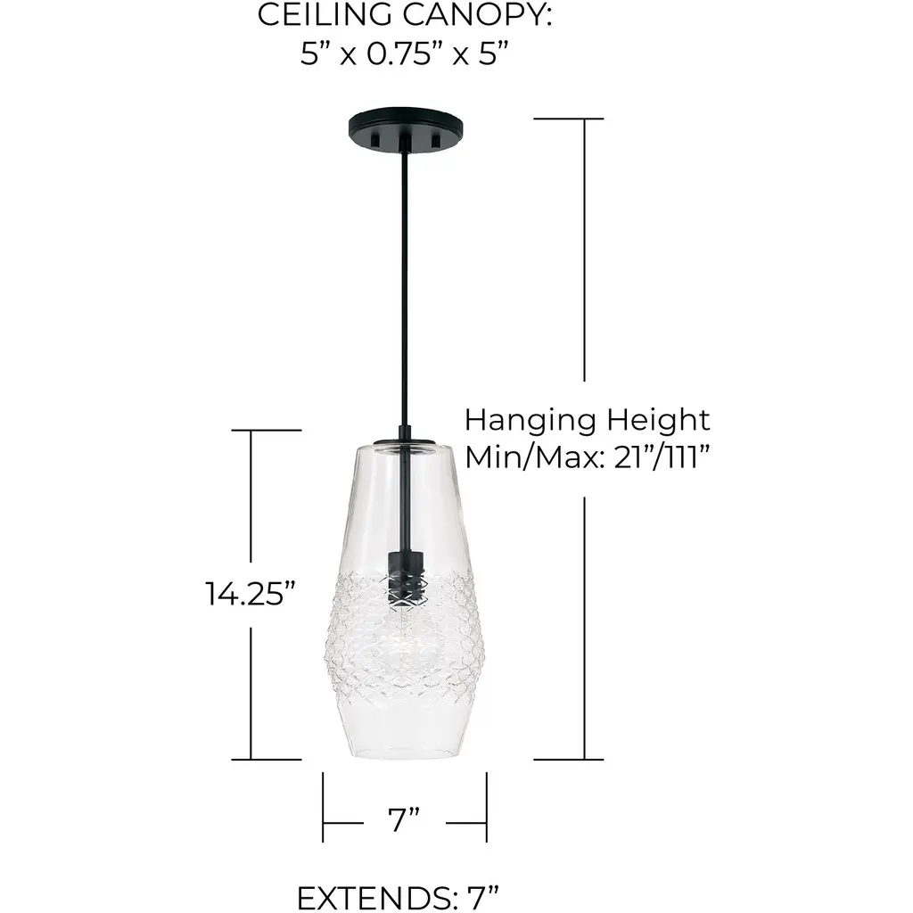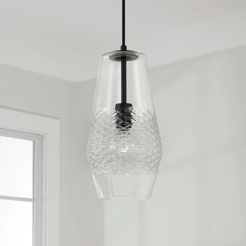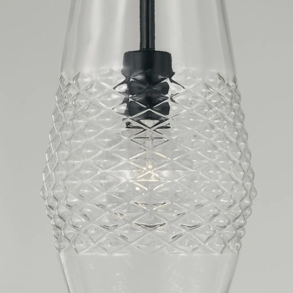 Reminiscent of heirloom glassware, the Dena Pendant brings a retro revival to any space. The diamond embossed glass paired with Matte Black gives a look that sparkles and shines.
