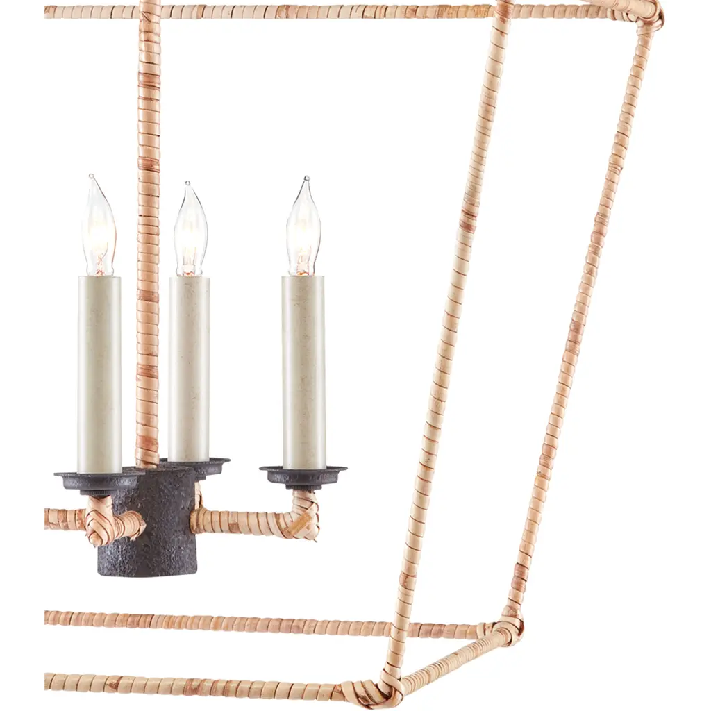 The Denison Rattan Medium Chandelier is a hammered wrought-iron fixture in a Molé black finish that is wrapped in rattan. The classic lantern shape has stood the test of time to make it one of our most popular offerings. A design element of note is the square that fastens the chandelier to the chain. This is one of a number of sizes and finishes in the Denison family.