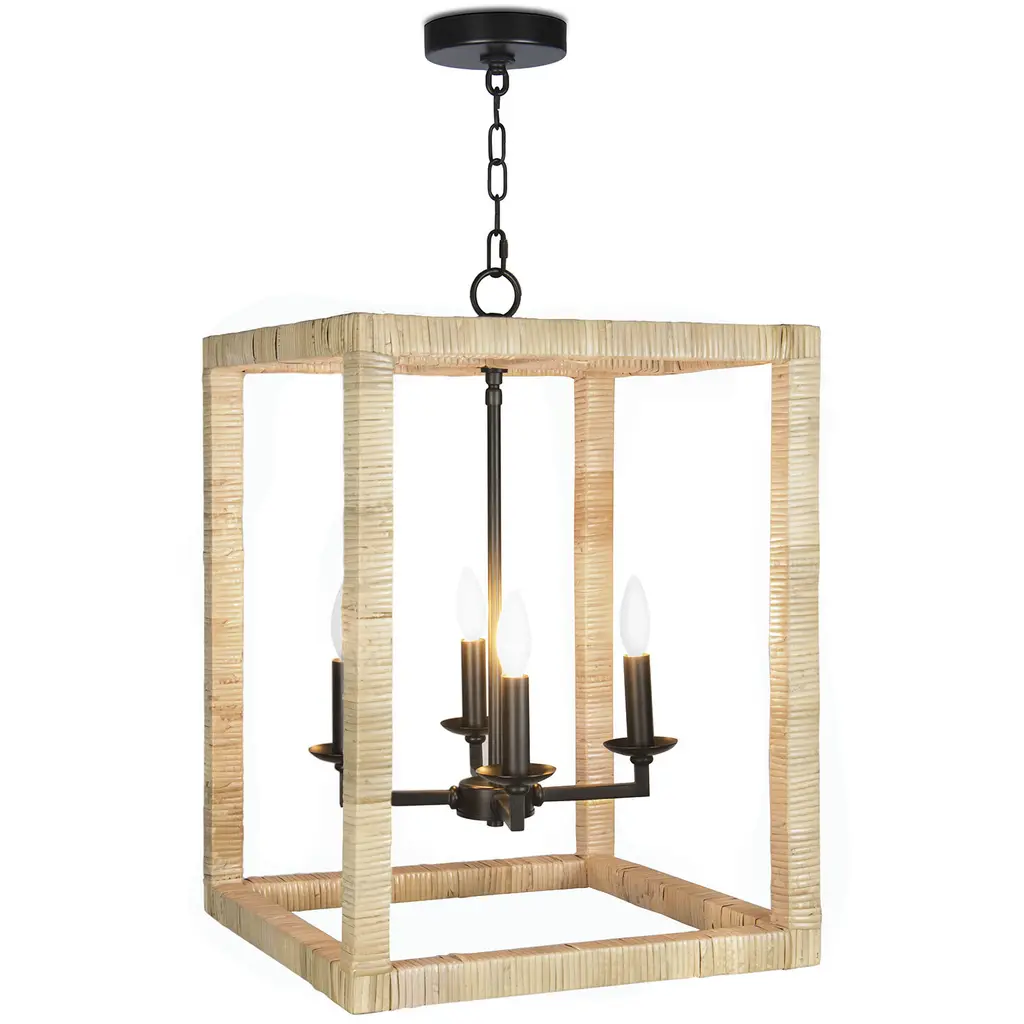 The Denison Rattan Grande Chandelier is a hammered wrought-iron fixture in a Molé black finish that is wrapped in rattan. The classic lantern shape has stood the test of time to make it one of our most popular offerings. A design element of note is the square that fastens the chandelier to the chain. This is one of a number of sizes and finishes in the Denison family.