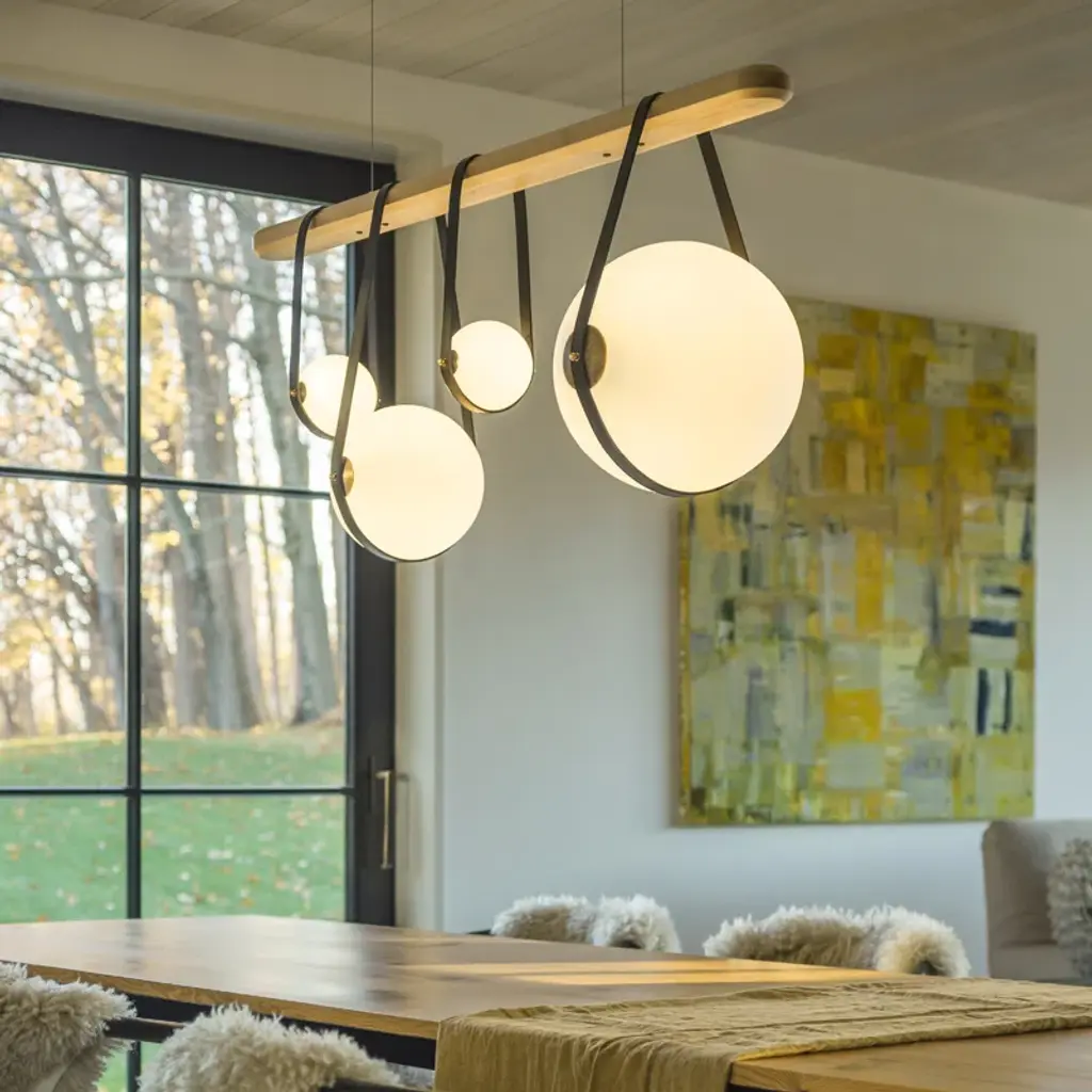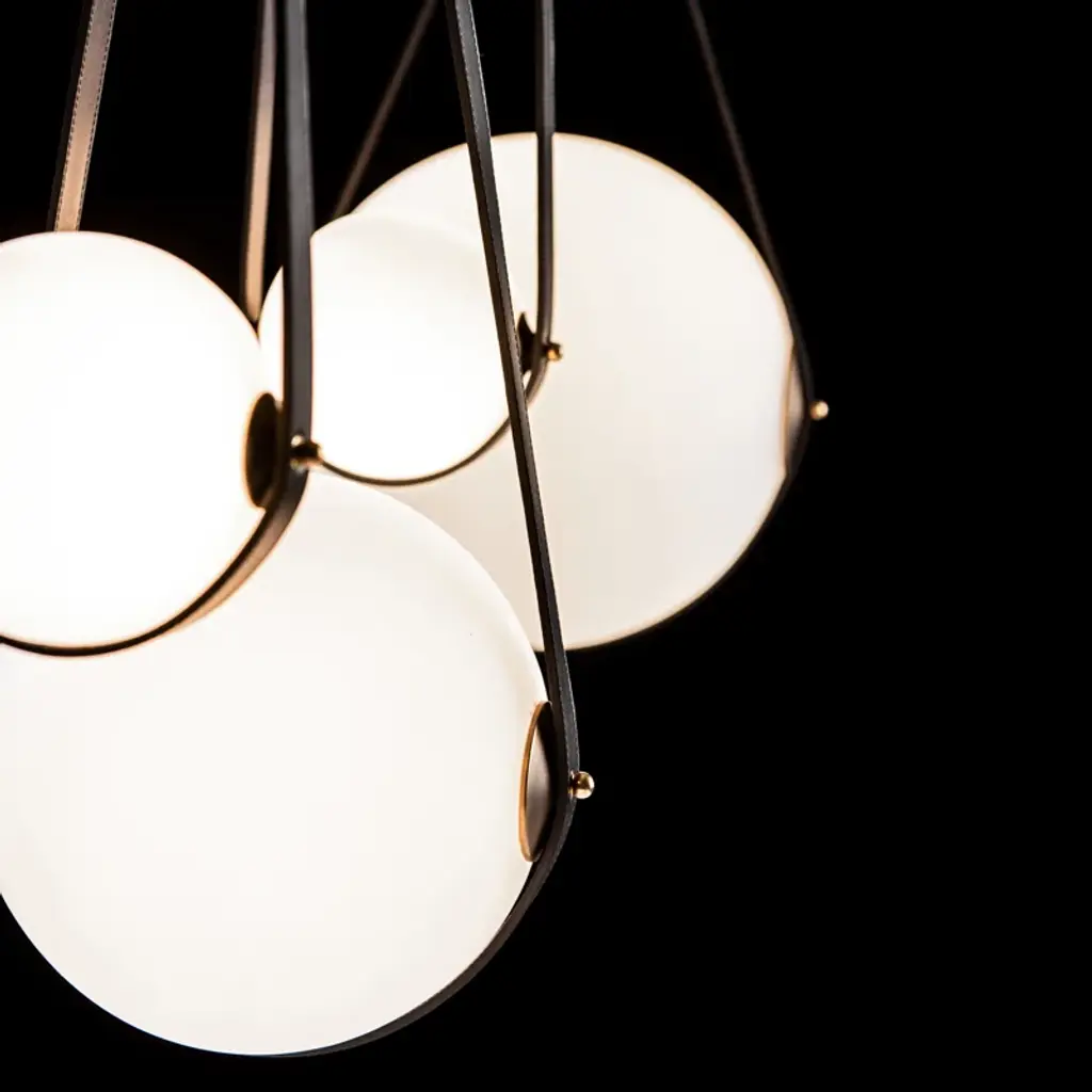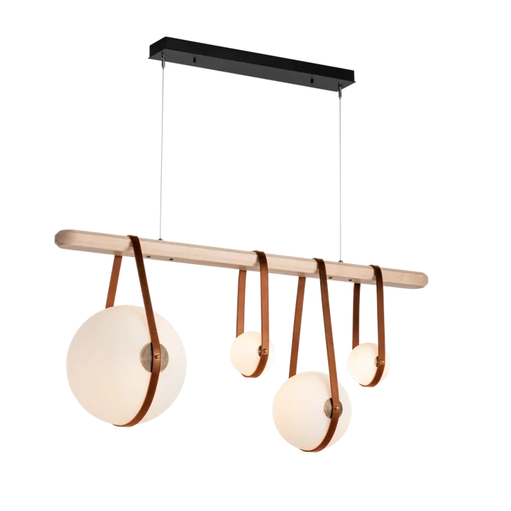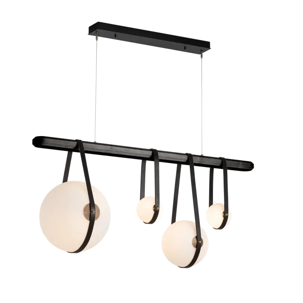 The acclaimed Derby collection welcomes this Derby 4 - Light Kitchen Island Linear LED Pendant. Four opal glass globes of varying sizes are hung via artisanally made leather straps. All Hubbardton Forge products are hand-crafted to last one at a time in Vermont.