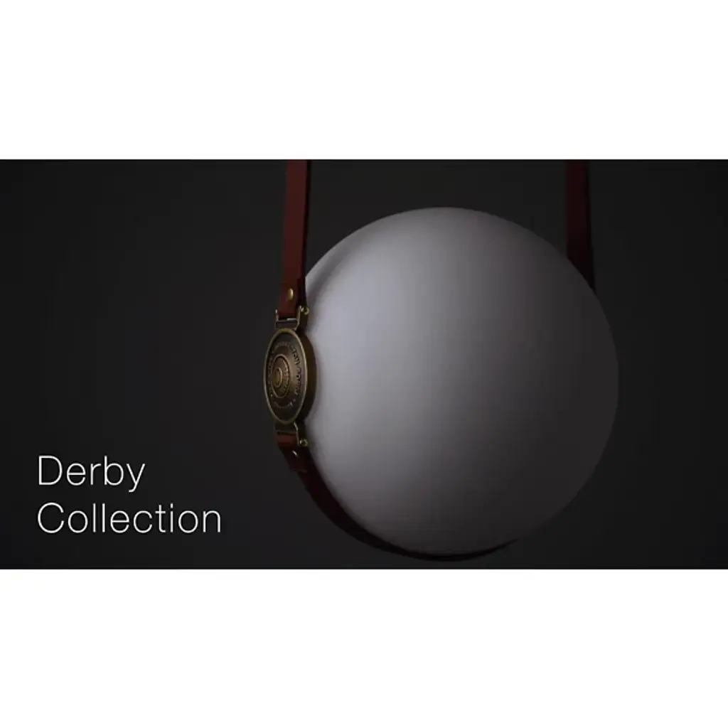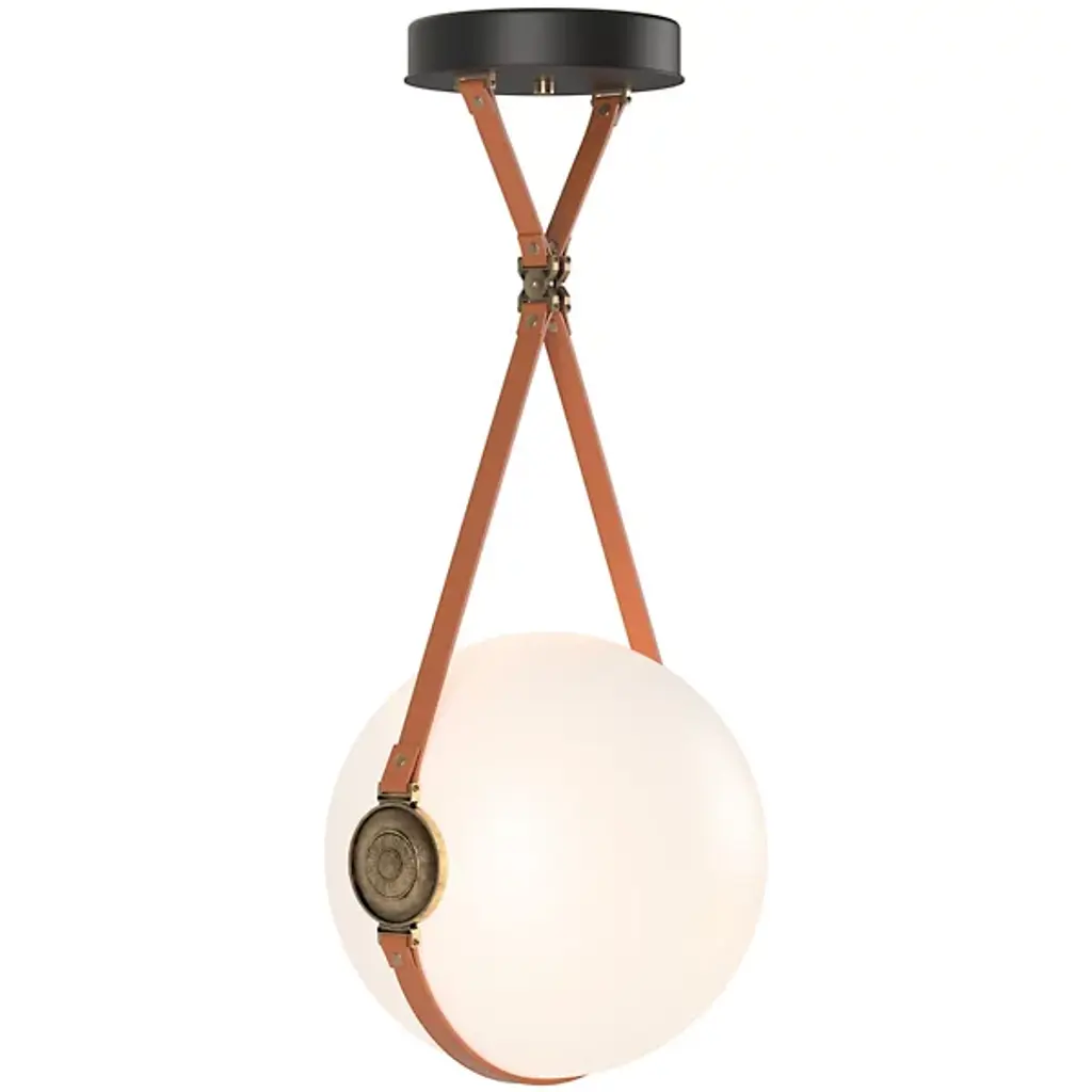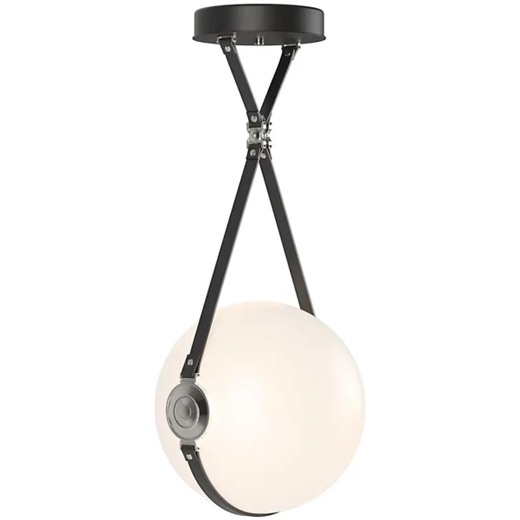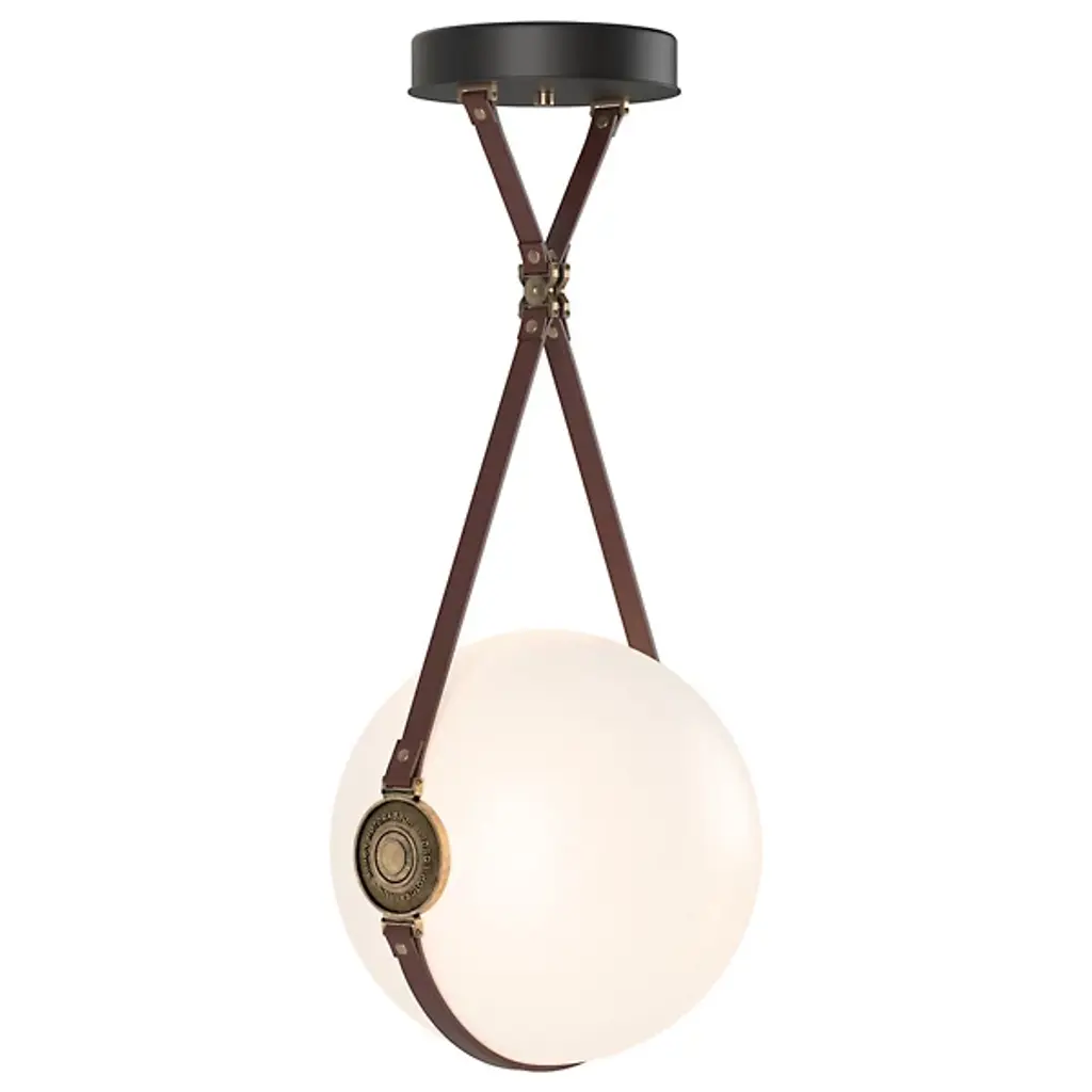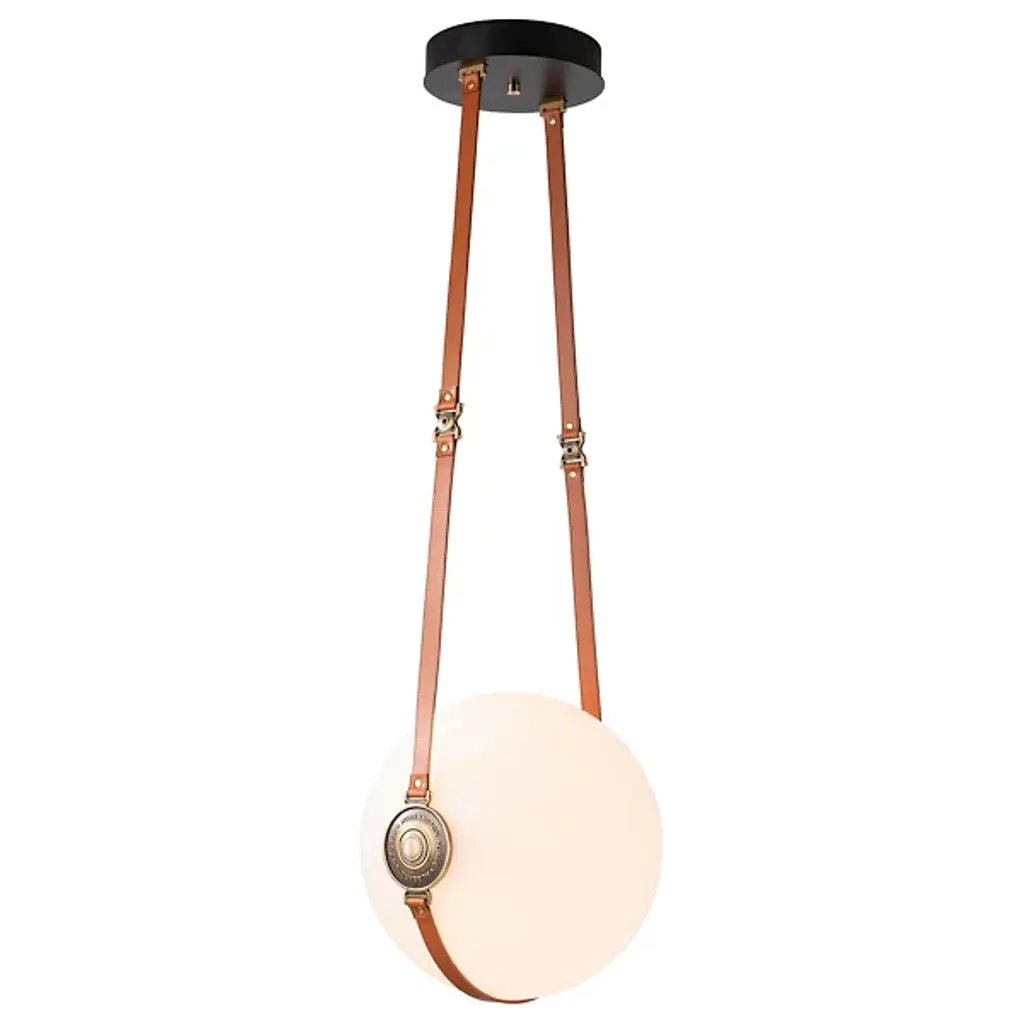 Bring a unique touch to your favorite space with the modern stylings of the Derby LED Pendant from Hubbardton Forge. Descending from the disc-shaped ceiling mount is a pair of leather straps adorned with small, gold accents. They come together near the center with a clasp, then spread apart again, wrapping tightly around a large, opal glass sphere that contains an integrated LED. The light emitted is bright and even, completely filling the globe as it softly spreads into the space.