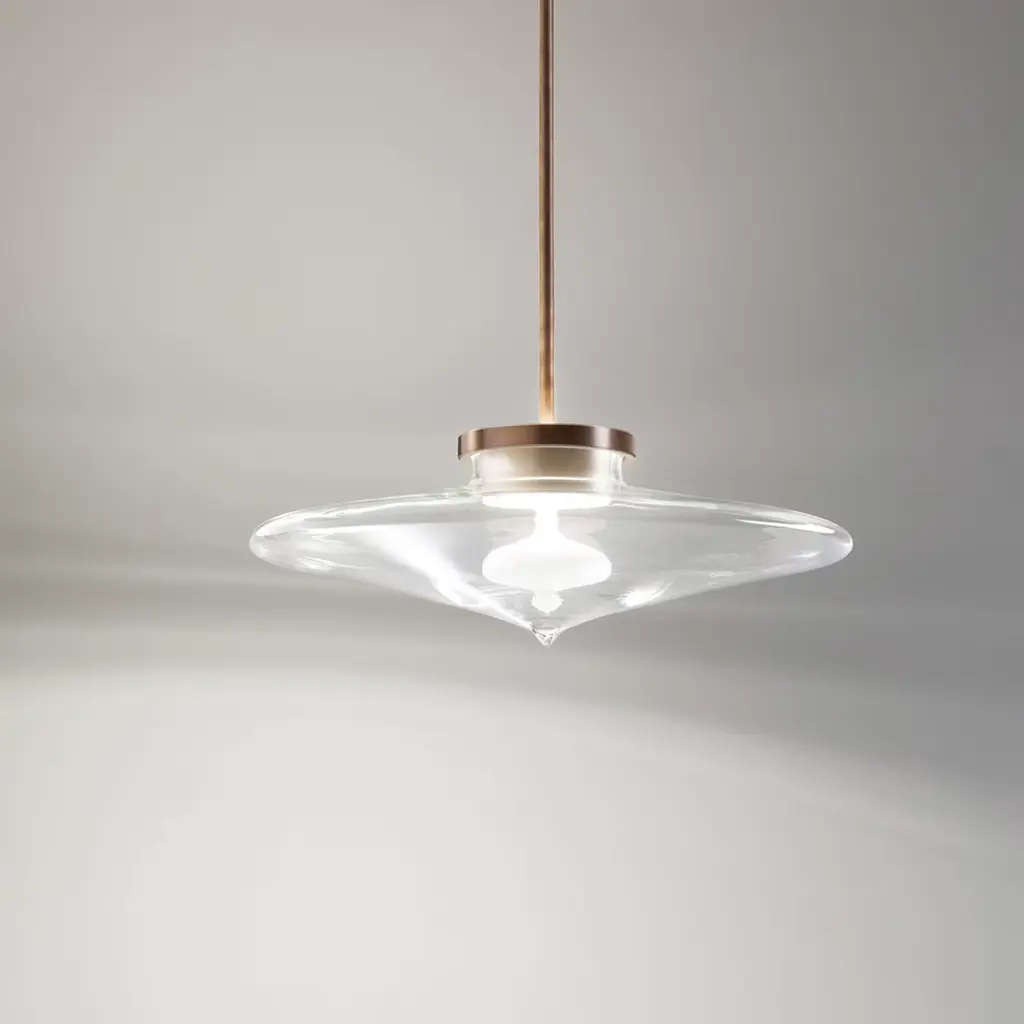 A refined yet minimalist design of captivating charm, this pendant lamp is suspended on a thin burnished metal stem ending with a stately disk-shaped shade in transparent borosilicate glass. Marked by clean and essential lines, it is customizable in finish upon request, please inquire with the Concierge for further details and options. The product includes a white ceiling canopy. It is possible to request the ceiling canopy in different colors.