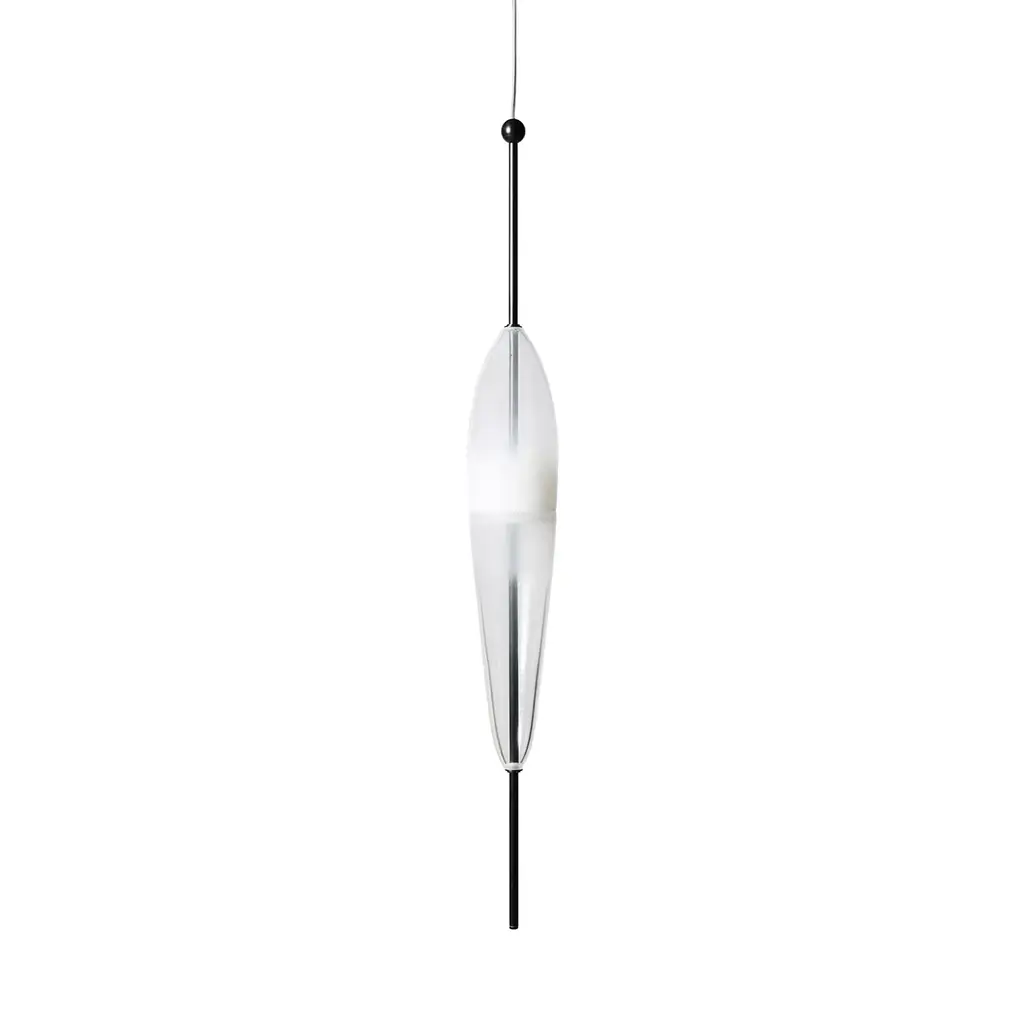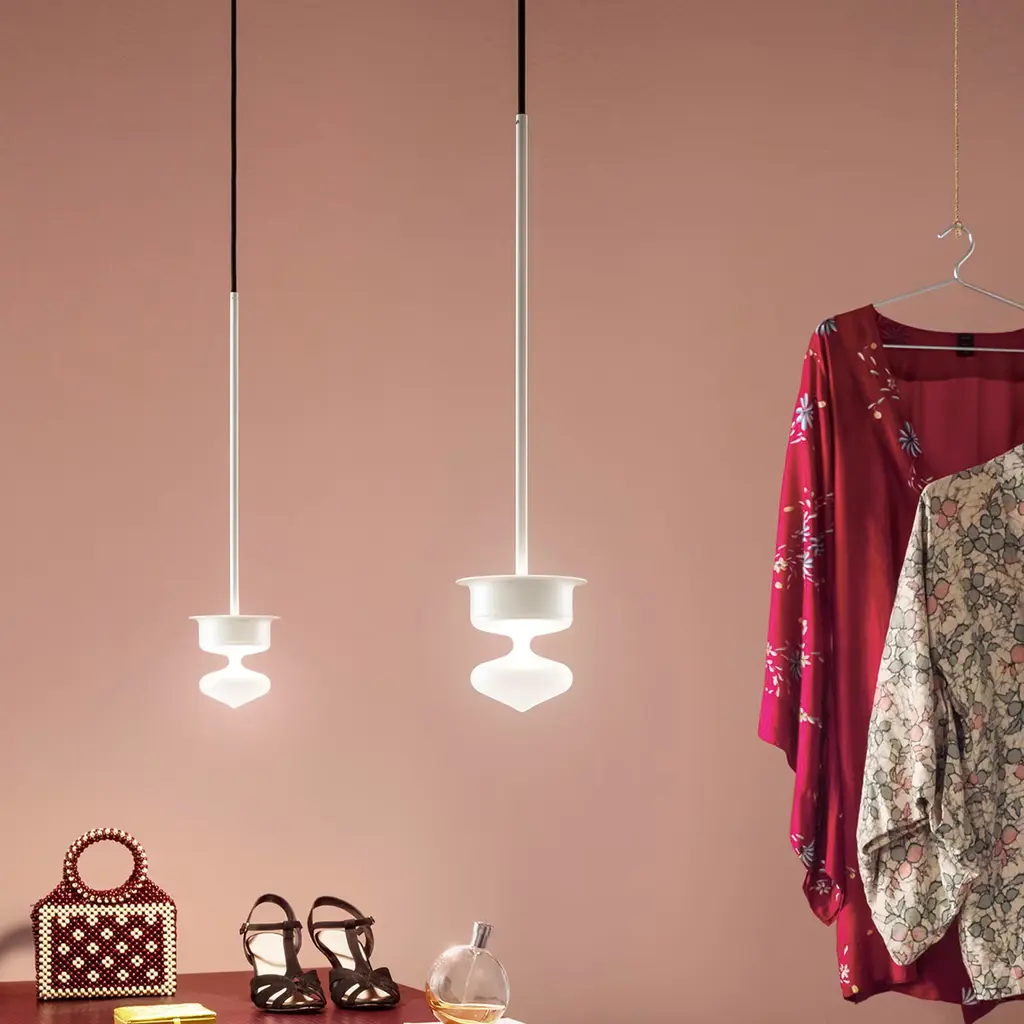 A delicate and versatile neutral palette describes this splendid pendant lamp, a stunning complement for a contemporary interior. Marked by a refined drop-shaped shade in transparent borosilicate glass, it is suspended on a white-lacquered metal frame. Please inquire with the Concierge for further details and customization options. The product includes a white ceiling canopy. It is possible to request the ceiling canopy in different colors.
