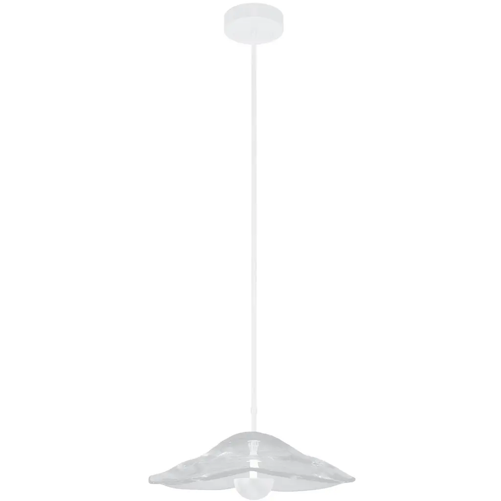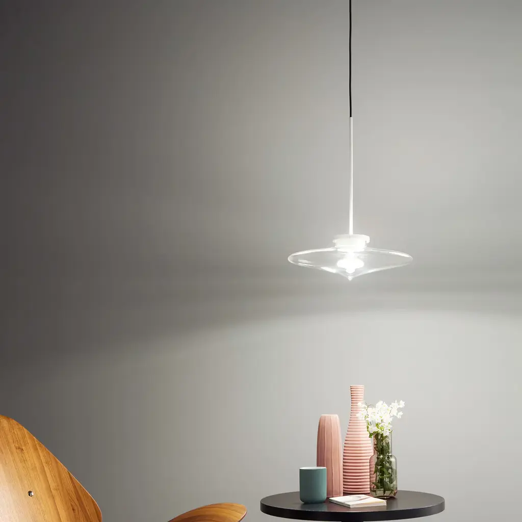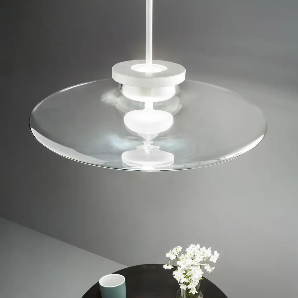 A sleek design of refined yet minimalist style, this pendant lamp is suspended on a thin metal stem lacquered in a matte white shade. A large disk-shaped shade in clear borosilicate glass completes its essential design. Customizable in finish, please inquire with the Concierge for further details and customization options. The product includes a white ceiling canopy. It is possible to request the ceiling canopy in different colors.