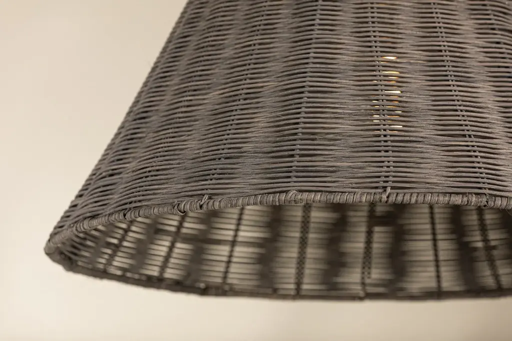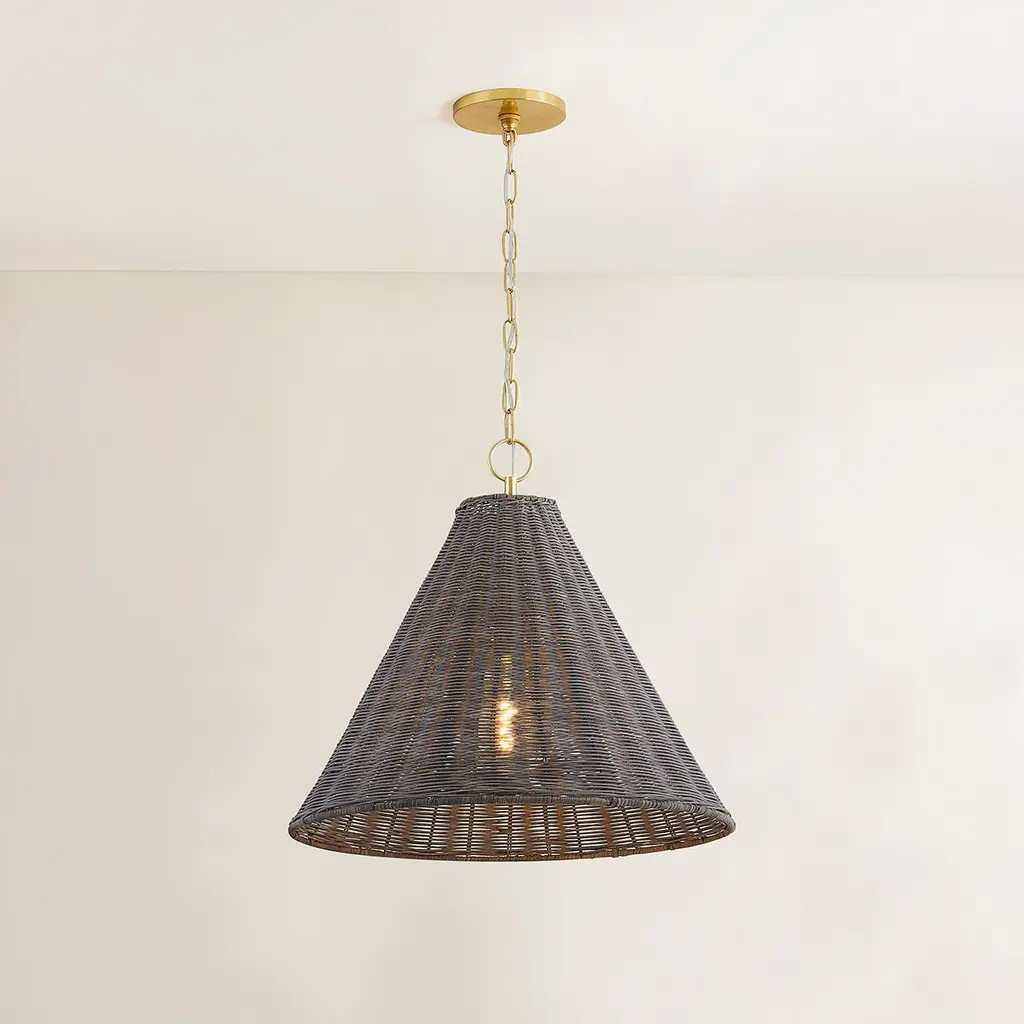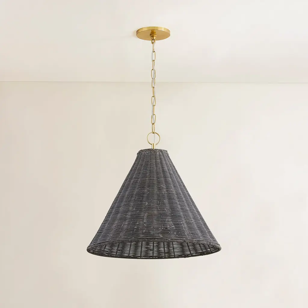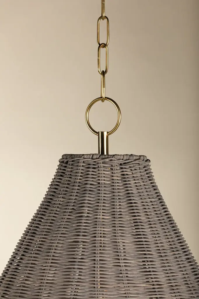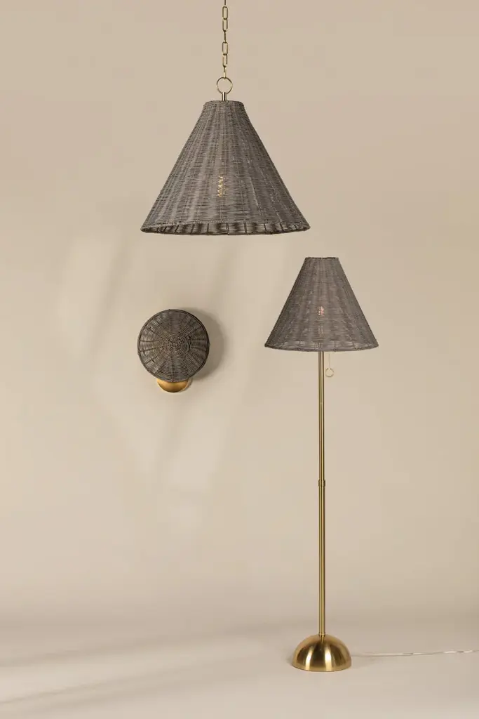 Combining the beauty of natural wicker and polished Aged Brass, this coastal-inspired fixture exudes understated elegance. When illuminated, the golden-hued brass gleams through the gray wicker, creating a warm and earthy glow. Available as a sconce, pendant, or floor lamp. Part of THELIFESTYLEDCO® collection. *Due to the one-of-a-kind nature of the medium, exact colors and patterns may vary slightly from the image shown.