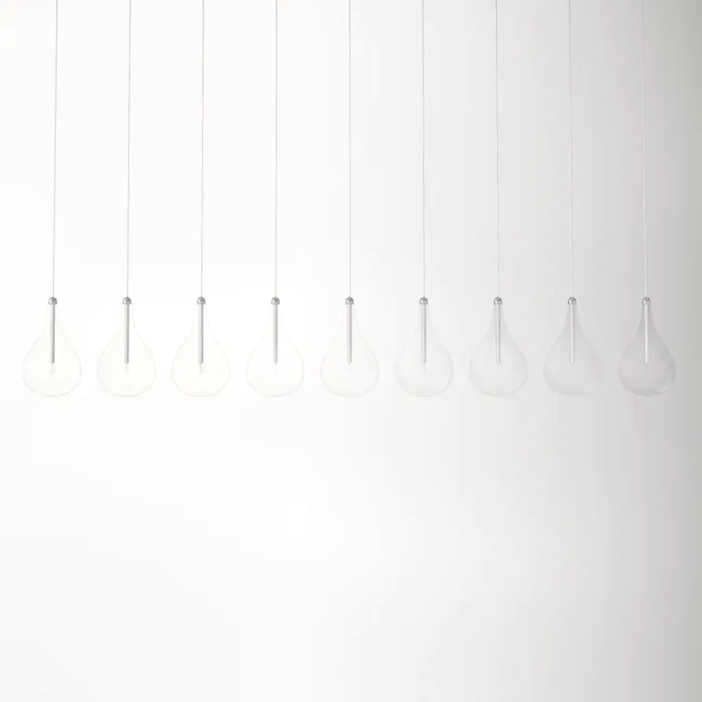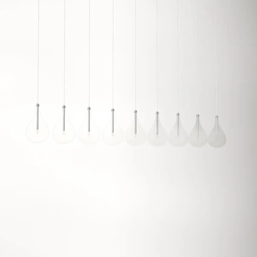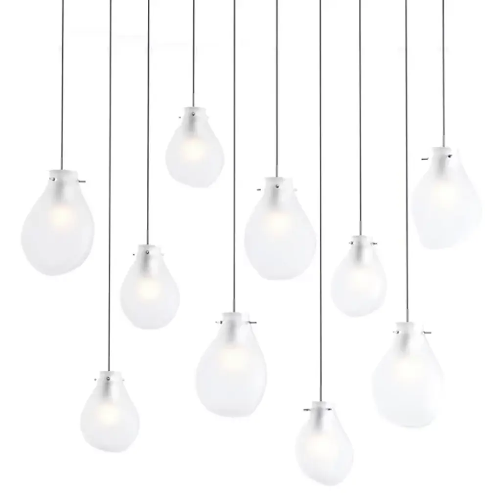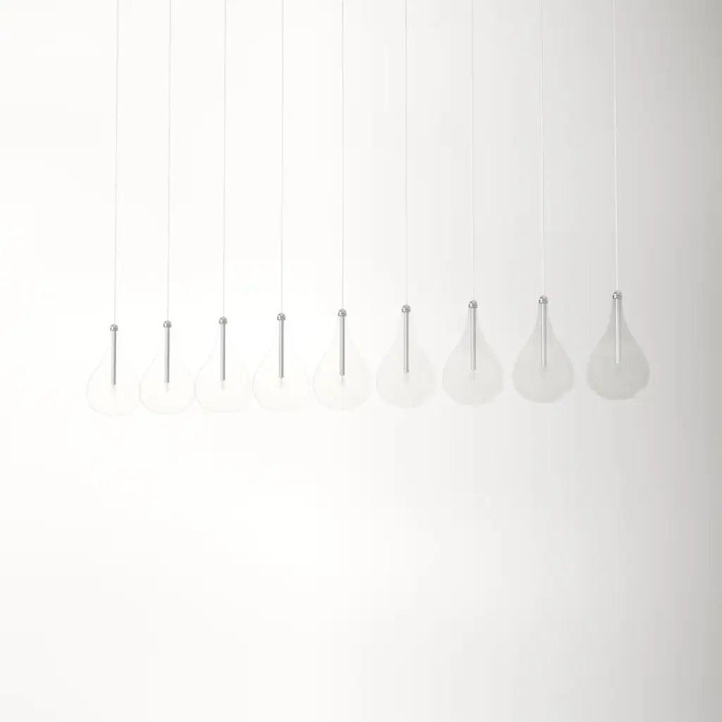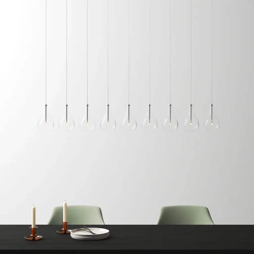 A splash of brightness. The nine lights of this linear pendant are diffused by teardrop-shaped glass shades, for an elevated twist on bare-bulb simplicity. Crafted from steel with a polished chrome finish, it hangs at an adjustable height + dims to let you set the mood in your space.