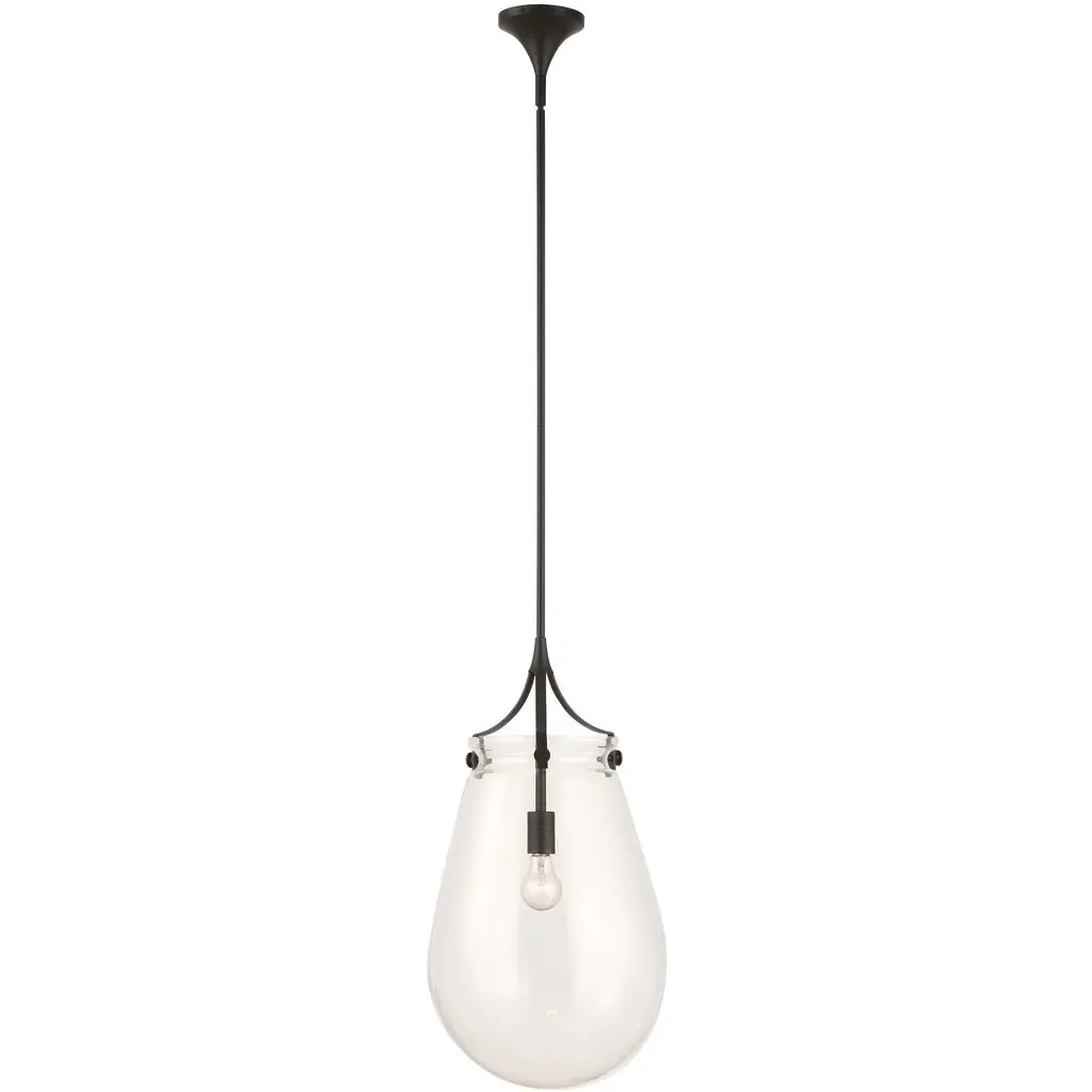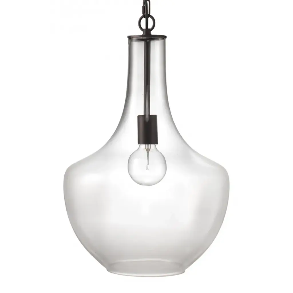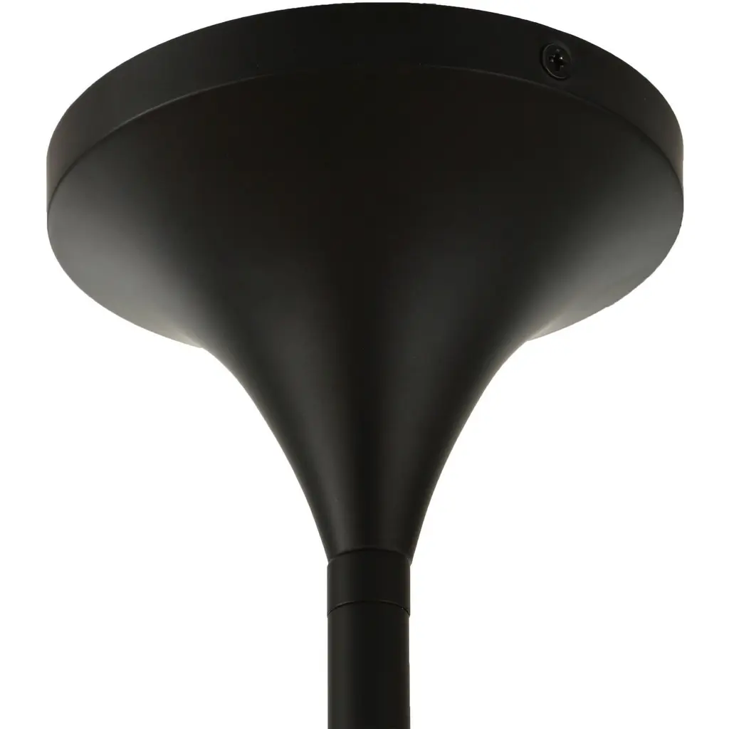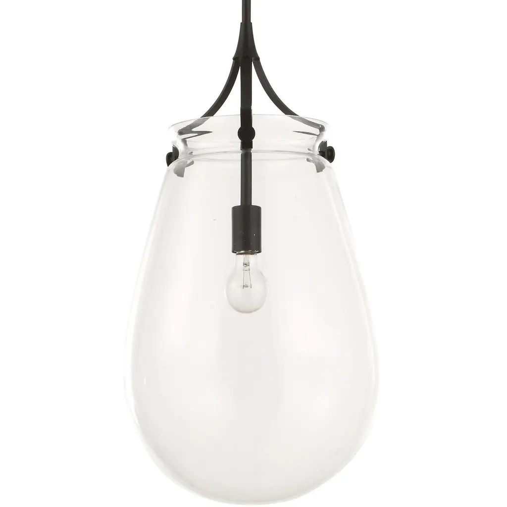 A Floating Oversized Clear Glass Pendant That Features Architectural Cone Draped Arms And Accents In A Rich Matte Black Finish. 1-60 Watt Max Edison Socket. Bulbs Not Included. Supplied With 15' Wire, 3-12" Stems And 1-6" Stem For Adjustable Installation.