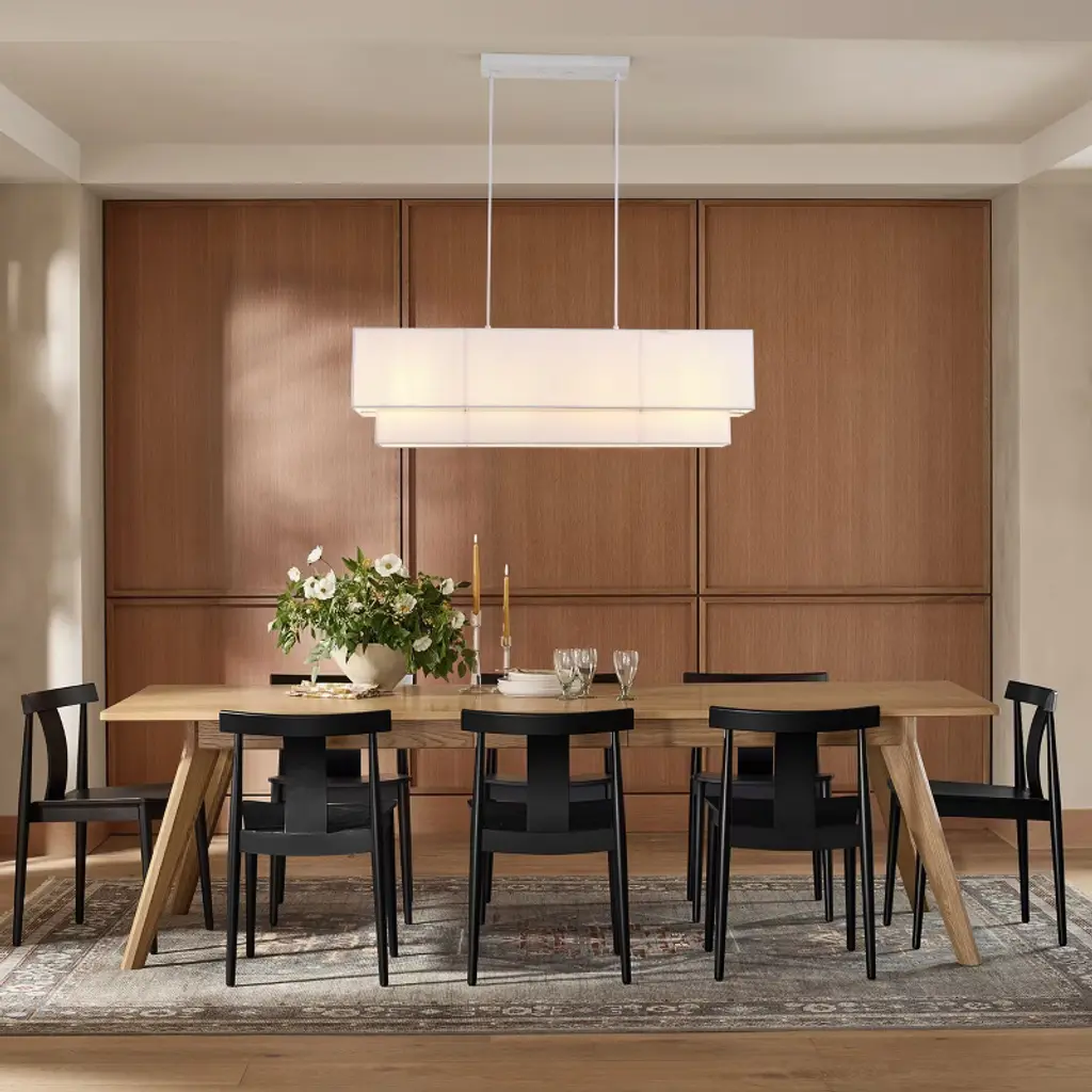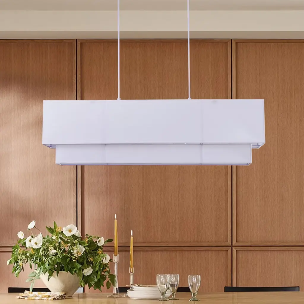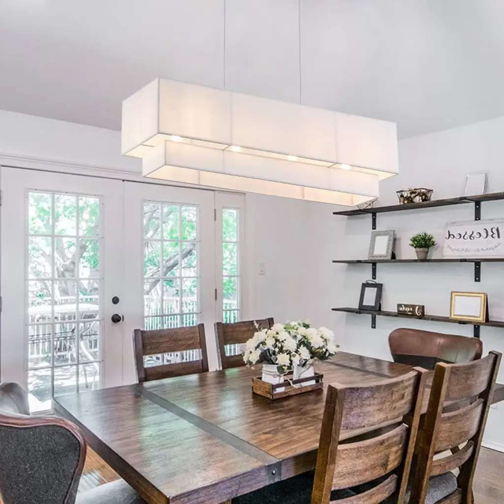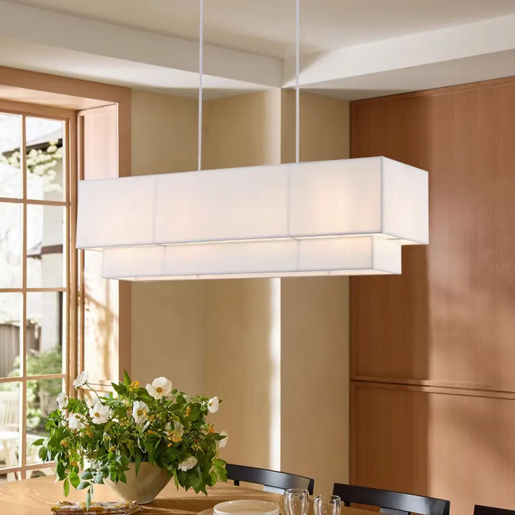 Bring a touch of modern elegance to your home with this rectangular 4-light pendant. Featuring an iron frame with matte white painted finish and a layered off-white fabric shade, it delivers a soft, ambient glow that complements any d¨¦cor. The fixture uses four E26 bulbs (120V, max 12W each) and is ETL certified for safety. With its adjustable suspension and durable SVT three-core wiring, this pendant light is ideal for kitchens, dining rooms, or living areas, adding both style and reliable illumination.