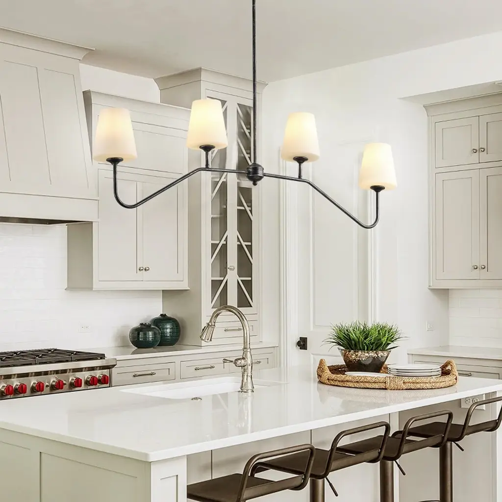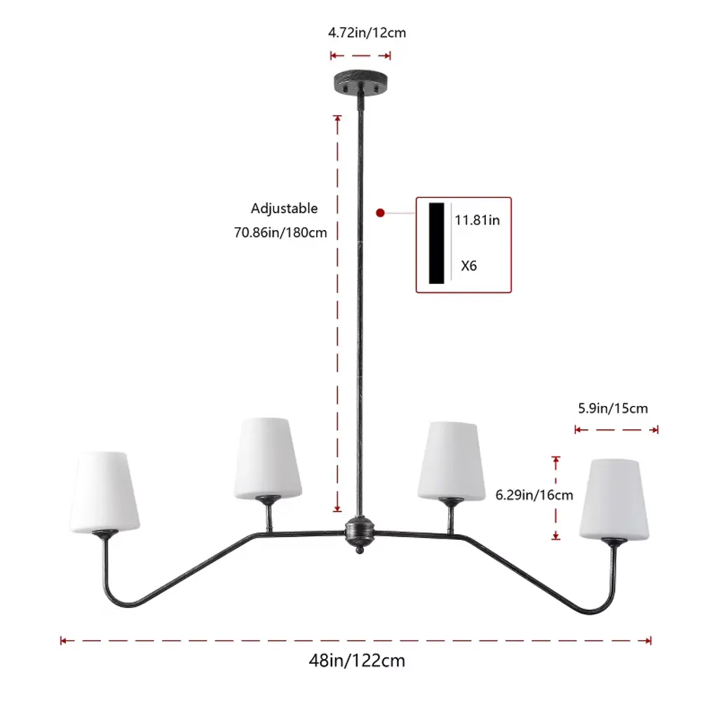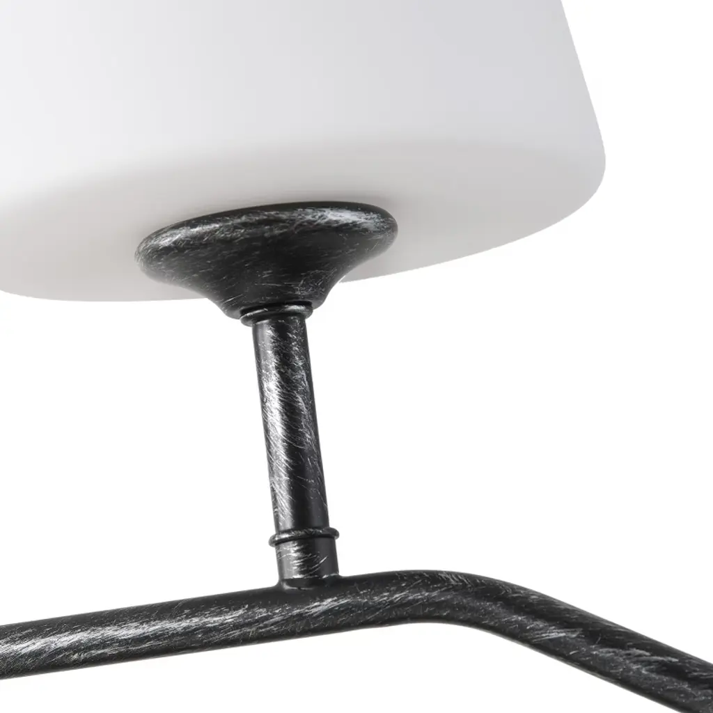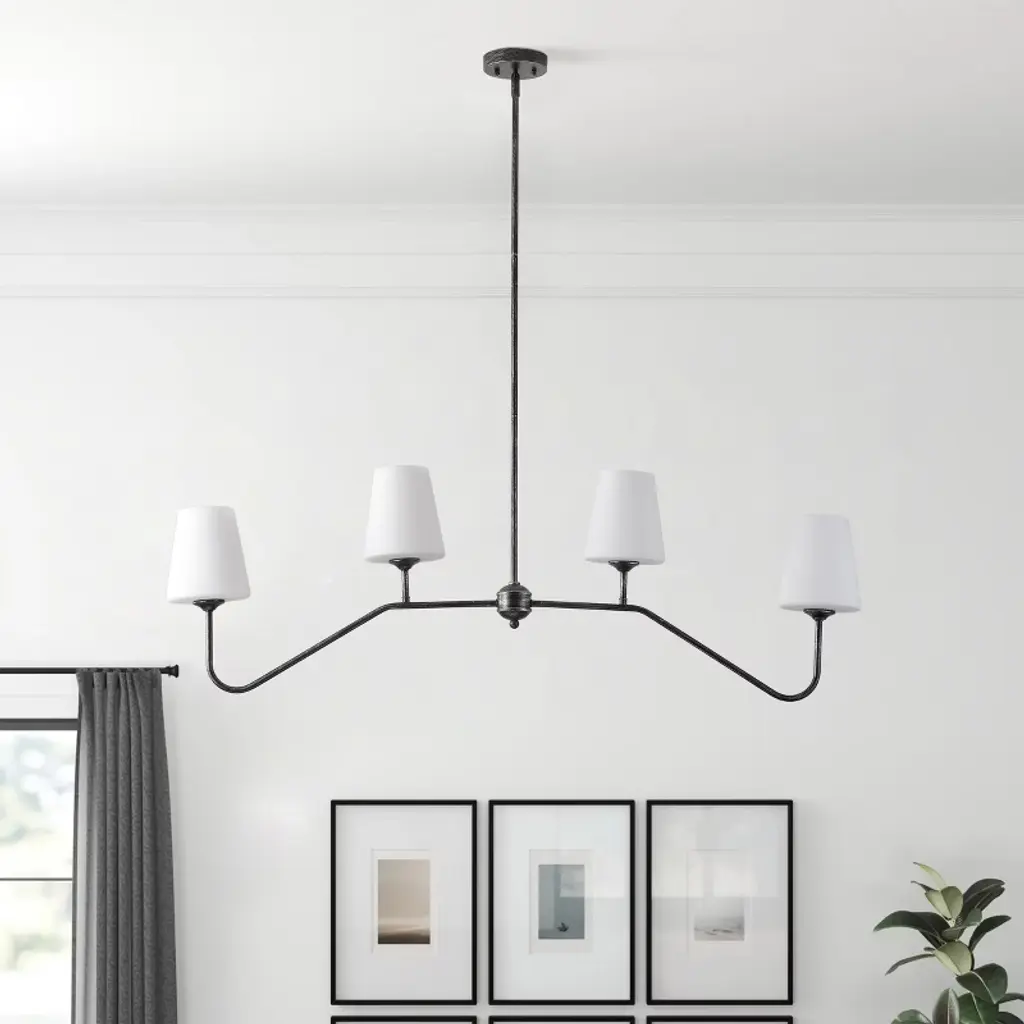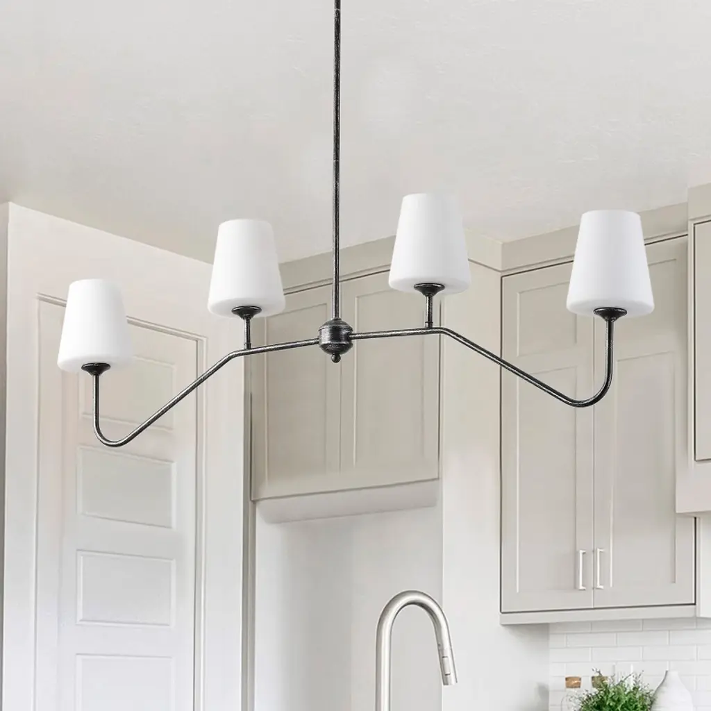 Bring a touch of vintage elegance to your home with the Dewdrop 4-Light Chandelier. Designed with a black brushed silver iron frame and four milk-white glass shades, this fixture blends rustic farmhouse charm with modern appeal. Equipped with four E26 sockets (60W max each, 120V), it works with LED, incandescent, or CFL bulbs to meet your lighting needs. ETL certified for safety and built to last, this chandelier is perfect for dining rooms, kitchens, bedrooms, or living spaces. Adjustable height and easy installation make it a versatile choice for any home decor.