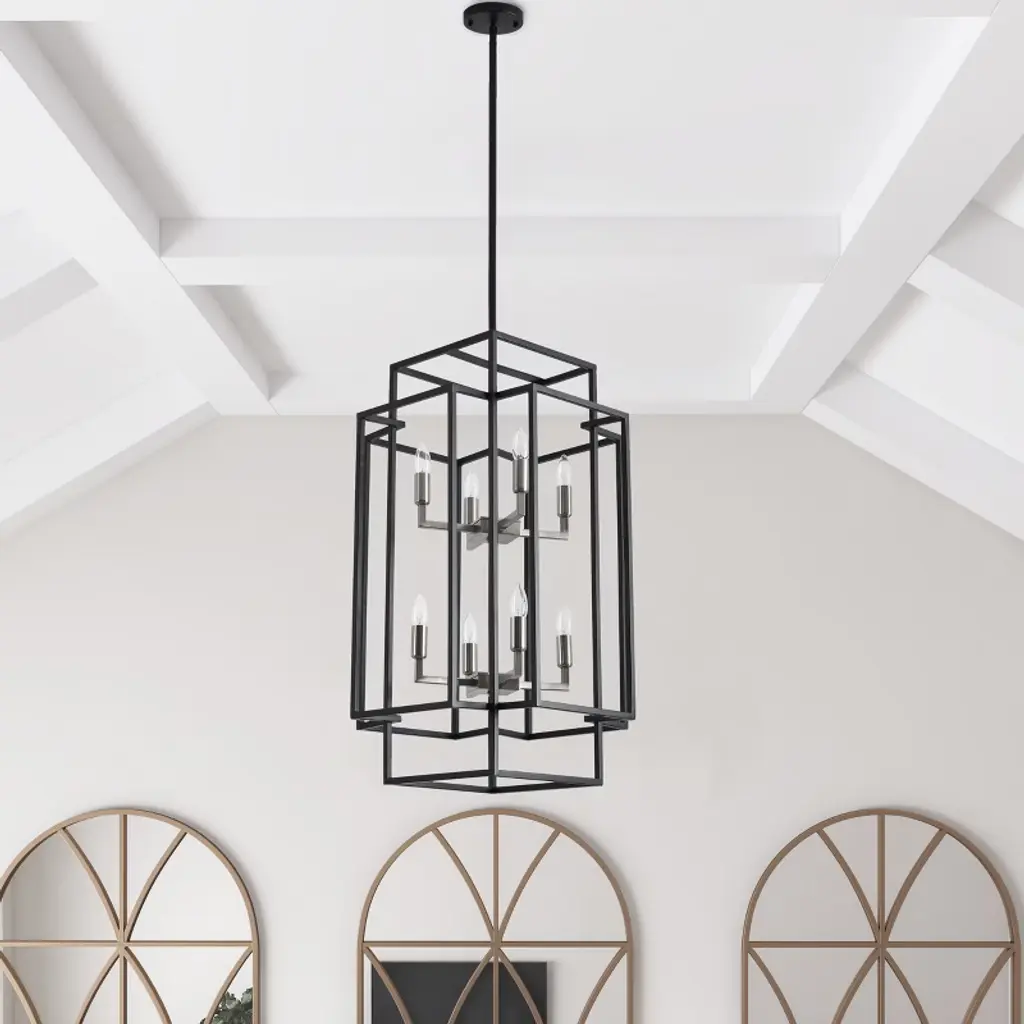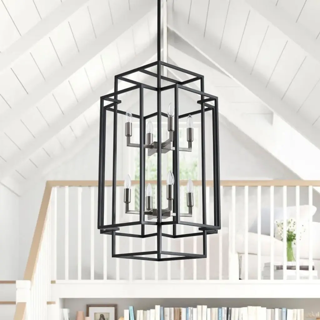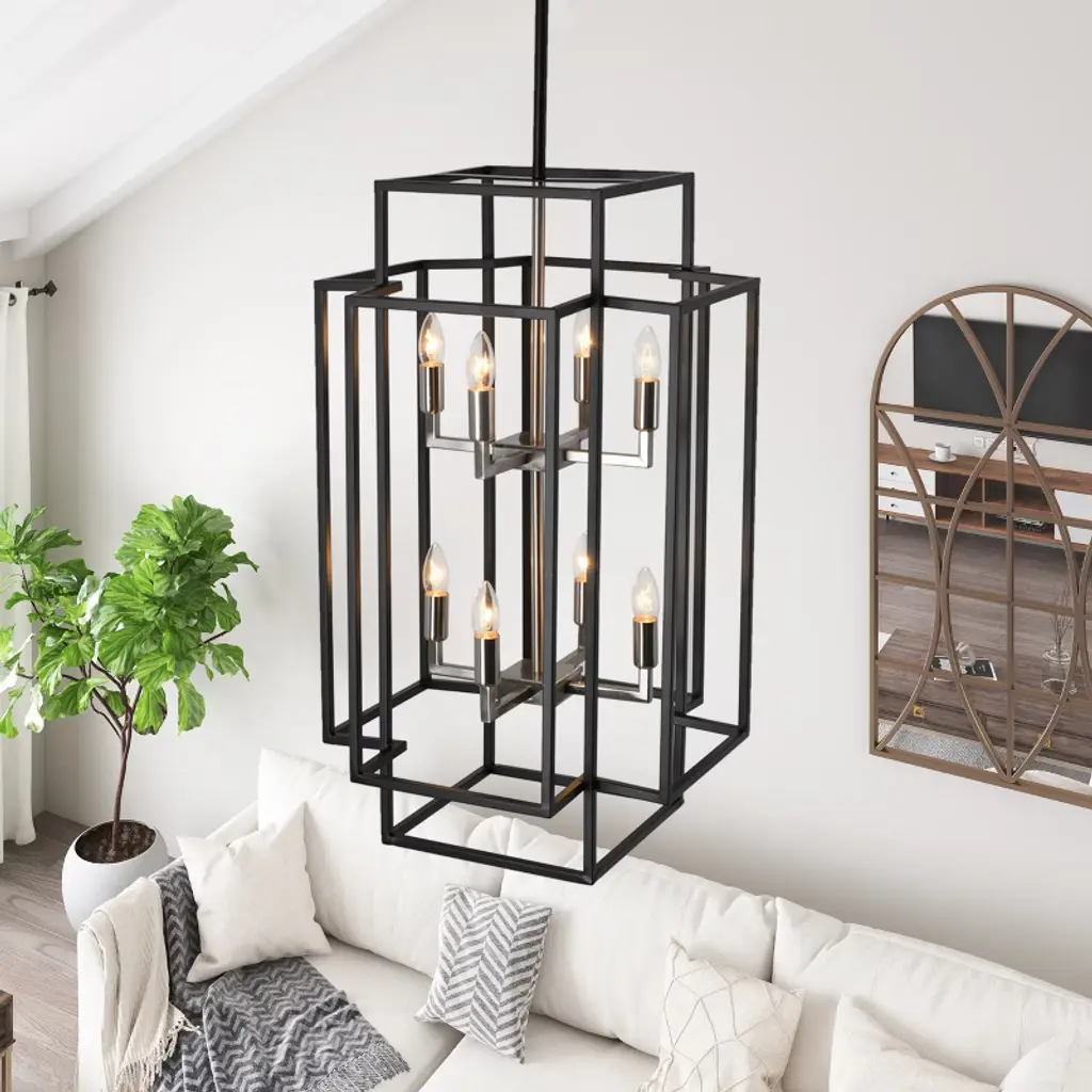 Specifications : Type: Industrial Pendant LightMaterials: Iron Finish: Painted Color: Black, NickelNumber of Lights: 8 Light Wattage: 12W Voltage: 110V Base: E12 (bulbs not included)Dimensions: 11.81 in. W x 18.11 in. D x 31.5 in. H Chain/Cord/Rod Length: 6*11.81" (can be adjusted) Adjustable or Not: Yes Features: Industrial Material and Design: Dressed in a black body finish, with brass candlelight inside, the rectangle design pendant light is crafted into the iron frame, creating a classic modern style. Quality Assurance: High-quality iron craft with painted finish. All products in the factory have to undergo rigorous safety monitoring, to ensure quality and safety. Easy to Install: With our installation guidelines, you can assemble the chandelier in less time. Installation instructions, mounting hardware, and any other parts are included in the package. Variety of Choices: Provide the most abundant categories of lighting products, to meet your needs. Our main products include LED Chandeliers, Pendant lights, Flush mount lights, Crystal Ceiling lamps, and island lights. Versatile Applications: The industrial pendant light is designed to blend into any decor, such as bedrooms, kitchens, farmhouses, living rooms, dining rooms, and many more commercial or residential applications.