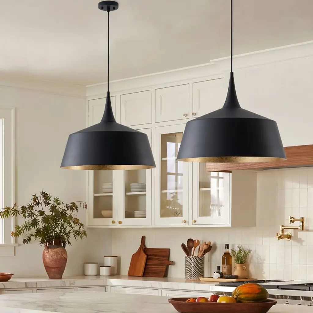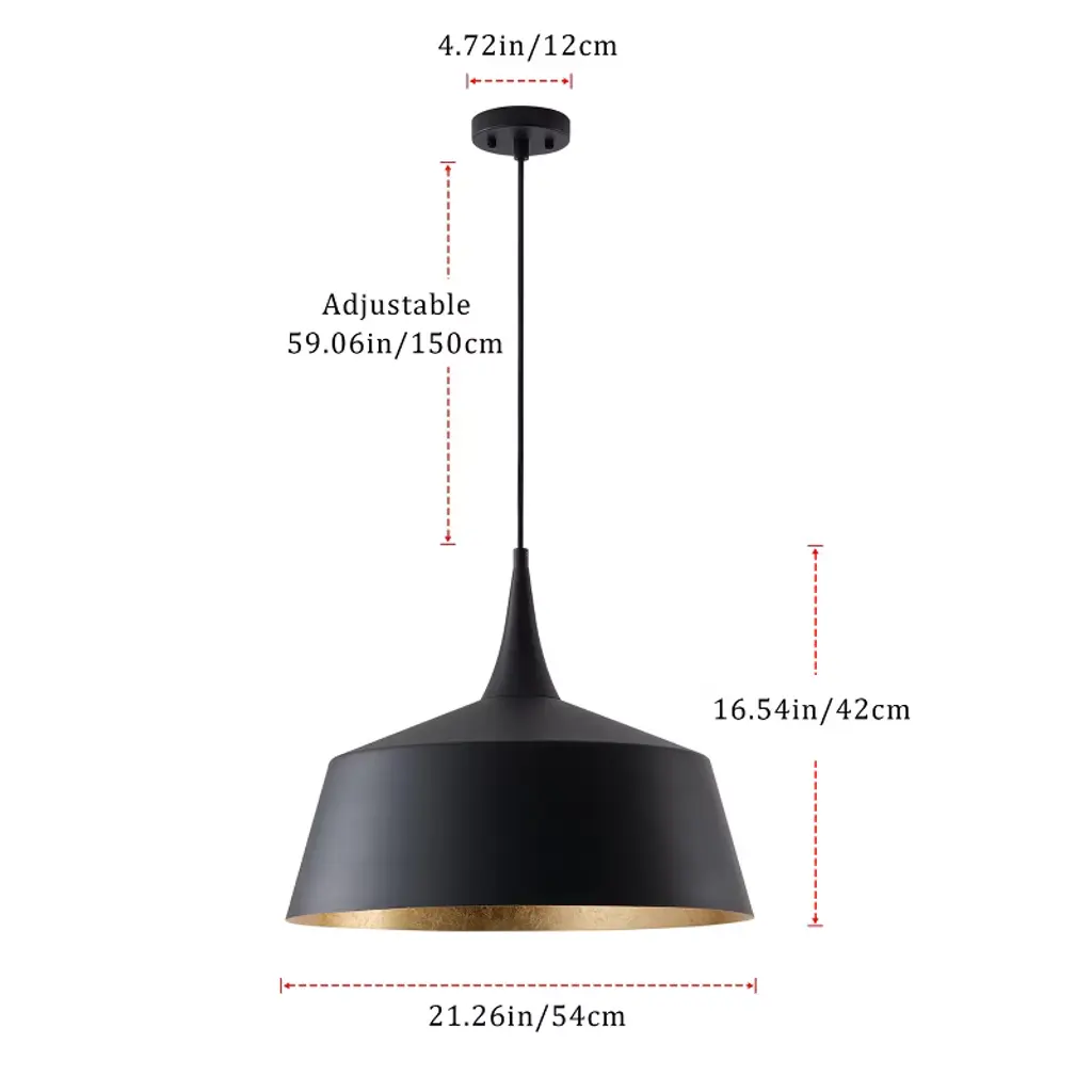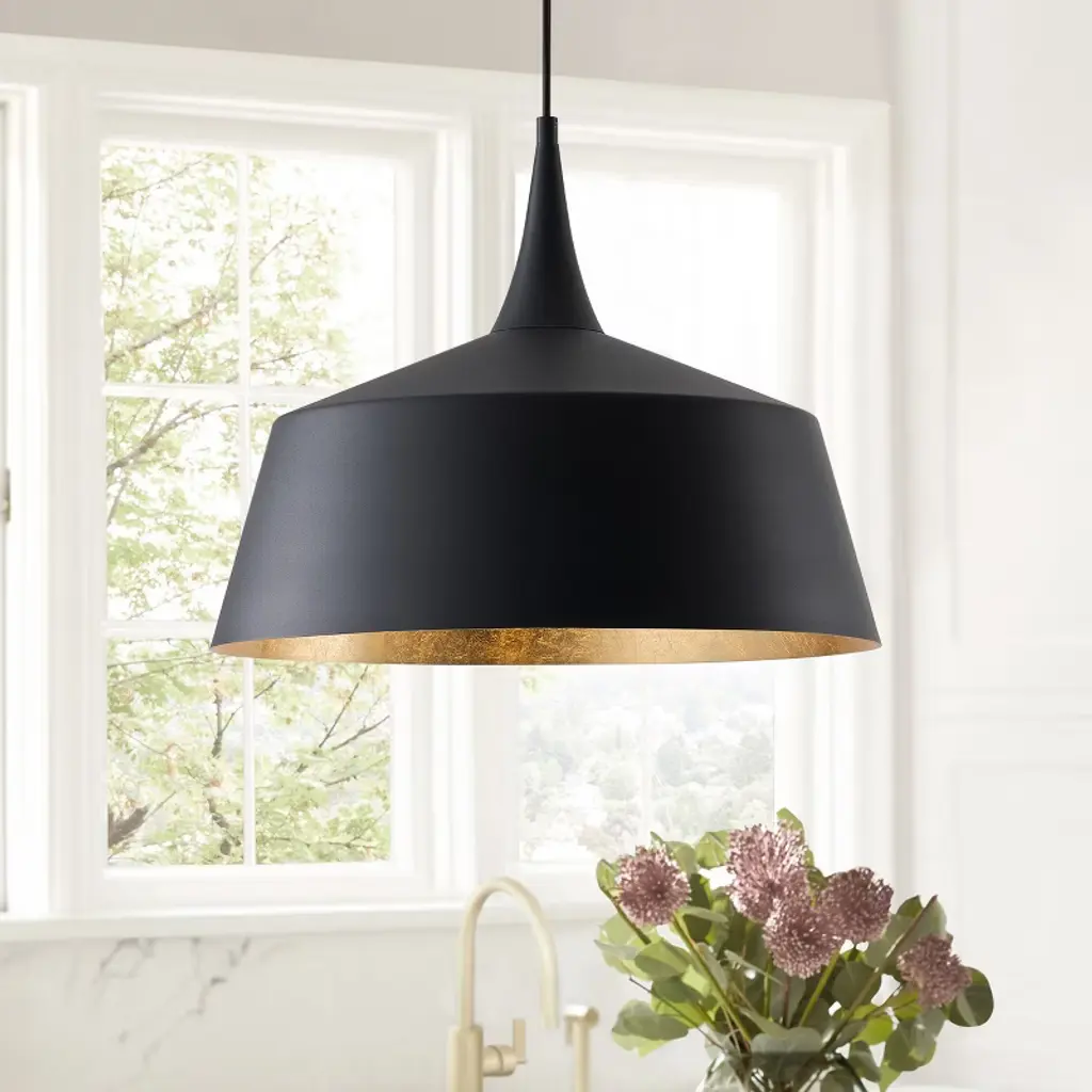 The Dewdrop 1-Light Dome Pendant Light combines bold industrial style with modern elegance. Crafted from durable iron in a sand black finish, the shade features a gold foil interior that reflects light beautifully for a warm, inviting atmosphere. Measuring 21.26" wide, this pendant is ideal for kitchen islands, dining rooms, or living areas. With a standard E26 socket (120V, max 100W), it works with various bulbs for flexible brightness. Backed by ETL certification and built with high-quality 18AWG Teflon wiring, this pendant offers both safety and lasting durability, making it a standout centerpiece for your home.