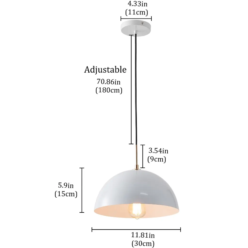 Specifications: Type: Modern Industrial Pendant Light Materials: IronFinish: Painted Color: WhiteNumber of Light Sources: 1 Light Wattage: 60W Voltage: 110V Base: E26 (bulbs not included)Dimensions: 11.81 in. W x 11.81 in. D x 5.9 in. HChain/Cord/Rod Length: 70.86"" Chain/Cord/RodAdjustable or Not: Yes Features: Modern Modern Design: The contemporary and classic elements allow this grey or white pendant light to blend with various styles. Bright and clean design with soft lighting demonstrates the nobility. Quality Assurance: High-quality iron craft with painted finish. All products in demonstrates the factory have to undergo rigorous safety monitoring, to ensure quality and safety. Easy Assembly: Our single bowl pendant light fixture includes all mounting hardware a step by step instructions in the package for easy and quick installation. Variety of Choices: Provide the most abundant categories of lighting products, to meet your needs. Our main products include LED Chandeliers, Pendant lights, Flush mount lights, Crystal Ceiling lamps, and island lights. Application: The single bowl pendant light is ideal for suspending over kitchen islands, dining rooms, living rooms, lofts, cafes, bars, clubs, restaurants, libraries, and so on.