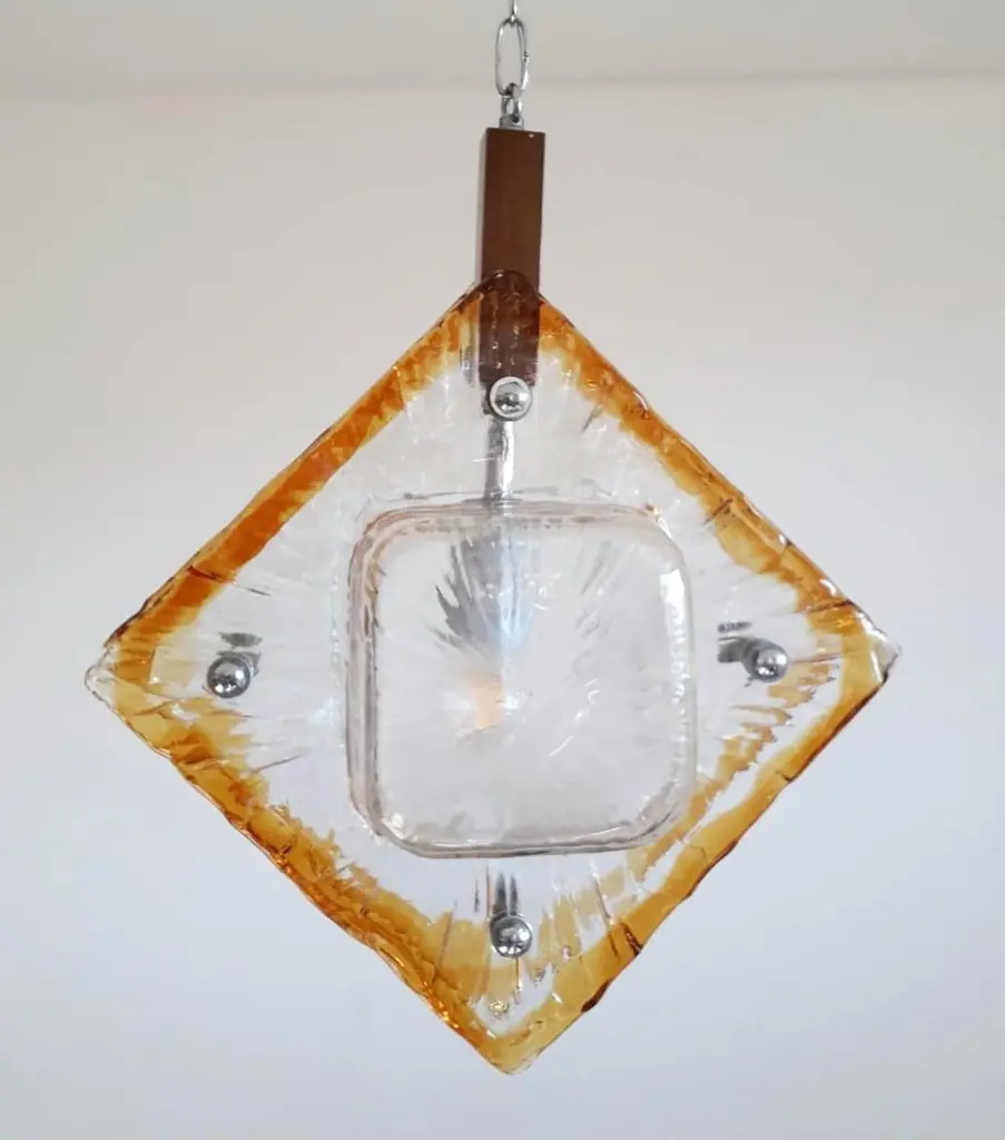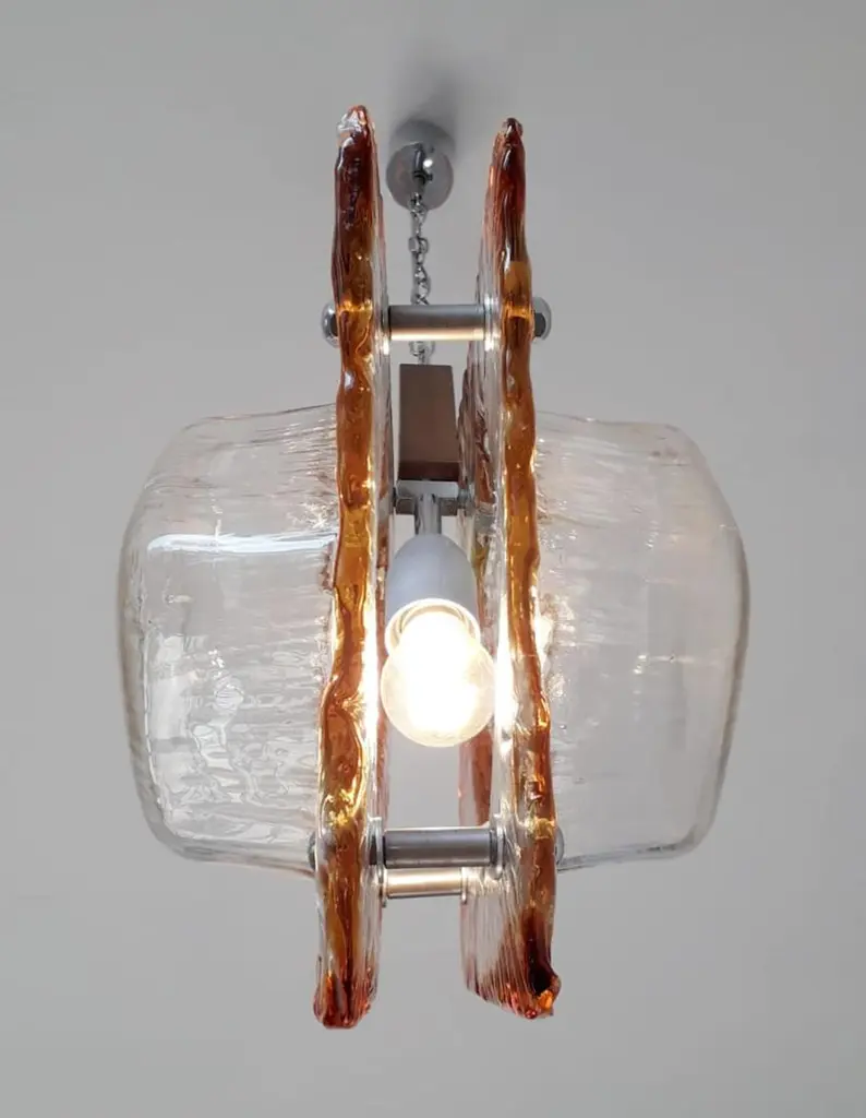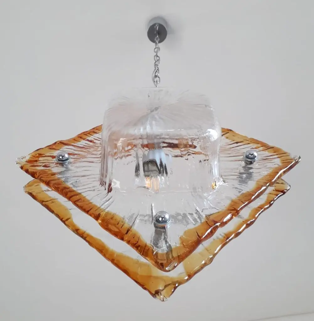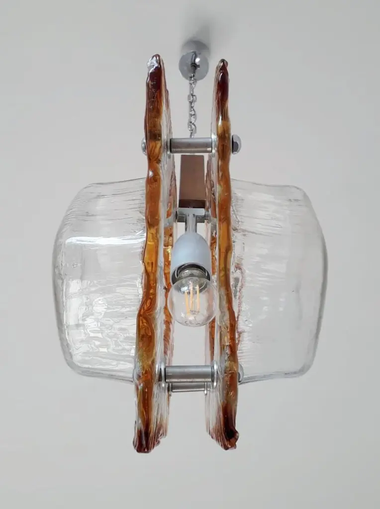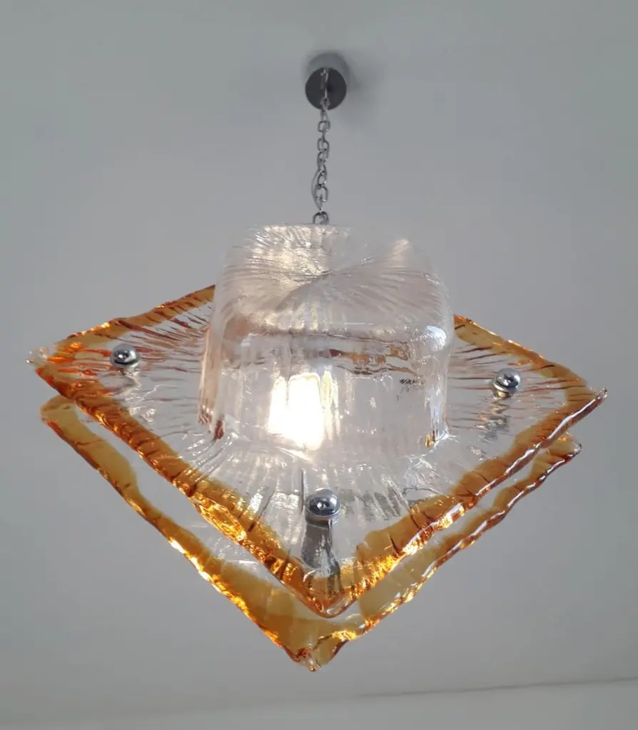 Vintage Italian chandeliers or pendants with double clear and amber Murano glass diffusers enclosing a single light bulb at the center / Made in Italy by Mazzega, circa 1960s.Measures: diameter 10 inches, pendant height 22 inches, total height 39.5 inches including chain and canopy1 light / E26 or E27 type / max 60W2 available in stock in Italy, price is for each itemOrder reference #: FABIOLTD C712