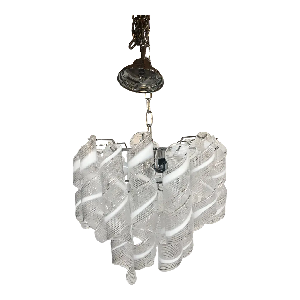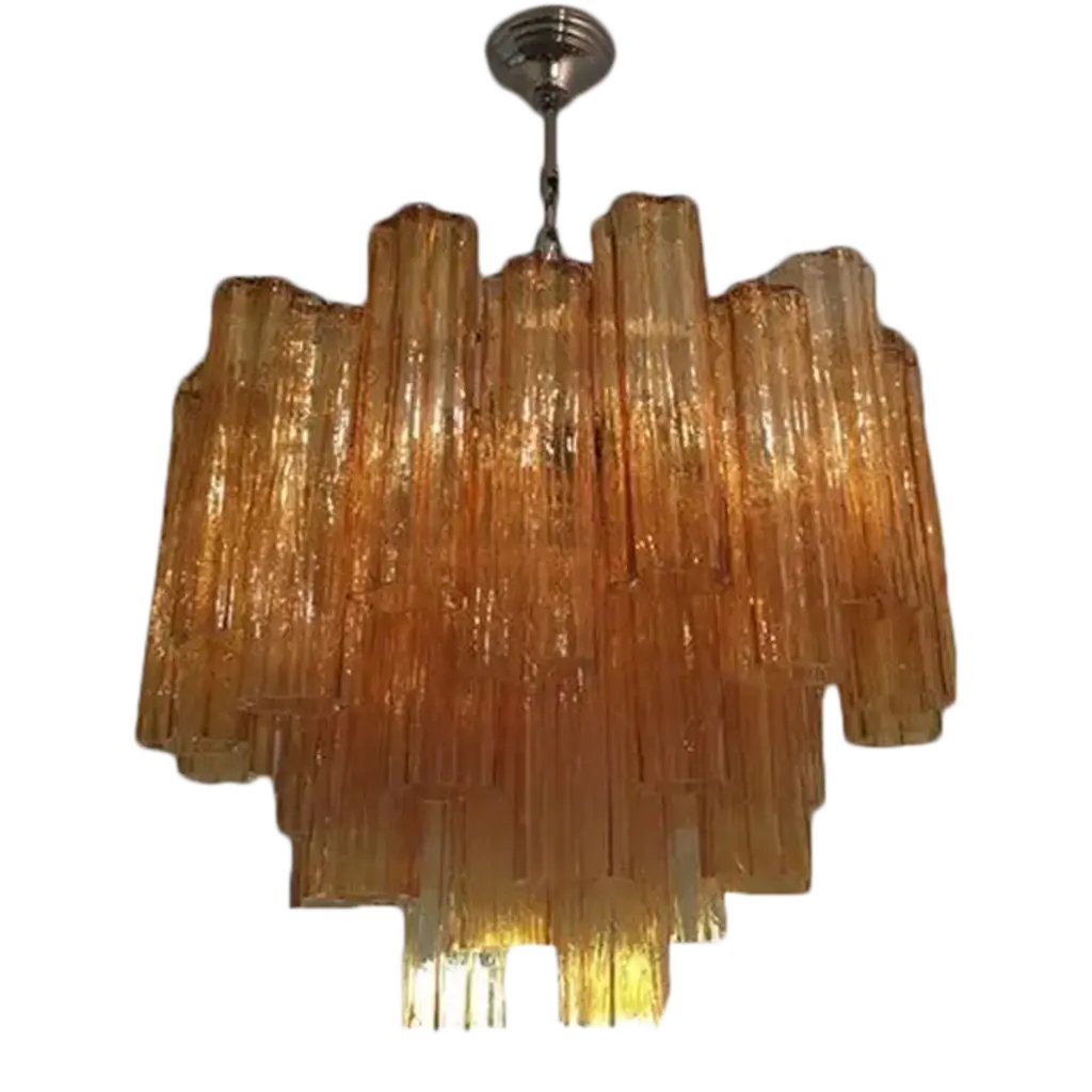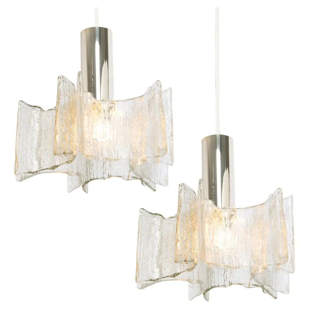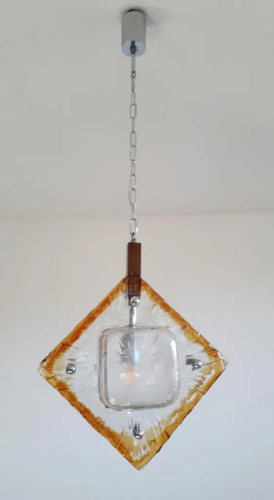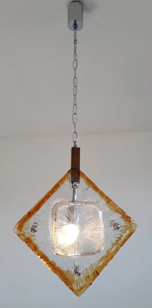 Vintage Italian chandeliers or pendants with double clear and amber Murano glass diffusers enclosing a single light bulb at the center / Made in Italy by Mazzega, circa 1960s.Measures: diameter 10 inches, pendant height 22 inches, total height 39.5 inches including chain and canopy1 light / E26 or E27 type / max 60W2 available in stock in Italy, price is for each itemOrder reference #: FABIOLTD C712