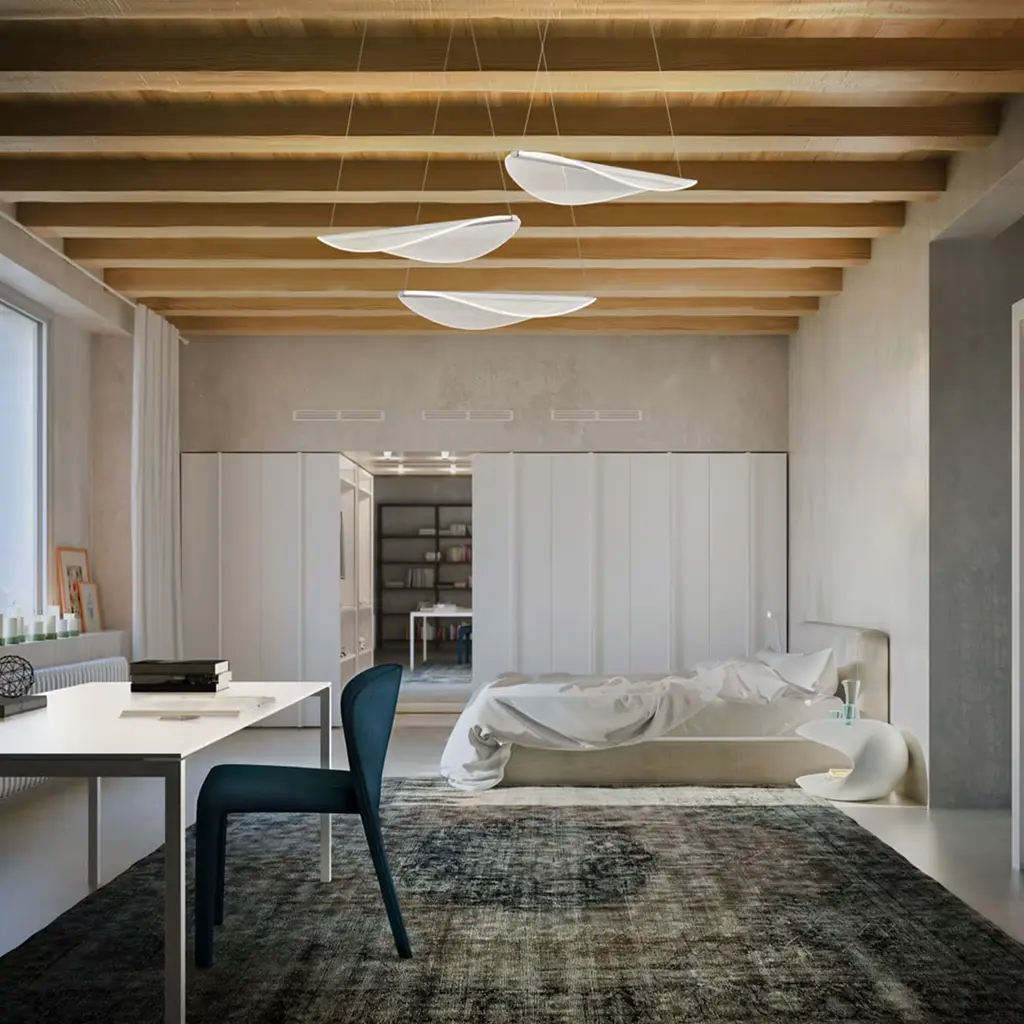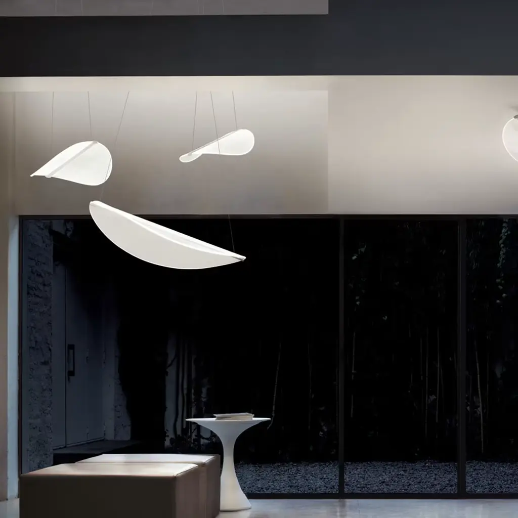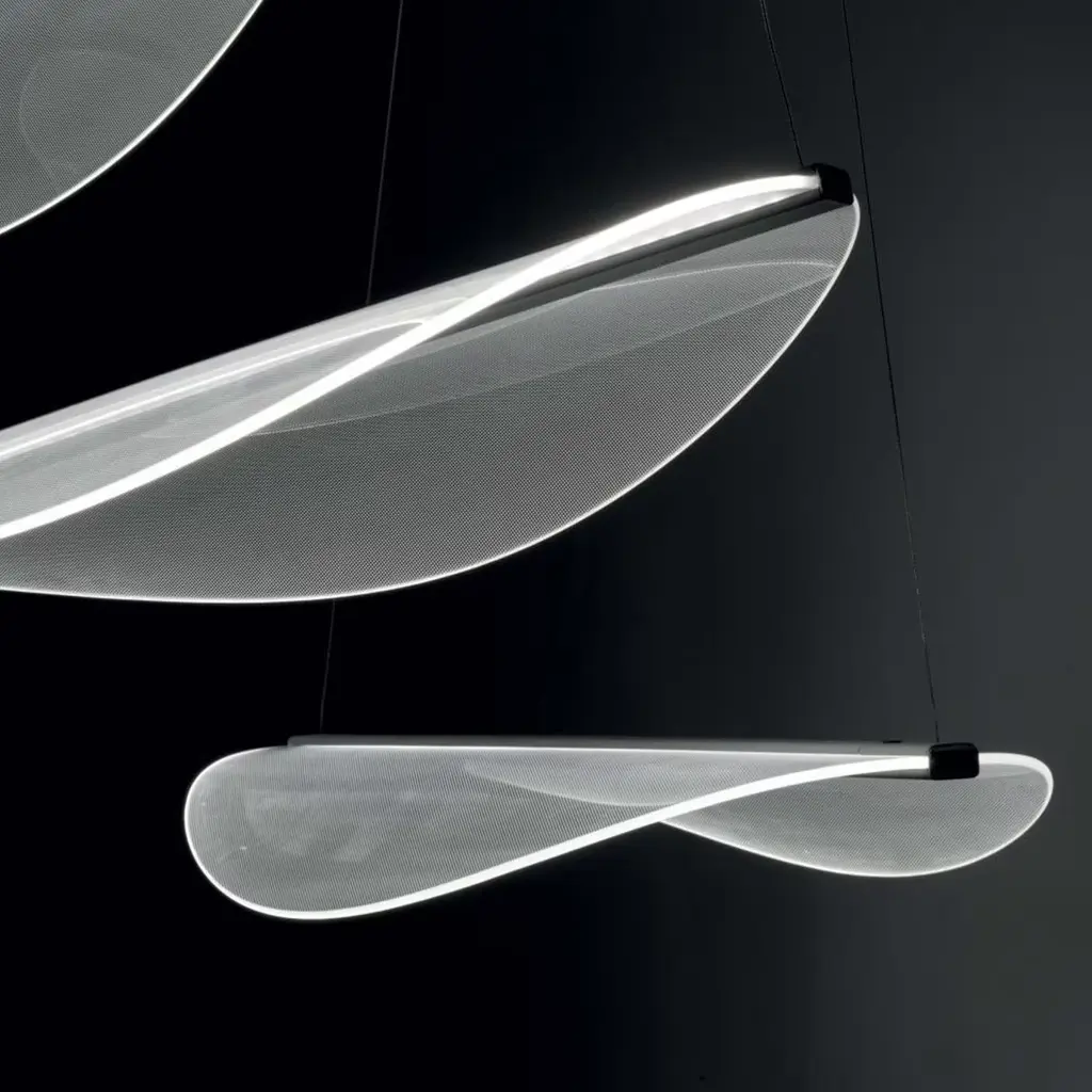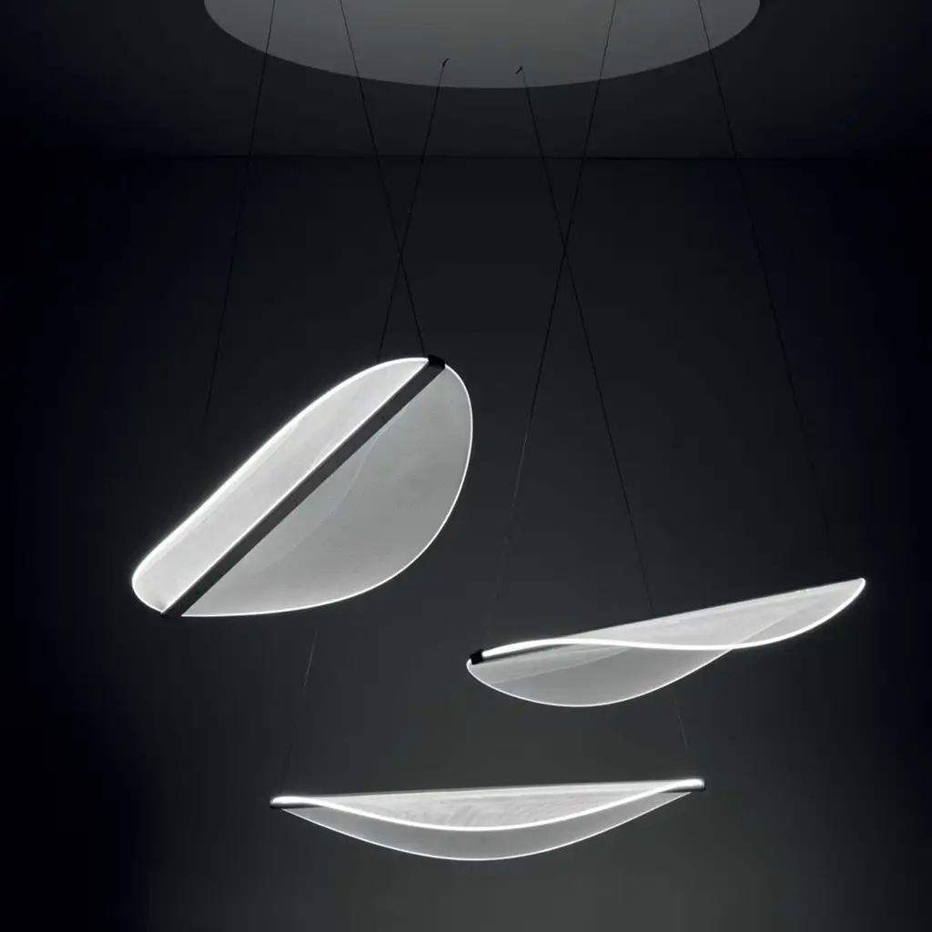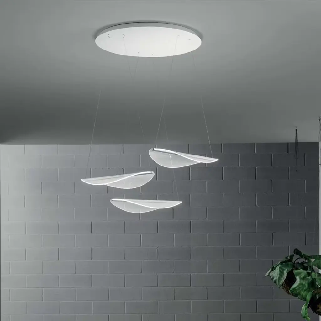Modern pendant chandeliers are composed of three slender hanging leaves. Thanks to OptiLight Technology TM, the diffuser maintains its transparency, while the leaves "fill" with light when the lamp is on a texture of laser micro engravings distributing the emission from the topLED source in the lower floor and upwards. The light source is housed inside a central rod in white-painted aluminum that separates the leaf in half.